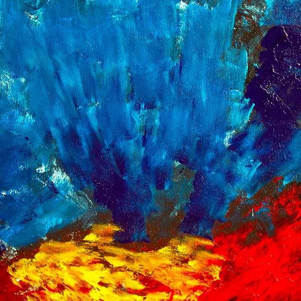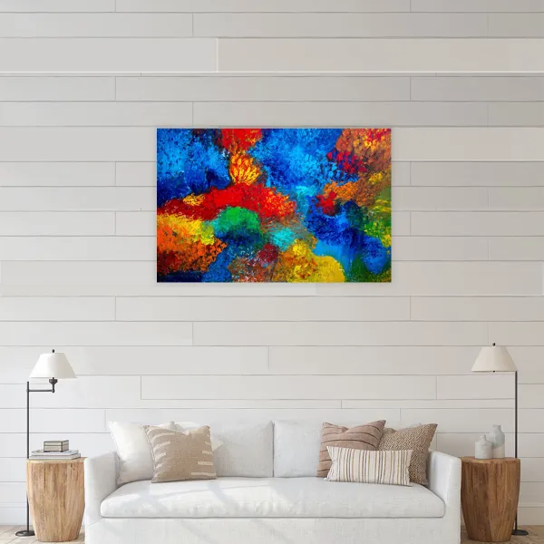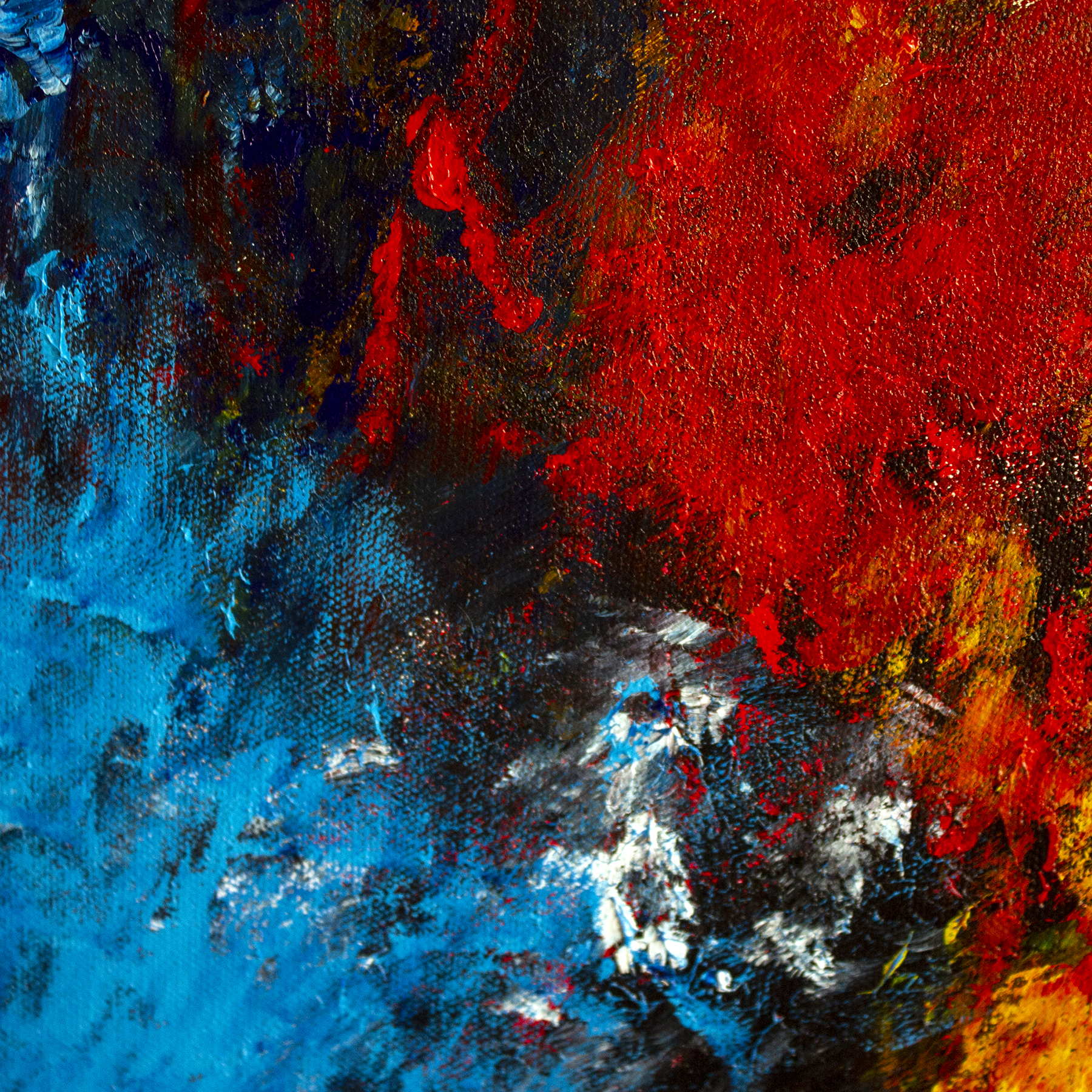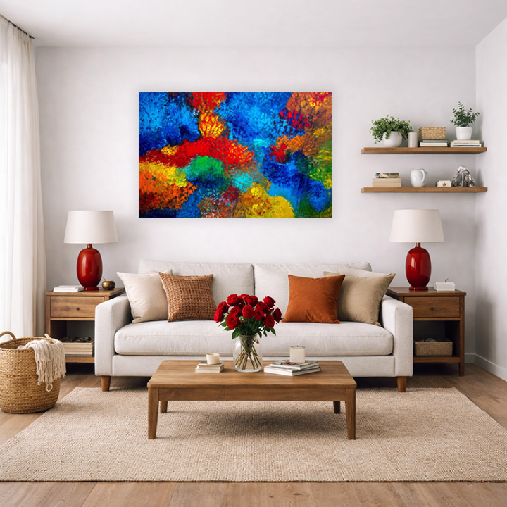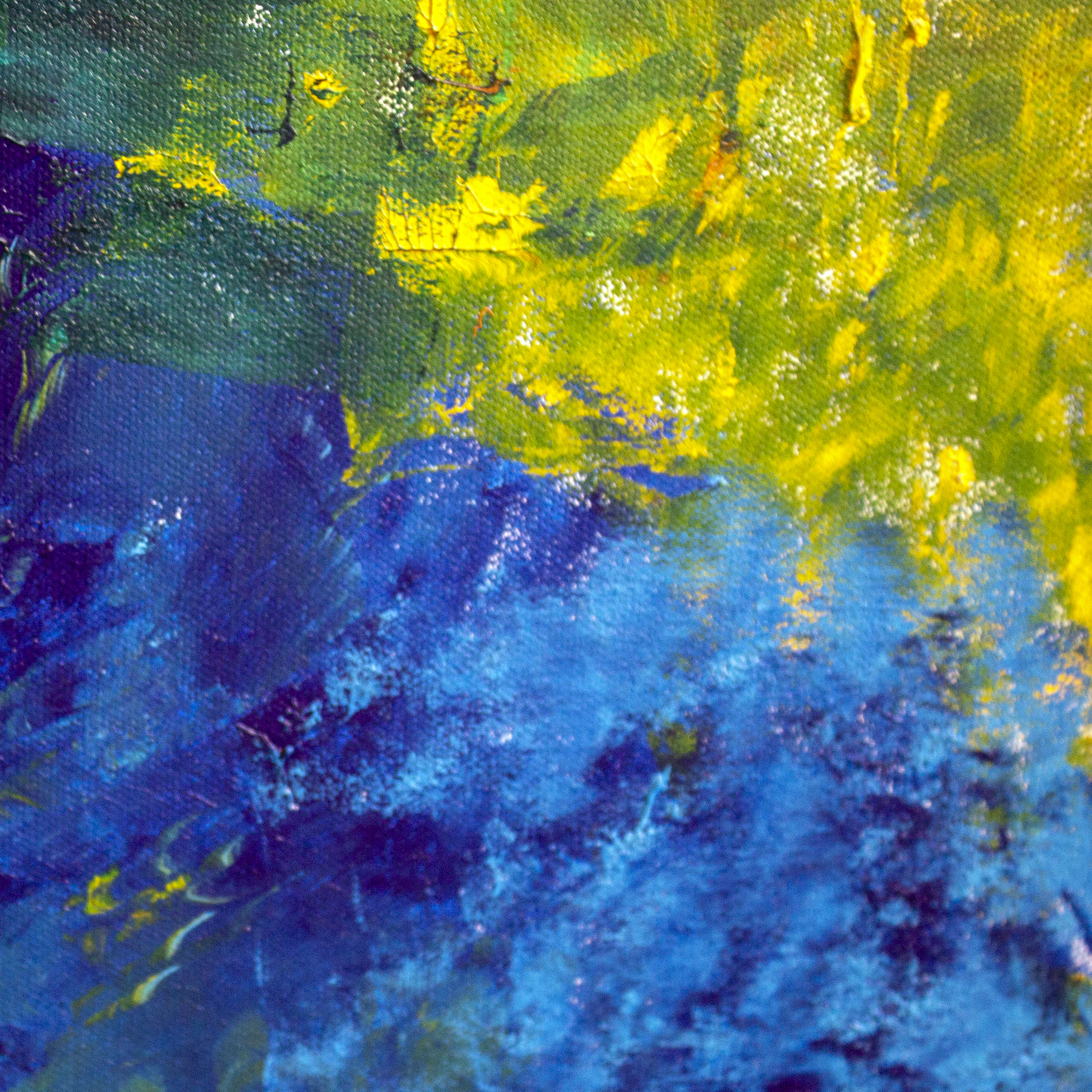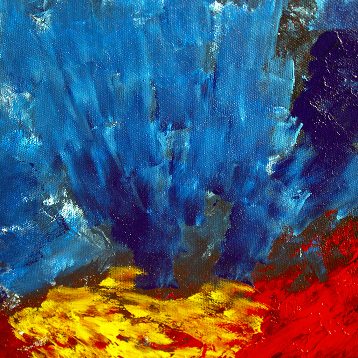 This painting is developed through an instinctive, layered process using dense brushwork and textured applications of acrylic paint. Color is built through successive gestures, allowing vibrant blues, reds, and yellows to collide and intermingle organically. Influenced by Abstract Expressionism and color-field painting, the composition evokes a fertile, emotional landscape where movement, intensity, and balance emerge through rhythm and chromatic energy.