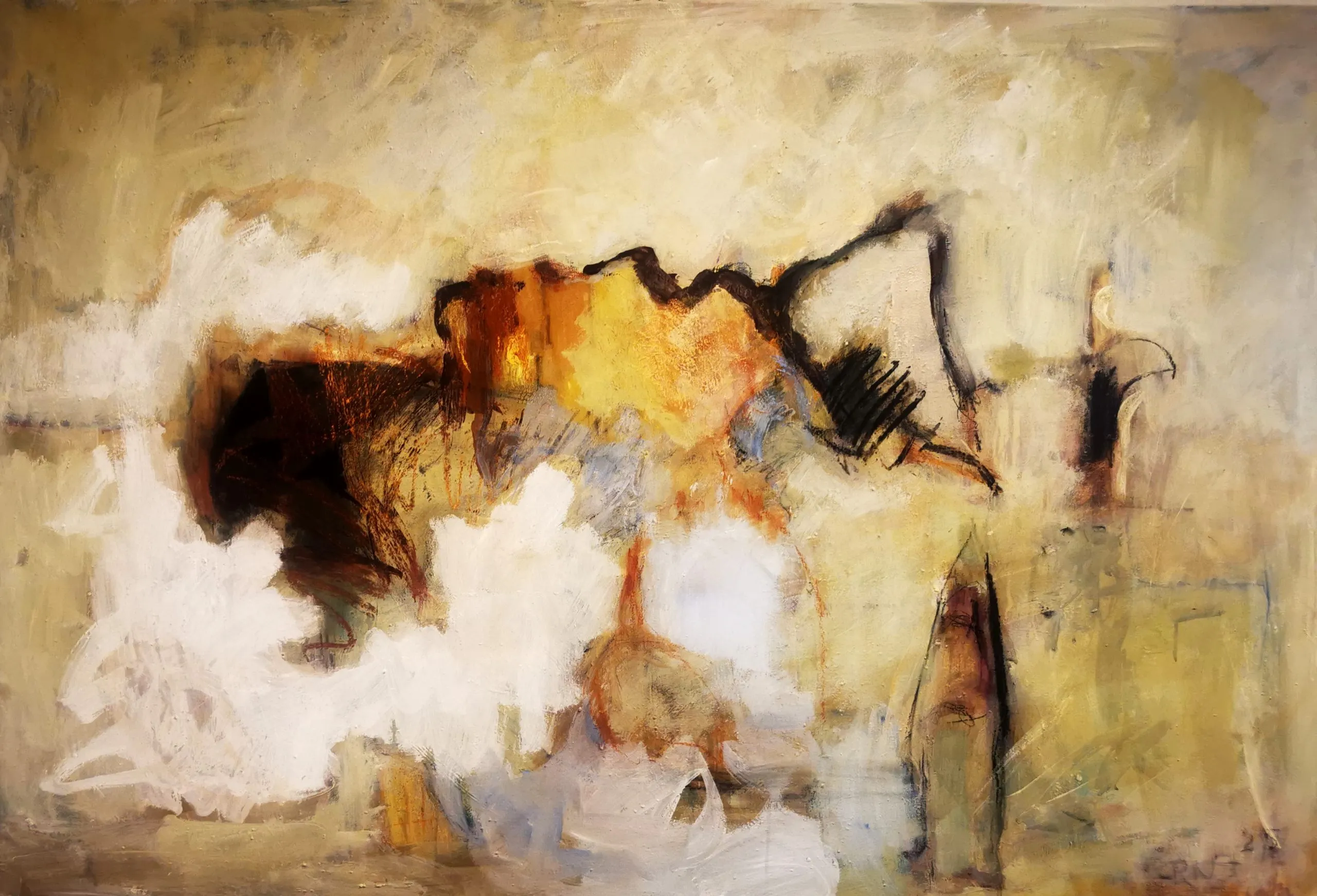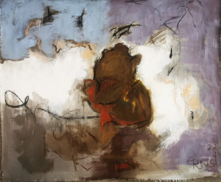 I used pigments mixed with acrylbinder, charcoal and pastells and changed images that emerged during the painting process till each detail fit into the overall composition. I did not have any specific idea in mind. The painting evolved spontaneously and intuitively. At the end it reminded me of a landscape or a lying face allthough I didn't intend to create an image of something. Pure emotions and intense feelings of colour harmonies guided me as I was creating something unexpected.