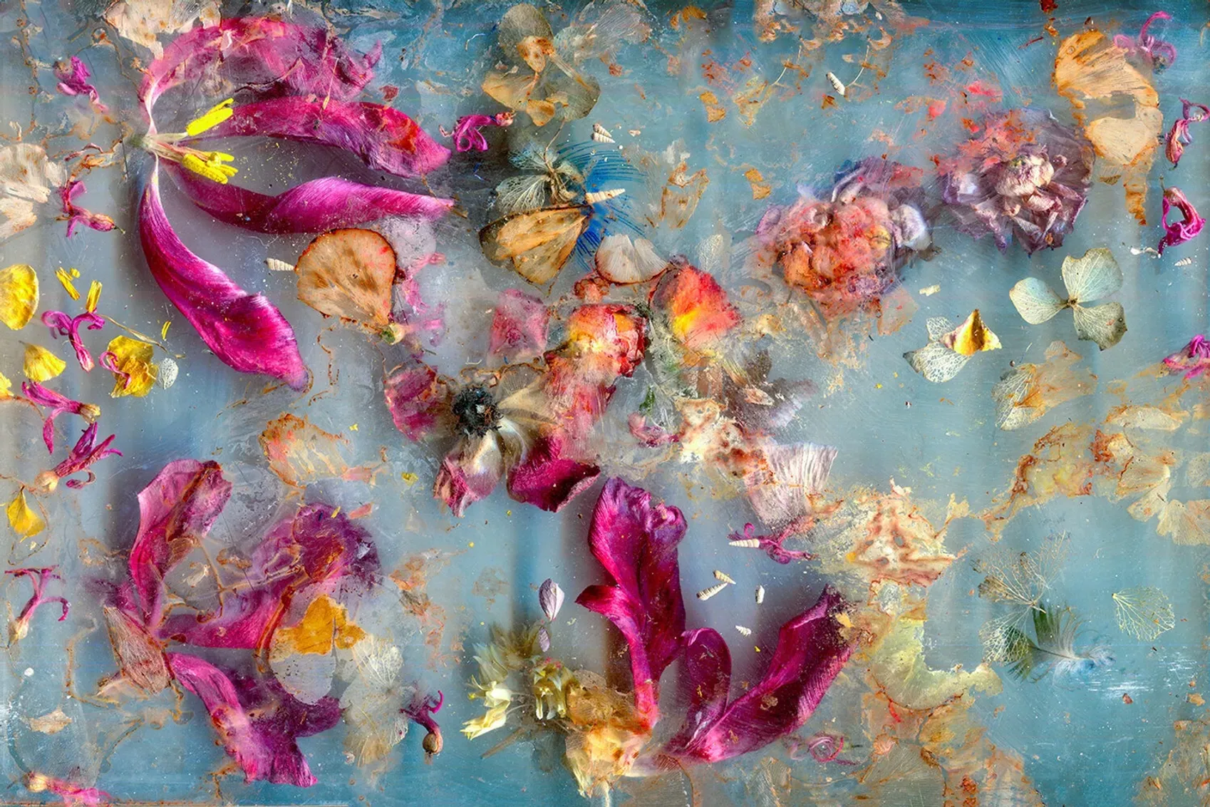 This artwork, created using a high-resolution photo scanner, arranges wilted red tulip blossoms with other floral elements to capture the beauty in transience. Vibrant colors and textures evoke the delicate balance between life and decay, transforming fleeting moments into lasting visual poetry. The frozen blossoms invite contemplation, bringing a dynamic yet serene energy to any space.
