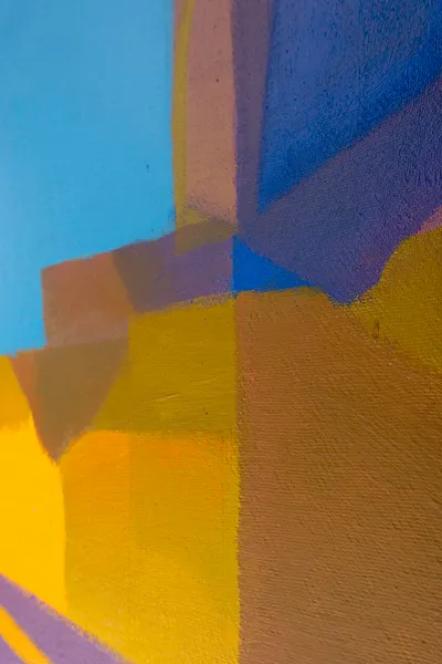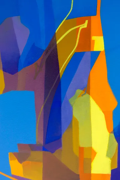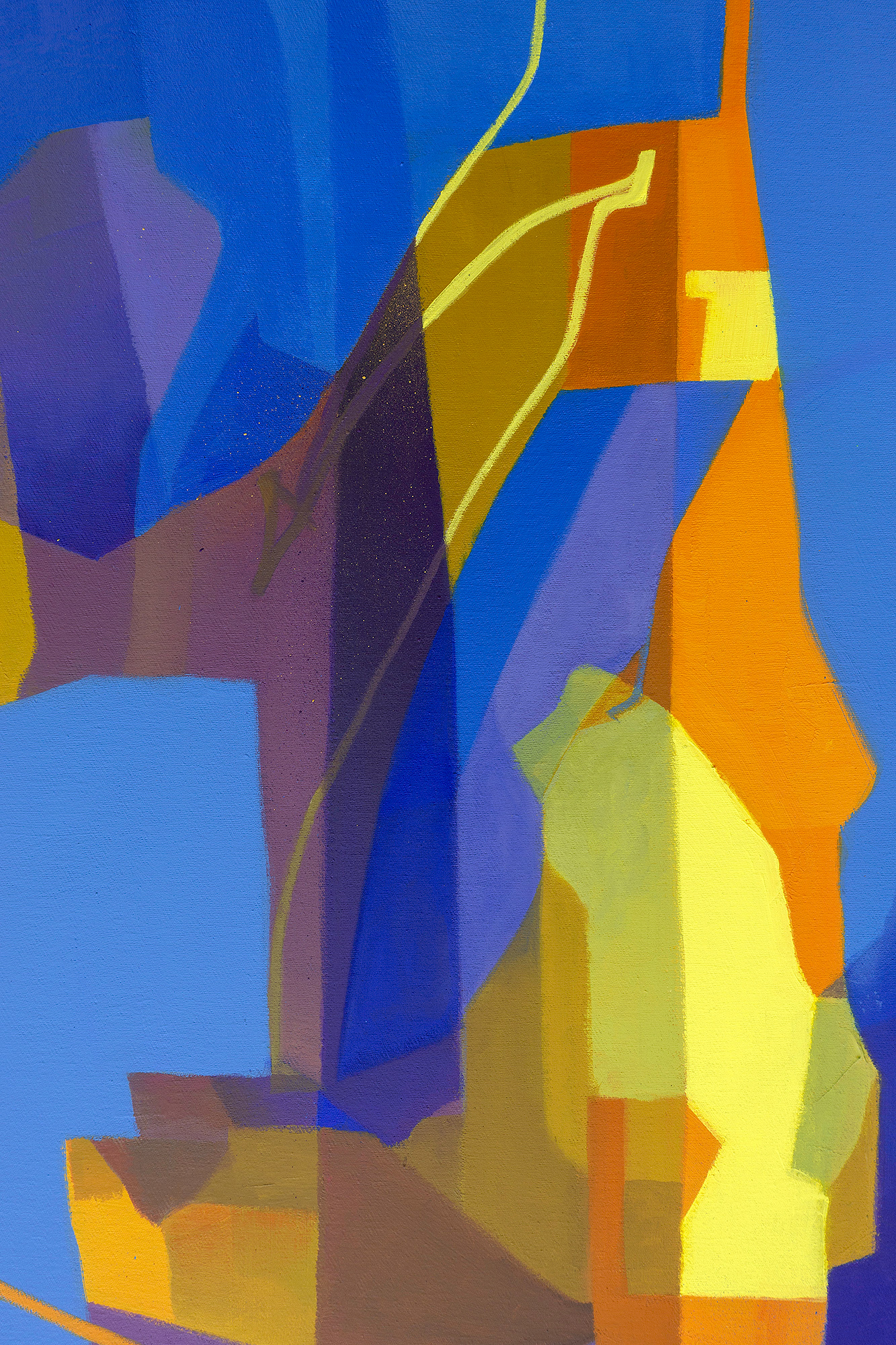 This abstract painting reflects different stages of belonging within a new social environment. Part of the large yellow-orange form is overlapped by blue, suggesting a community that has already integrated and adapted to its surroundings. Nearby, a separate yellow-orange element remains exposed, closely pressed by a dense dark blue mass. This heightened contrast emphasizes the psychological pressure of isolation. A thin linear trace marks a fragile link to the familiar past, offering continuity