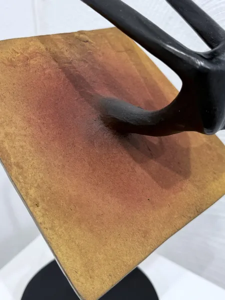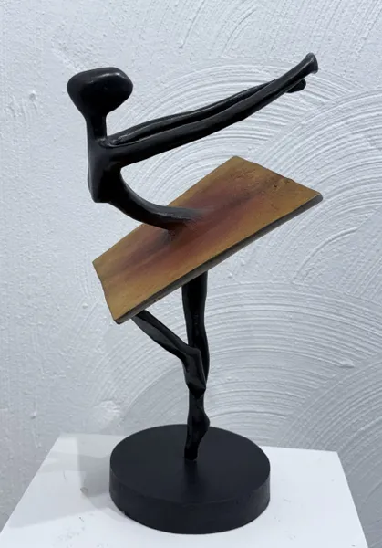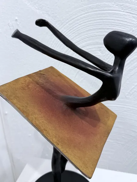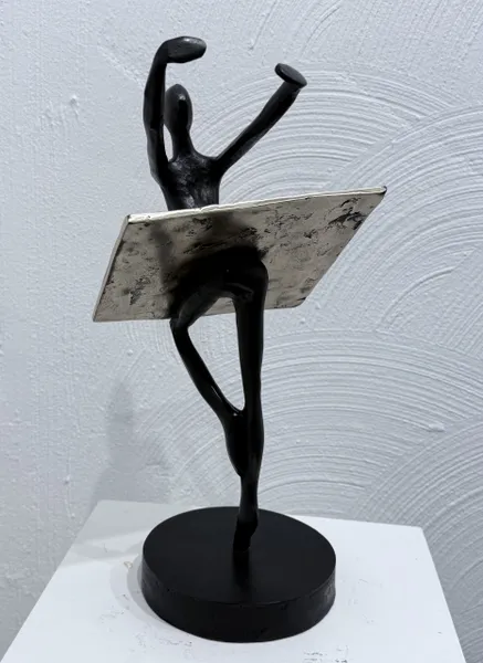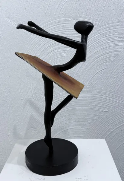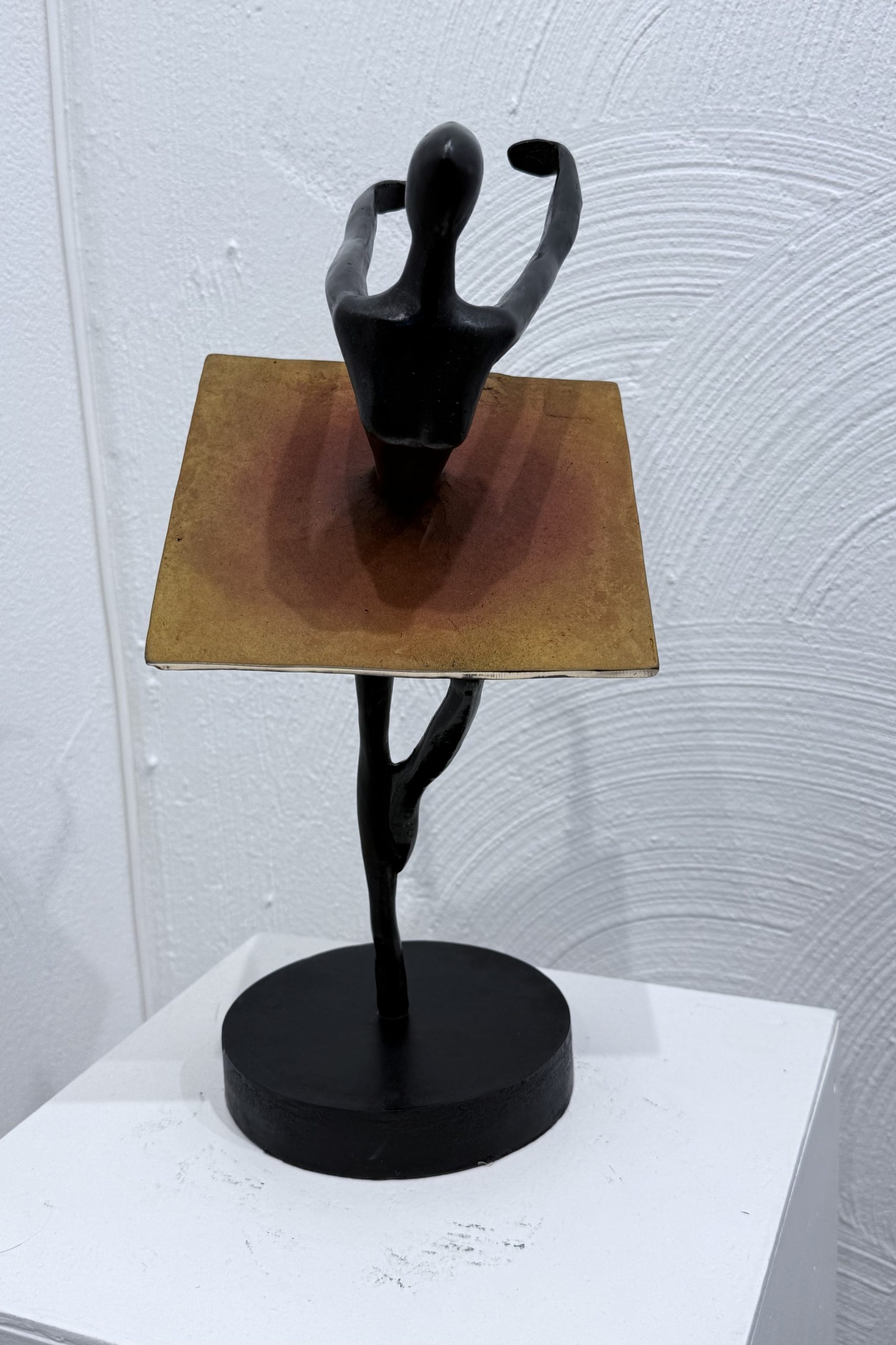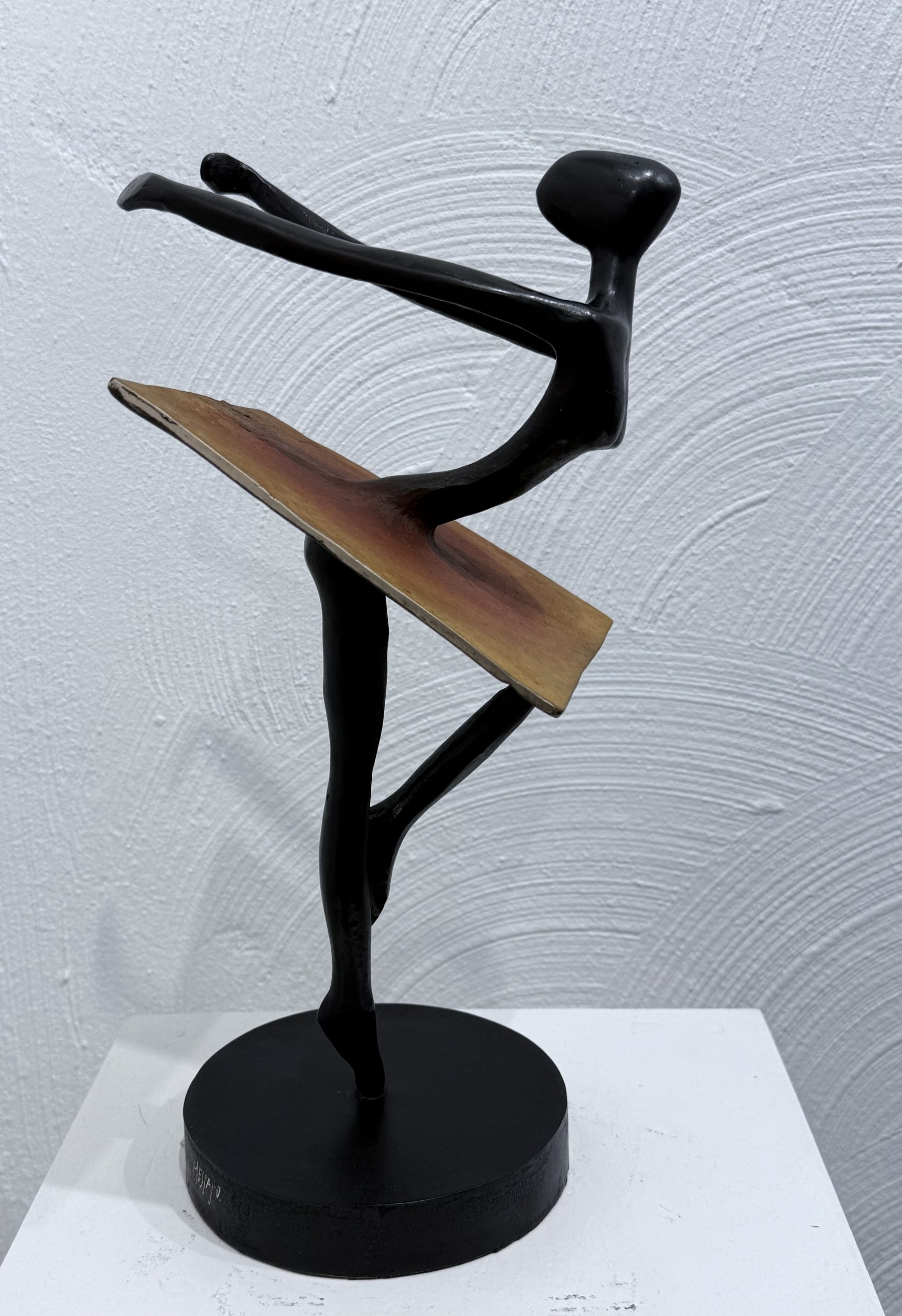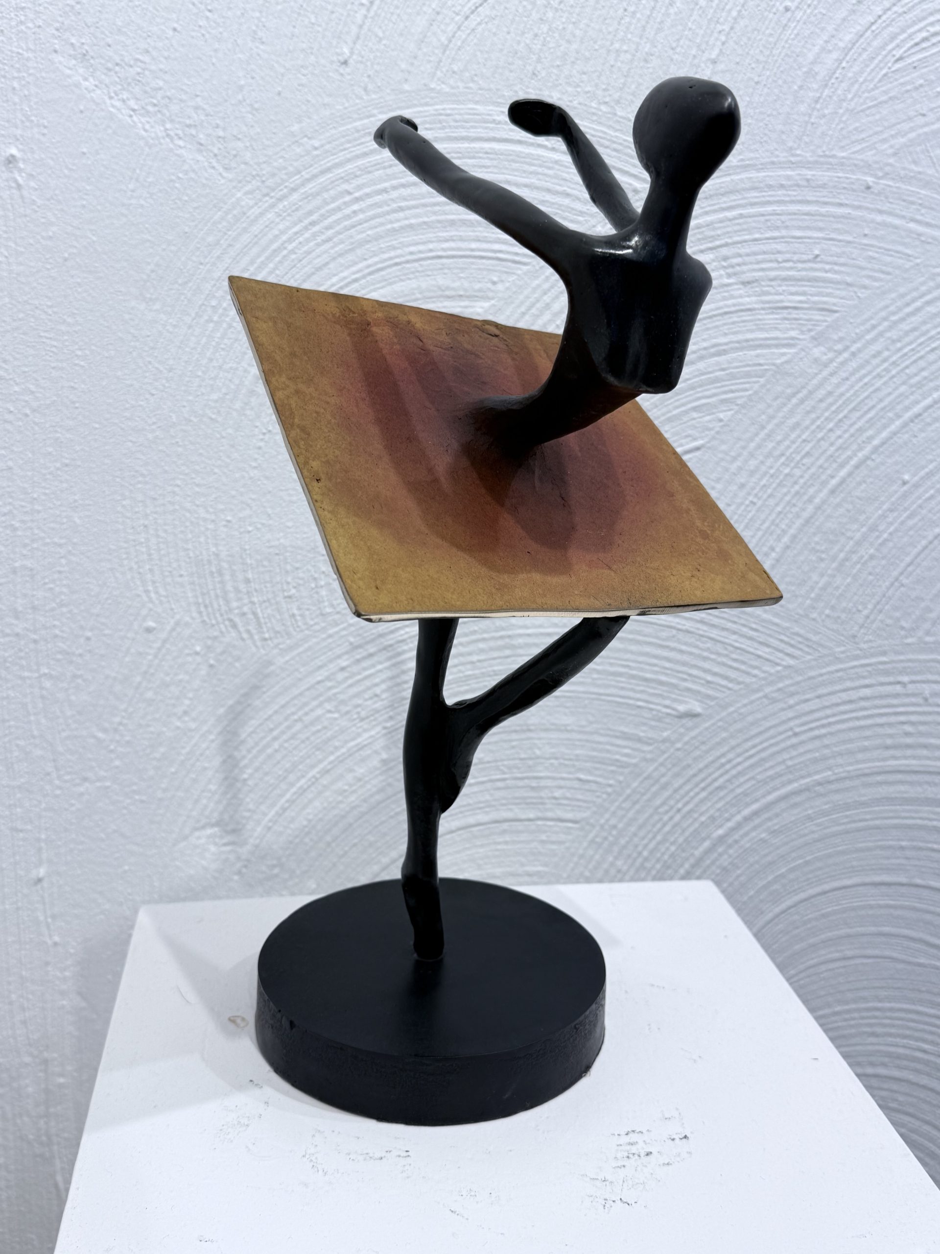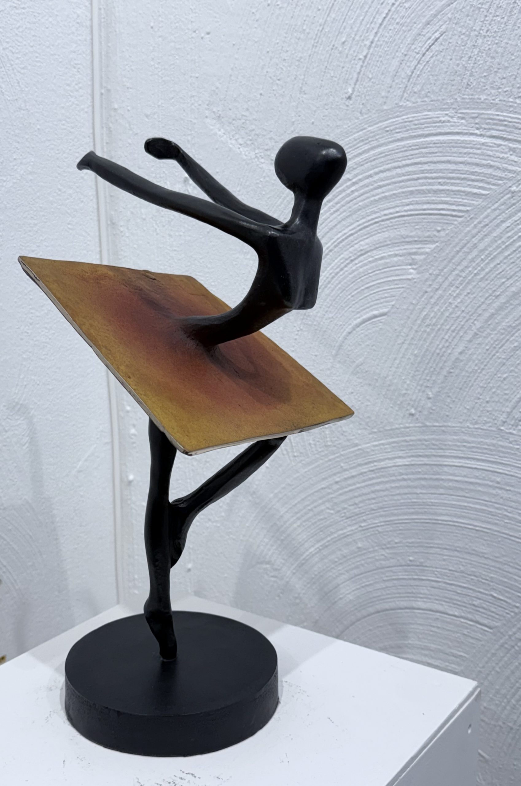 The contrast between the deep black patina and the warm plate enhances the sense of elevation, like an invisible breath carrying the dancer.