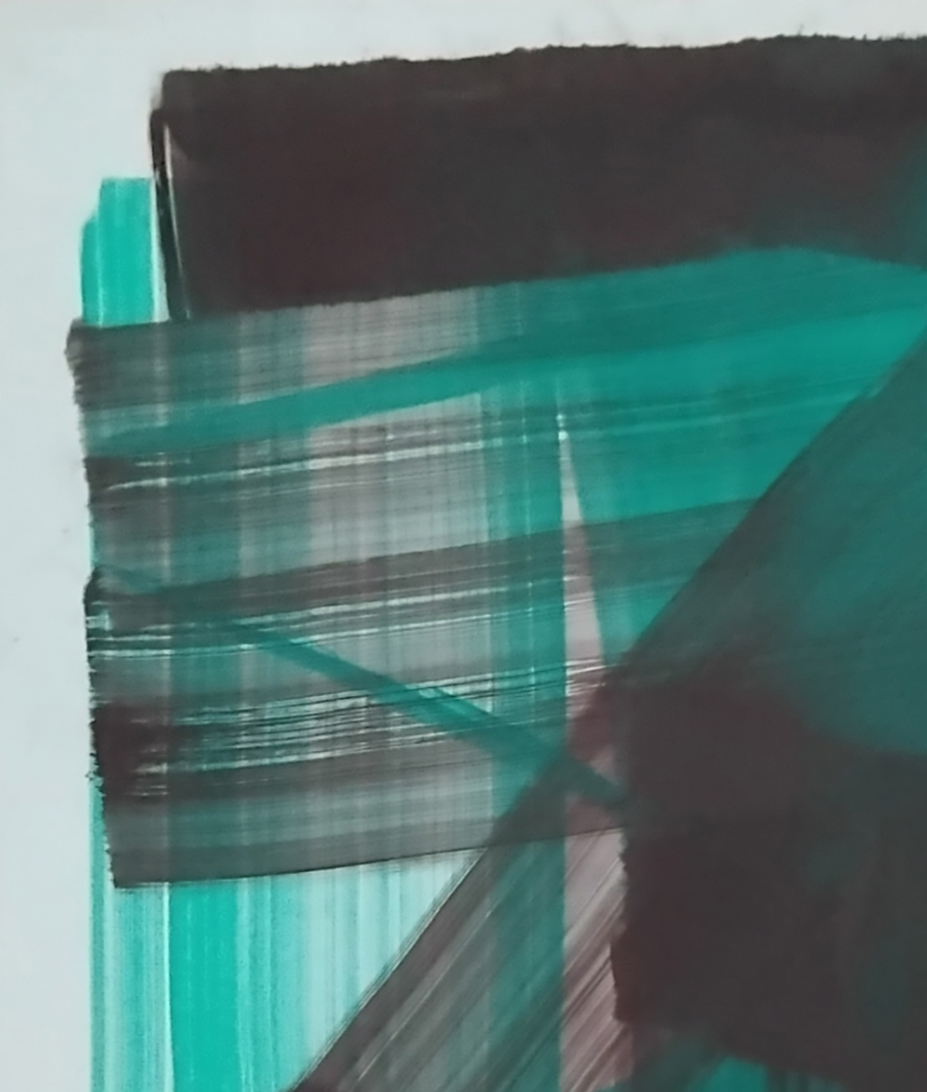 The painting on paper is executed with pigments. The two colors are a leaden gray tending toward cold blue and a turquoise tinged with gray. The intention is to evoke the sensation of a landscape of cold, clear land, such as Iceland might be in the imagination and literature.