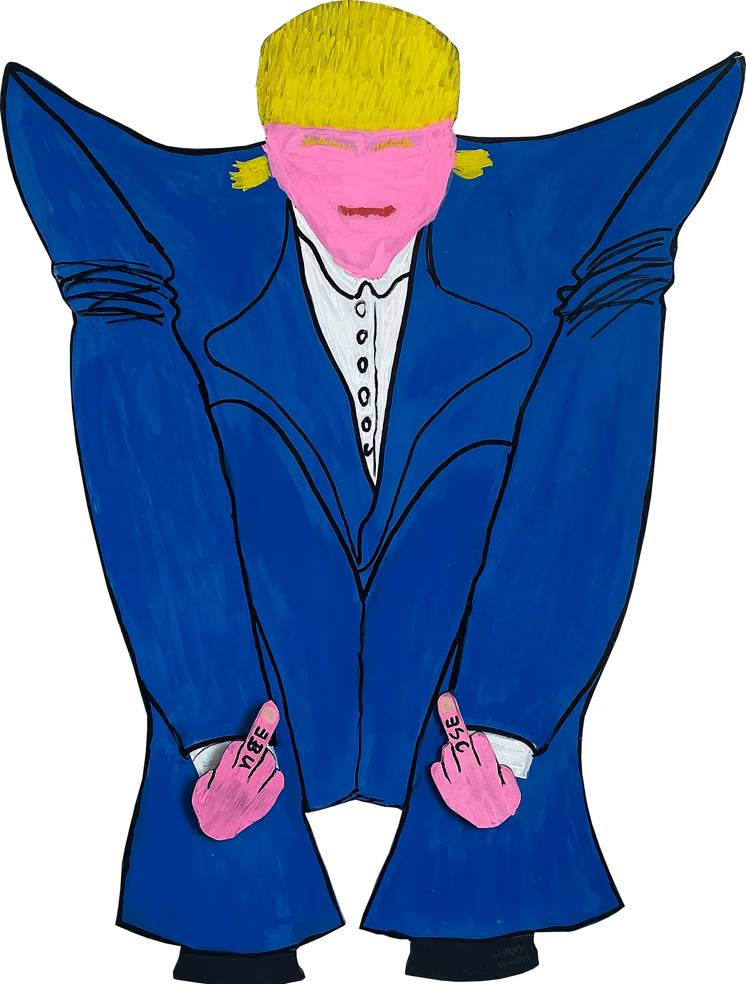 JOOST KLEIN is a bold response to the artist’s 2024 Eurovision disqualification. Depicting Klein in his blue suit, raising both middle fingers engraved with “EBU” and “ESC,” the work protests censorship and authority. More than a reaction, it’s a statement on artistic freedom, rebellion, and integrity within institutional control.