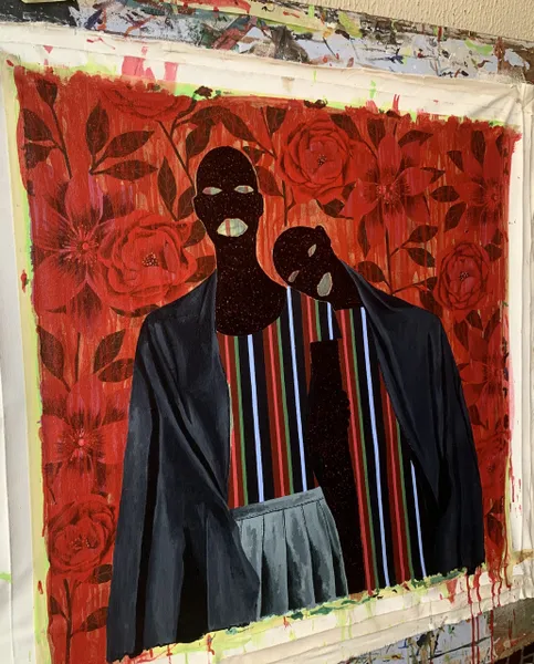 Akintomide Akinshola (b. 1995) is a contemporary visual artist from a lineage of crop farmers in the historic city of Ondo, Ondo State, Nigeria. He currently lives and works in Lagos. From a young age, he showed a deep curiosity for art, experimenting with everyday materials to express his imagination. This early passion guided him toward a degree in Fine and Applied Arts Education at Obafemi Awolowo University, Ile-Ife.Over the years, Akintomide has participated in several group exhibitions both in Nigeria and abroad, steadily building a distinctive visual language. Akintomide’s artistic practice explores identity, culture, and the complexities of human relationships. Through the use of ink and acrylic compositions, he creates figurative pieces that reveal the beauty, fragility, and resilience of human bonds. His exaggerated facial features, especially the nose serve as both personal symbol and narrative device, rooted in childhood experiences of being taunted, yet transformed into marks of strength and individuality.Influenced by his environment, cultural heritage, and personal experiences, Akintomide captures intimate scenes that invite reflection on how relationships shape and transform us. He also brings together African and non-African fabric patterns, reimagining their historical and cultural connections. Through this fusion, his art becomes both a celebration of shared humanity and a visual dialogue on identity, belonging, and the power of connection.
