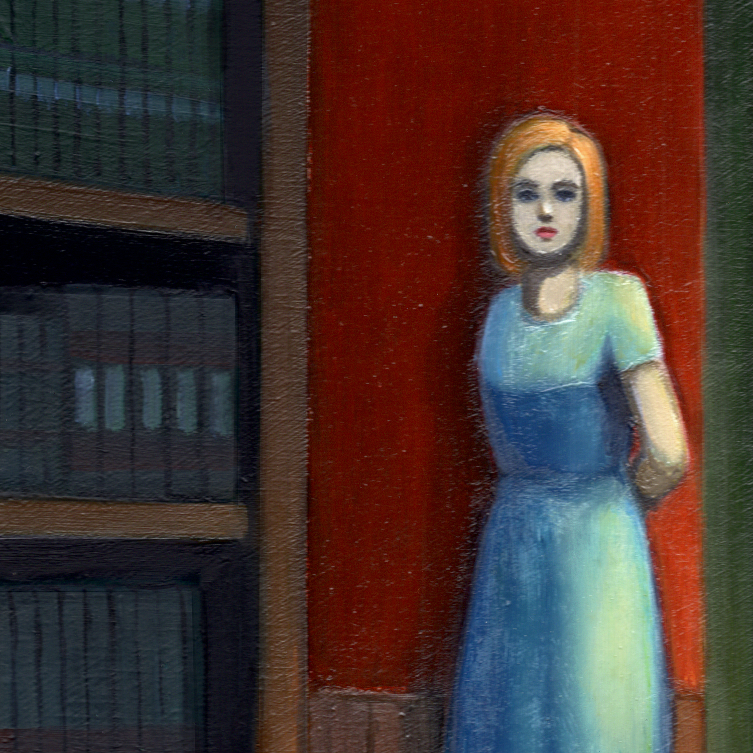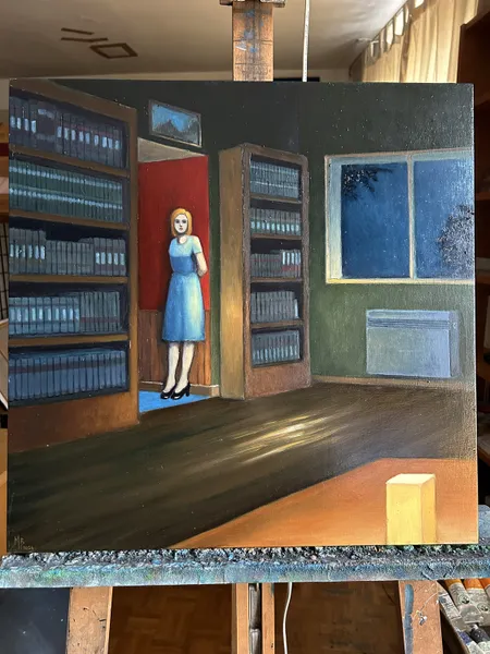 Here, I started with the idea of a nighttime interior, and the character and the fact that it is a library came to me as I was working. I did not use any existing location as a reference; it is purely imaginary.