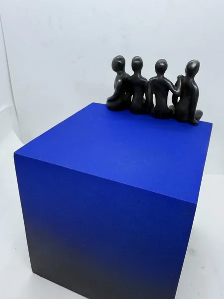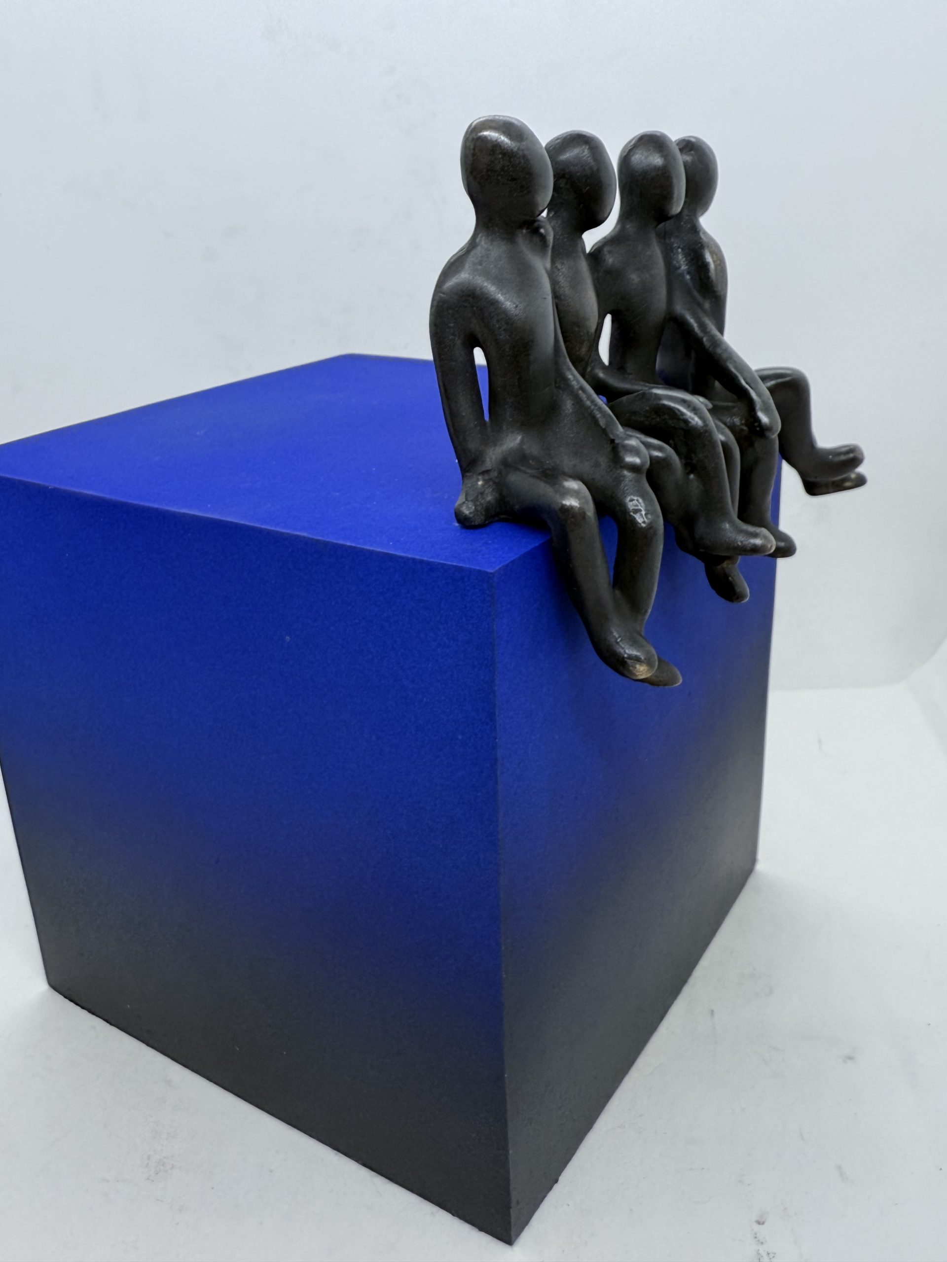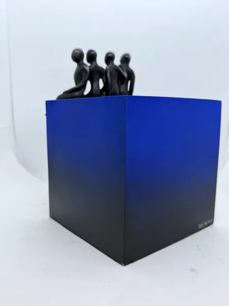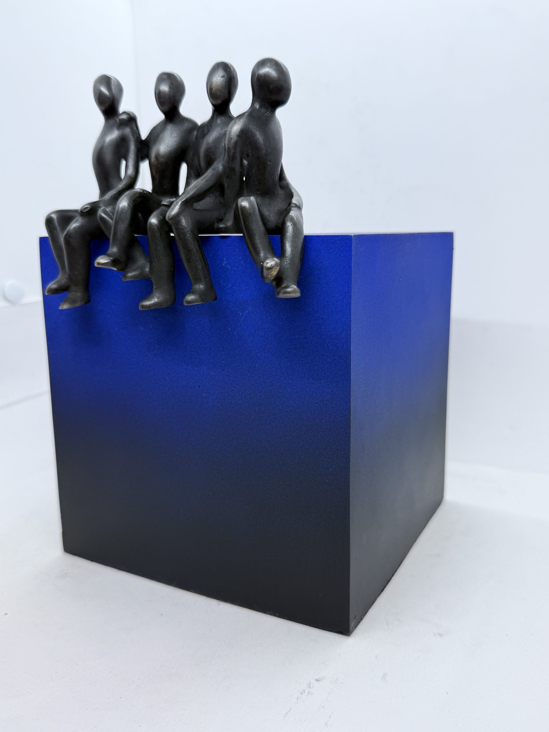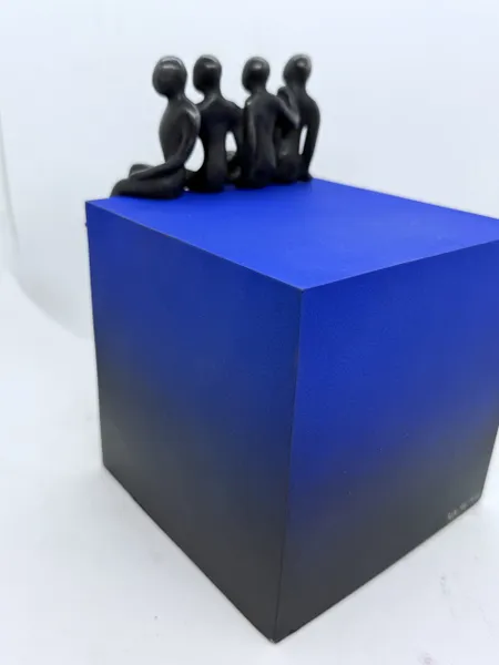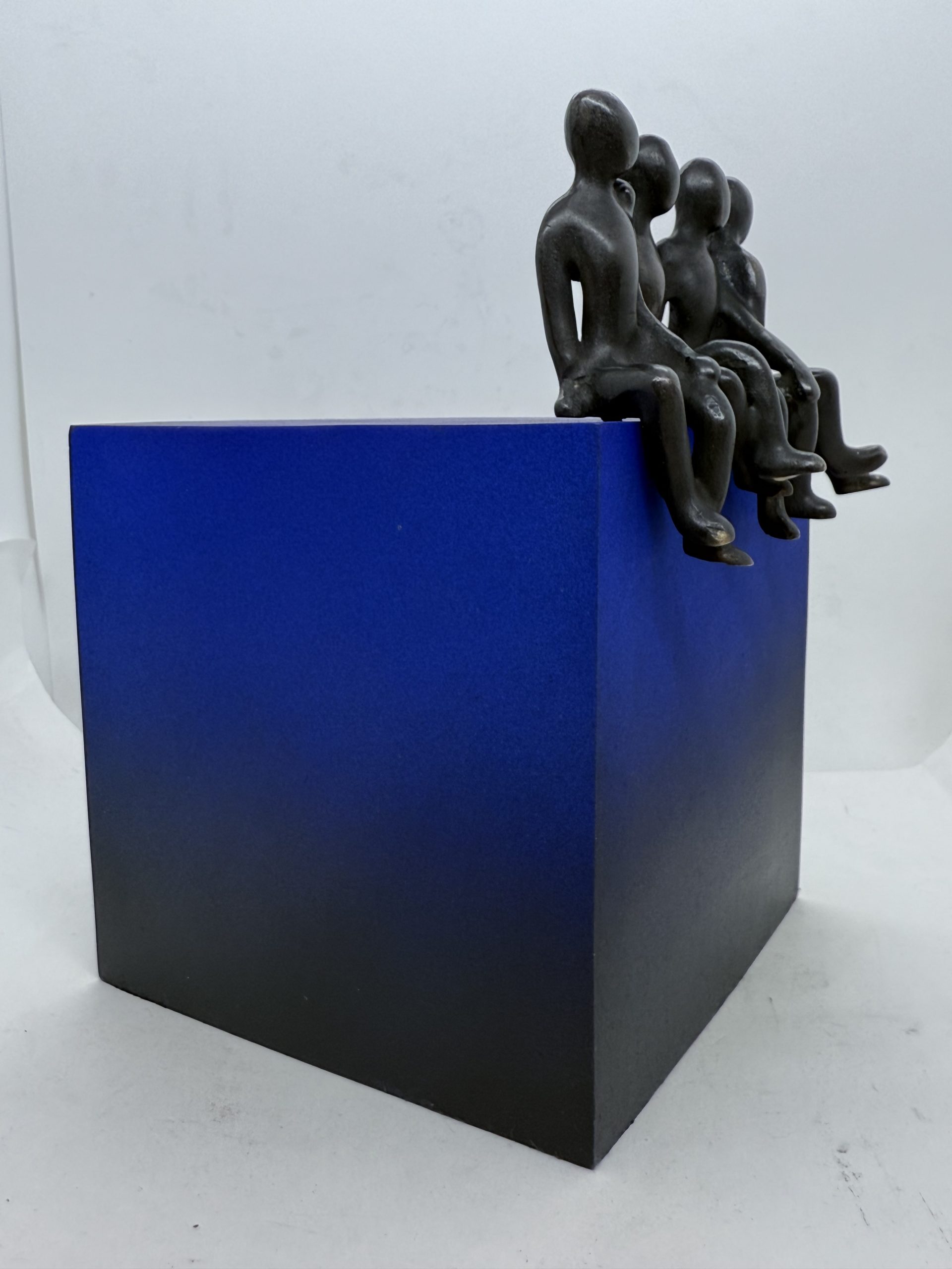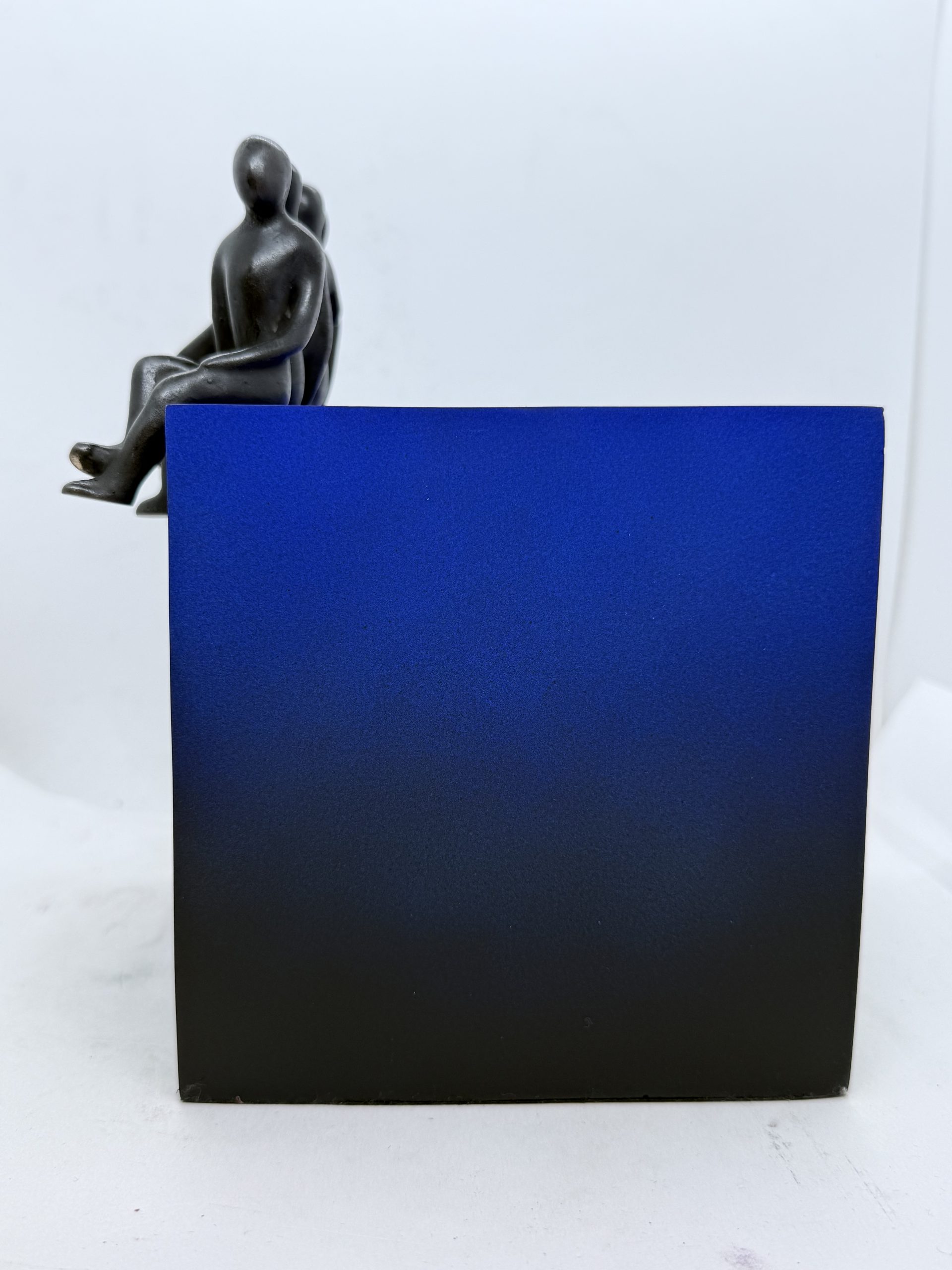 Set on a deep blue base, the sculpture contrasts calm stillness with subtle movement.