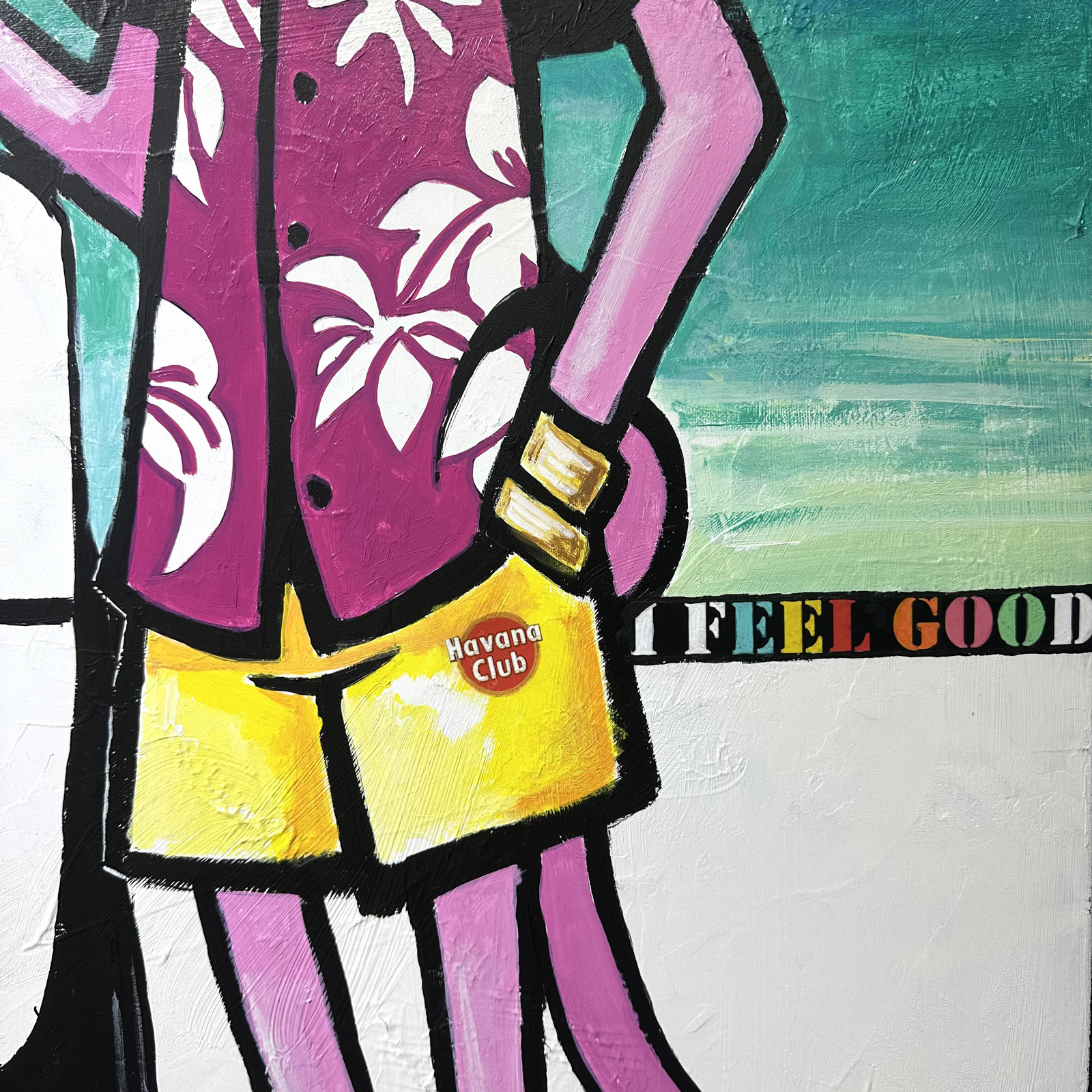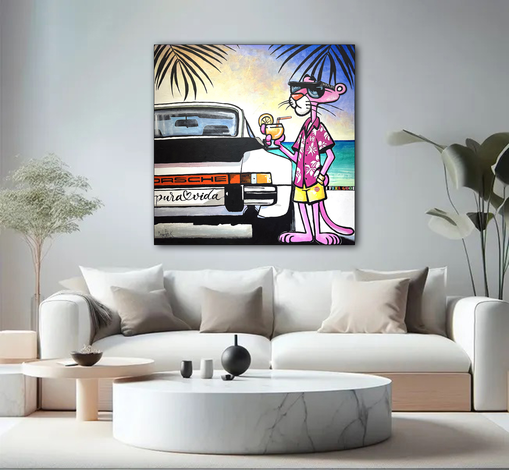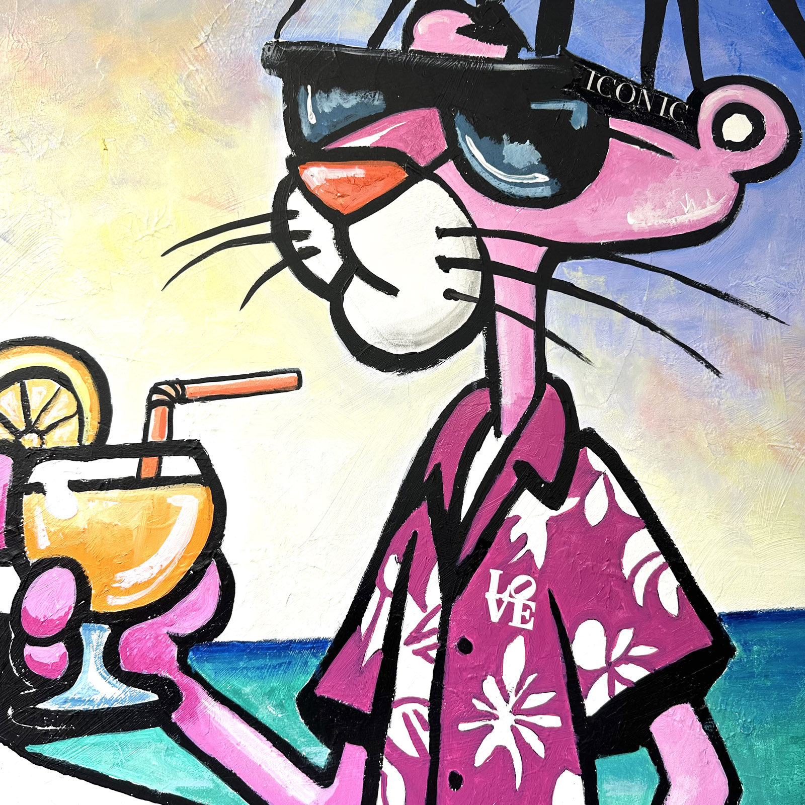 This vibrant and dynamic work of art depicts the Pink Panther relaxing on a tropical beach. The pink panther, sporting a floral Hawaiian shirt and sunglasses, embodies the carefree spirit of 'la vita pura'. To his left, a classic Porsche adds a touch of sophisticated elegance, emphasising a luxurious and hedonistic lifestyle. The background is a harmonious blend of pastel colours, evoking an exotic sunset, while palm trees sway gently in the breeze.