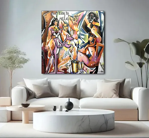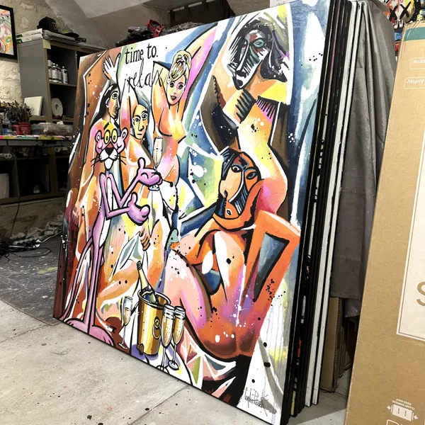 This bold work fuses the imaginary world of the Pink Panther with cubist and modern references. The central Panther seems to invite you to relax, with the inscription 'time to relax'. Around her, stylised female figures, inspired by Cubism, evoke freedom and movement. The bright colours, dominated by pinks and oranges, contrast with touches of black and white, creating an intense visual dynamic. Champagne bottles and glasses add a festive atmosphere to the scene.