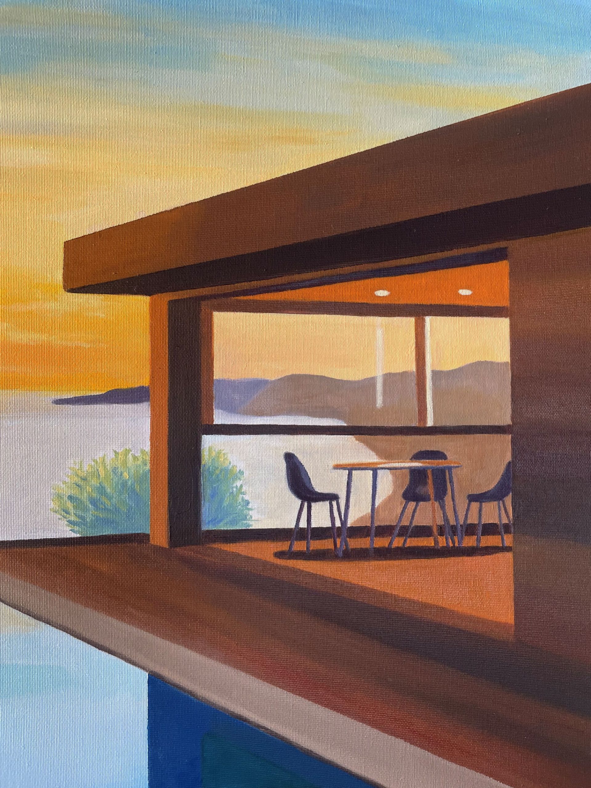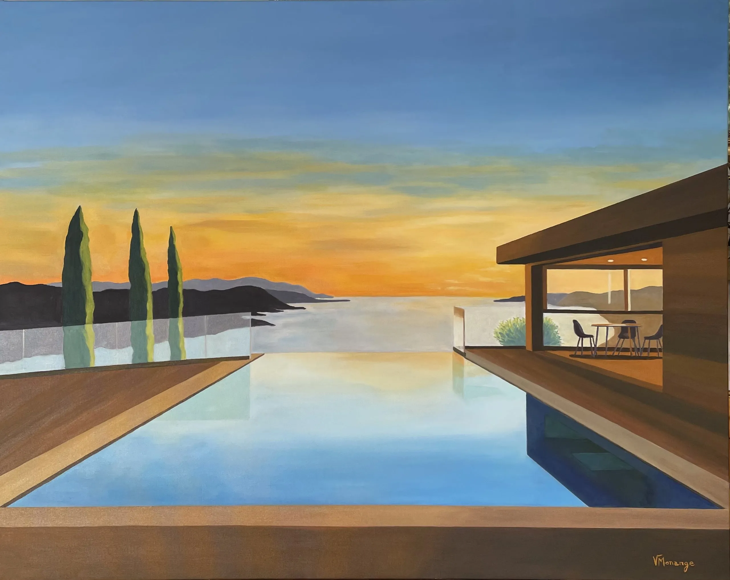 J'ai voulu capturer l’harmonie parfaite entre la géométrie des formes de la maison et sa piscine à débordement et la douceur d’un coucher de soleil. Ce minimalisme figuratif évoque une sérénité apaisante, invitant à la contemplation. Cette œuvre illumine votre espace d’une énergie calme, où se mêlent chaleur et pureté, transportant l’âme vers un instant suspendu, entre rêve et réalité.