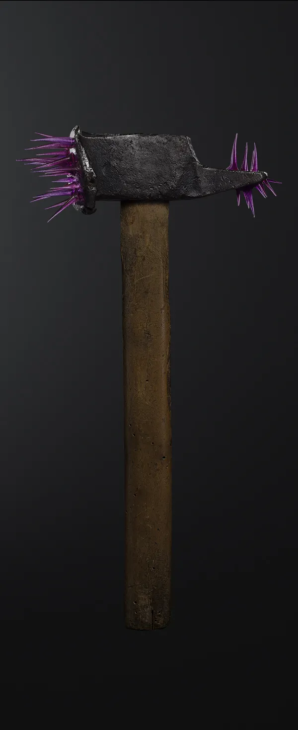 Le Marteau Aux Epines Roses - Stèle photographique des sculptures natives avant soclage de la série Hors d'Usage. Tirage lambda contrecollé sous plexiglas, châssis affleurant en bois teinté acrylique gris graphite et ciré. 7 stèles numérotées de N° 1 à N°7. Plus une épreuve d'artiste.