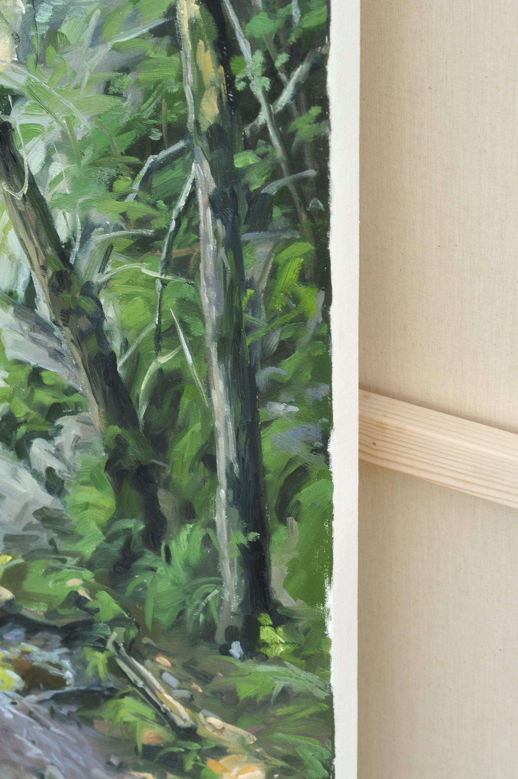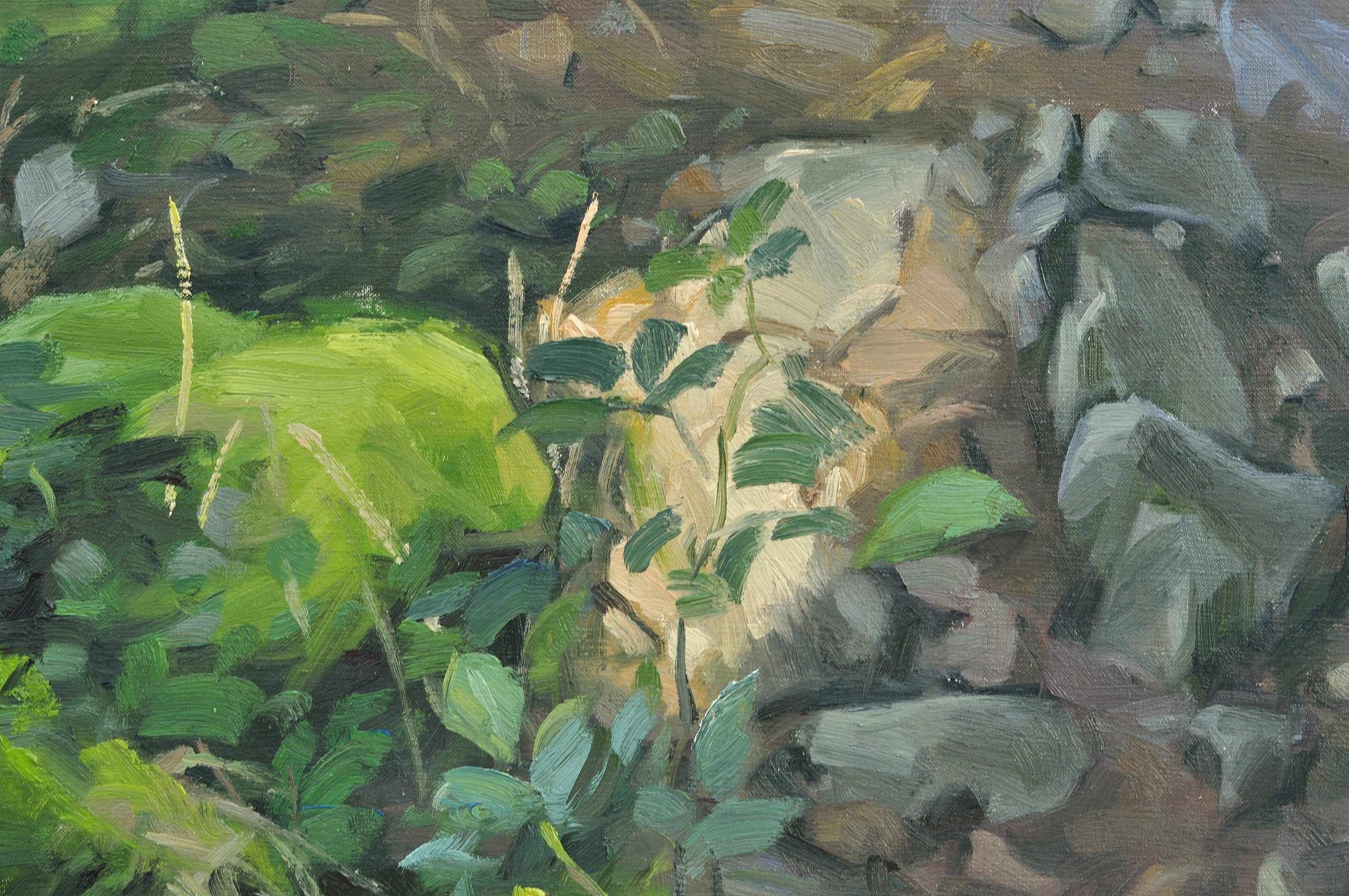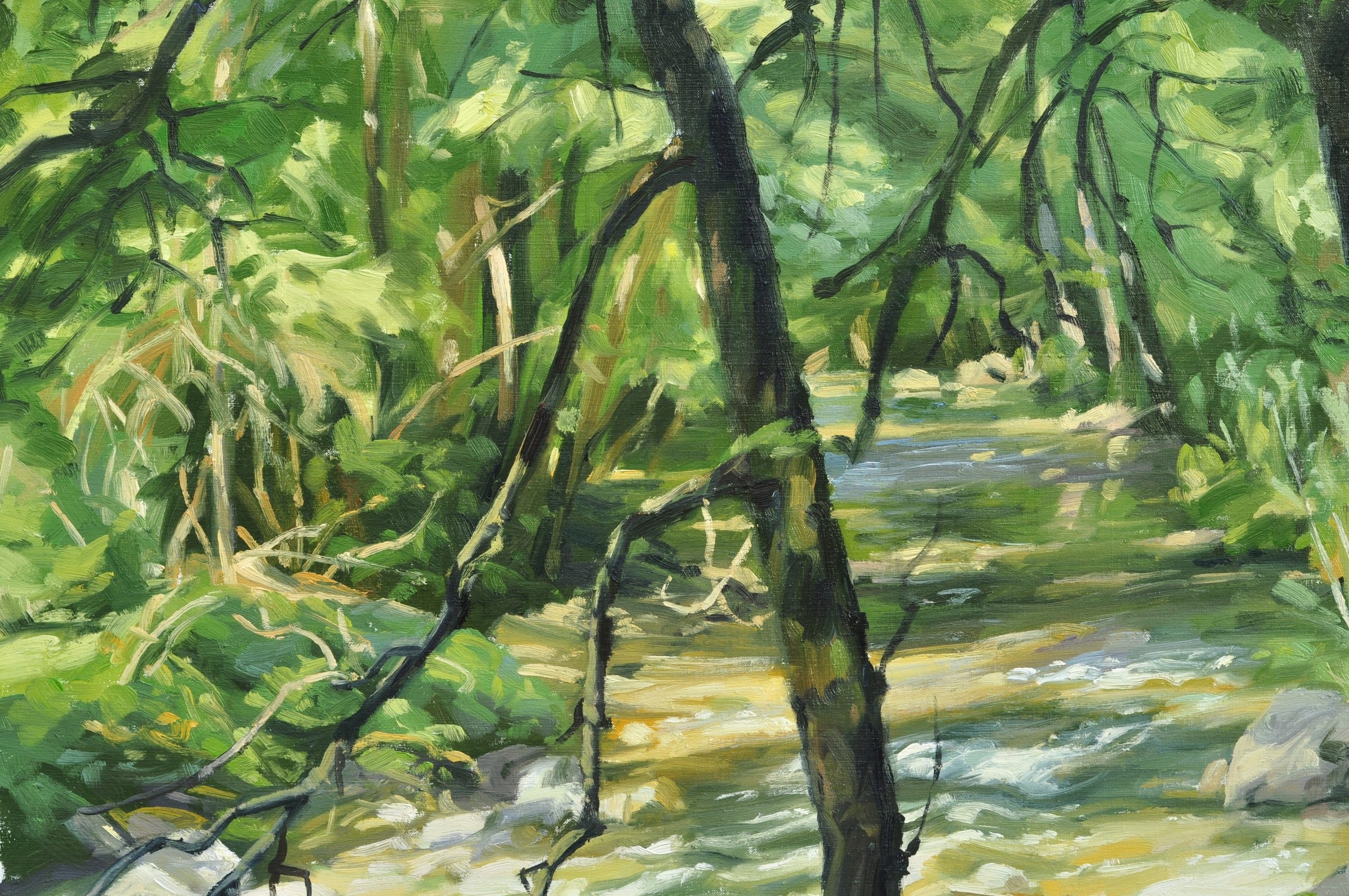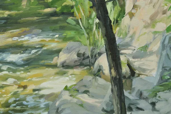 The Sumène is a small river that winds its way along the foot of rocky cliffs, in the shade of the woods. In summer, its calm flow glides over the rocks, murmuring softly. But after a storm, the river wakes up, the current rolling the pebbles. I tried to capture this joyful flow under the light filtered through the trees one summer morning.
