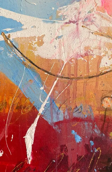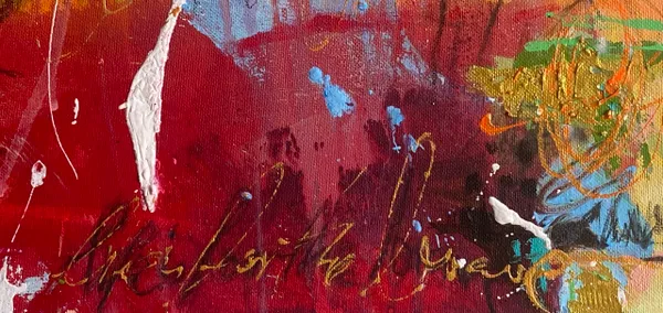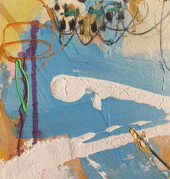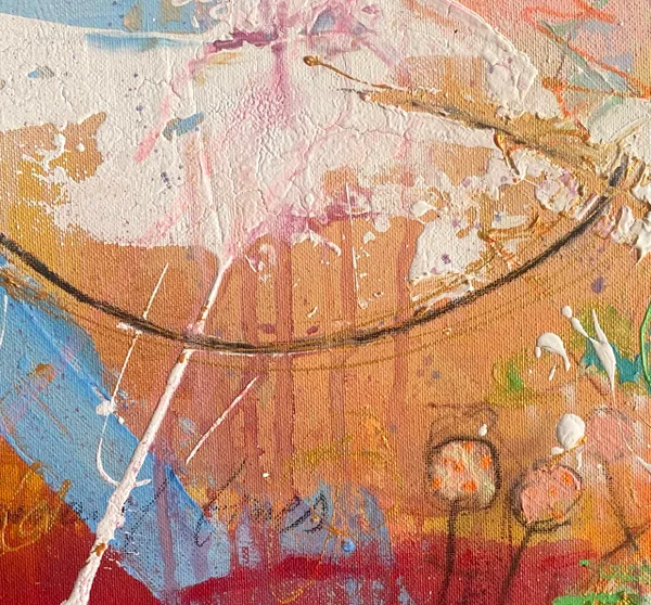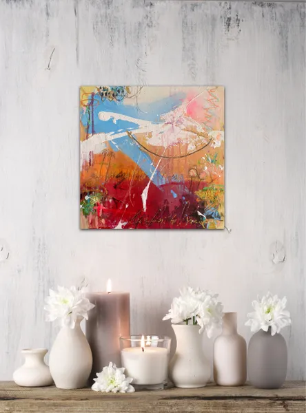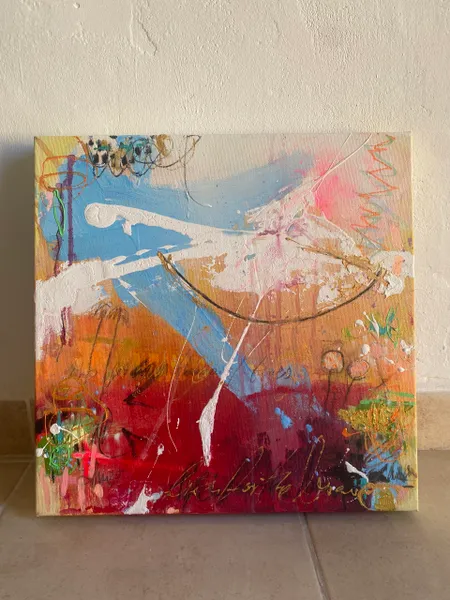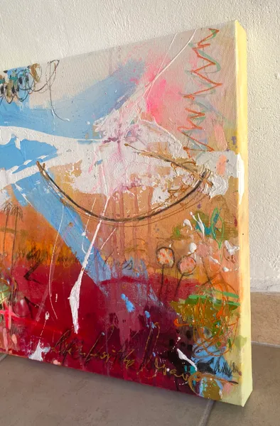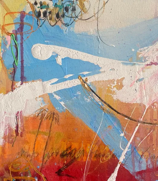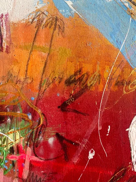 Sweeping brushstrokes and layered textures create an energizing composition. Symbols emerge from the abstract background, like palm trees and in the right center something like a boat.