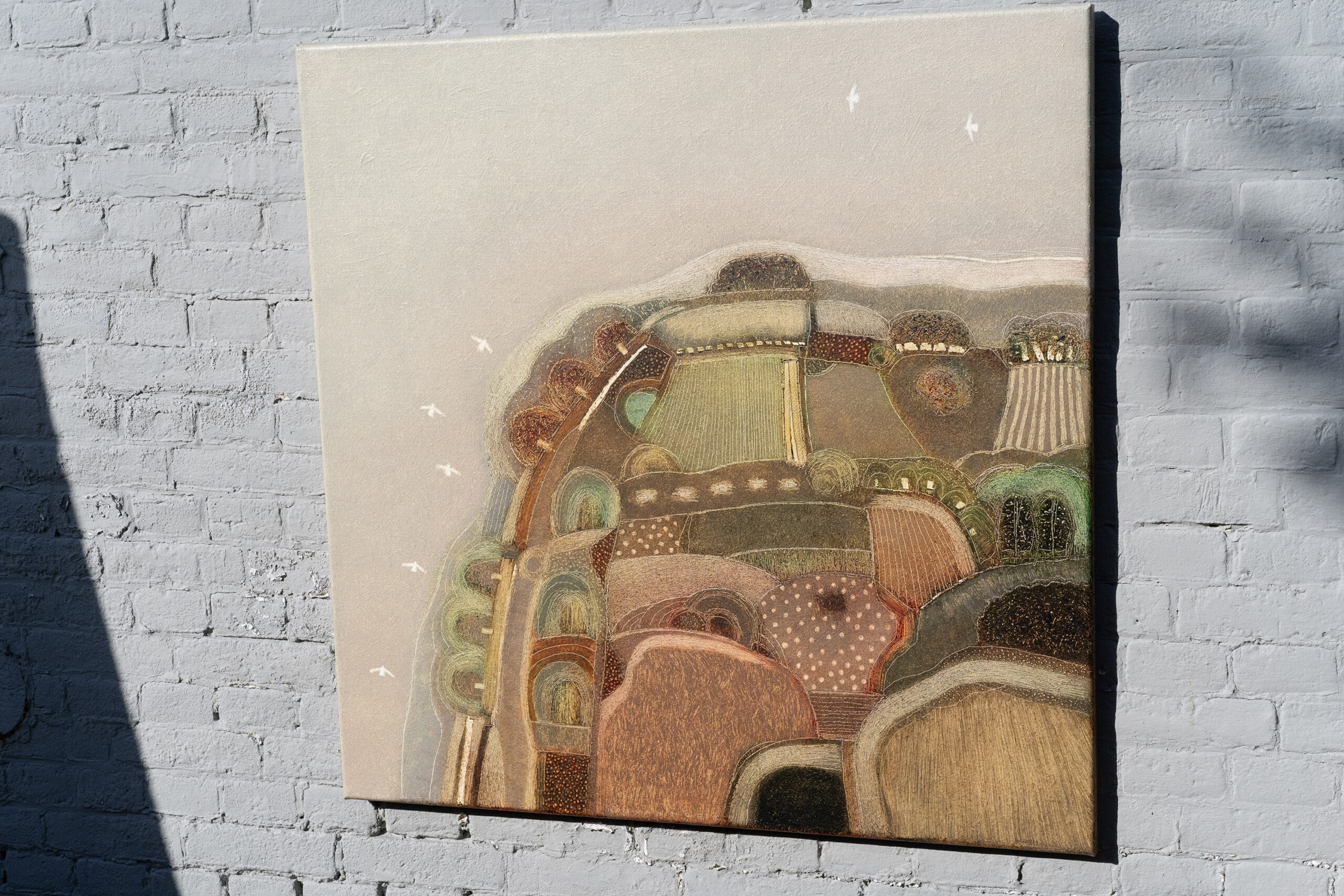 Landscape painting with an unusual perspective. Soft but clear colors. Birds fly along the horizon. Created with oil and wax for depth and luminosity, it evokes peace, renewal, and quiet joy. Titled after a Meredith Brooks song, it reflects the artist's tradition of naming works after song lyrics. Painted on high-quality canvas with finished edges, it is ready to hang. Unframed.