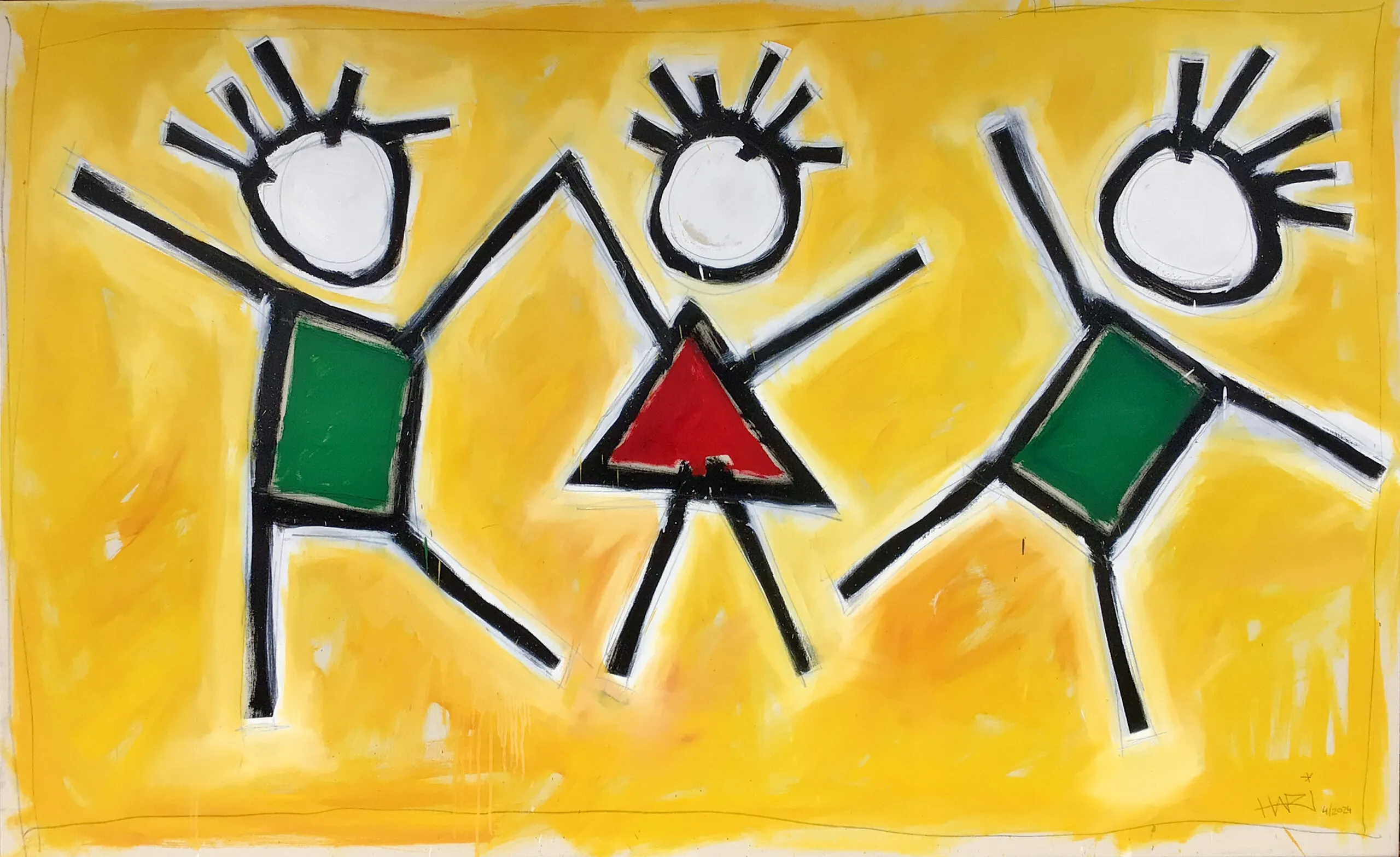 In diesem Werk verschmelze ich Öl und Bleistift, um eine Szene von purer Lebensfreude zu kreieren. Inspiriert von Art Brut und Kubismus, vereinfache ich Formen auf das Wesentliche und verwende Pop-Art-Farben, um eine intensive, energetische Atmosphäre zu erzeugen. Es ist ein minimalistischer, doch ausdrucksstarker Ausdruck der Verbundenheit und des Glücks, der jede Umgebung mit Optimismus erfüllen wird. Die Leinwand kann ohne Problem auf einen dickeren Keilrahmen aufgespannt werden.