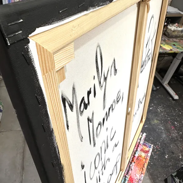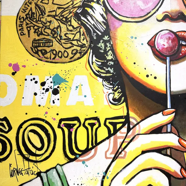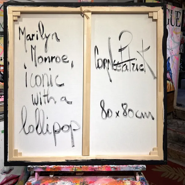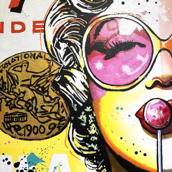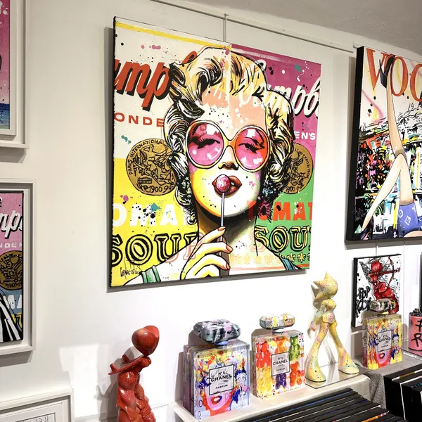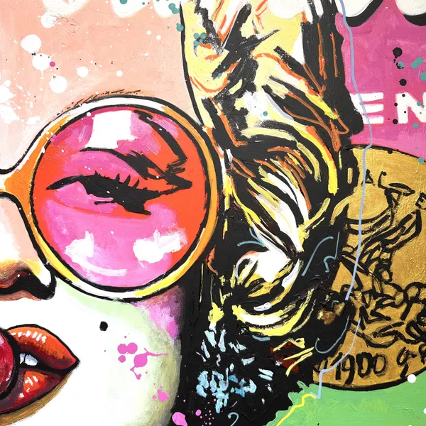 This captivating work of art blends pop art with Hollywood glamour. Depicting Marilyn Monroe, she wears oversized pink sunglasses and savours a lollipop with a relaxed and confident attitude. The background is a bold fusion of bright colours and iconic patterns, reminiscent of Warhol's famous Campbell's soup cans. The inscriptions and paint splatters add a modern and lively dynamic to the whole. The combination of retro and modern elements creates a striking contrast.
