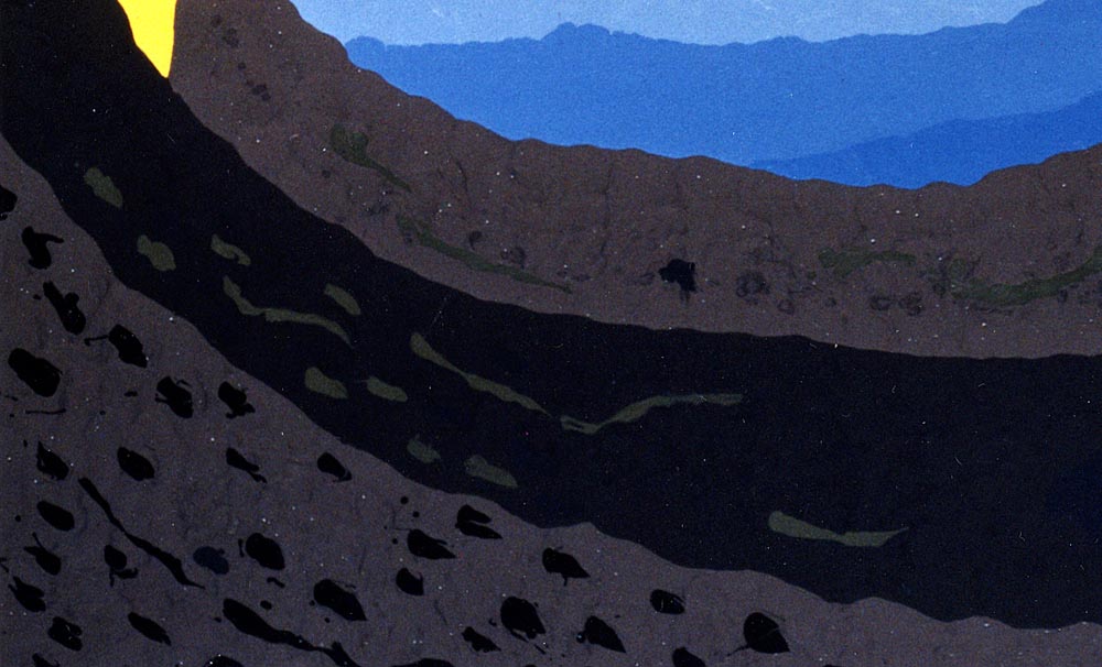 This piece captures the sensation of peering across a cavernous space toward a serene horizon. The use of intense colors with dark shapes emphasizes the drama and mystery inherent in the scene, inviting us to reflect on the transition from shadow to light.