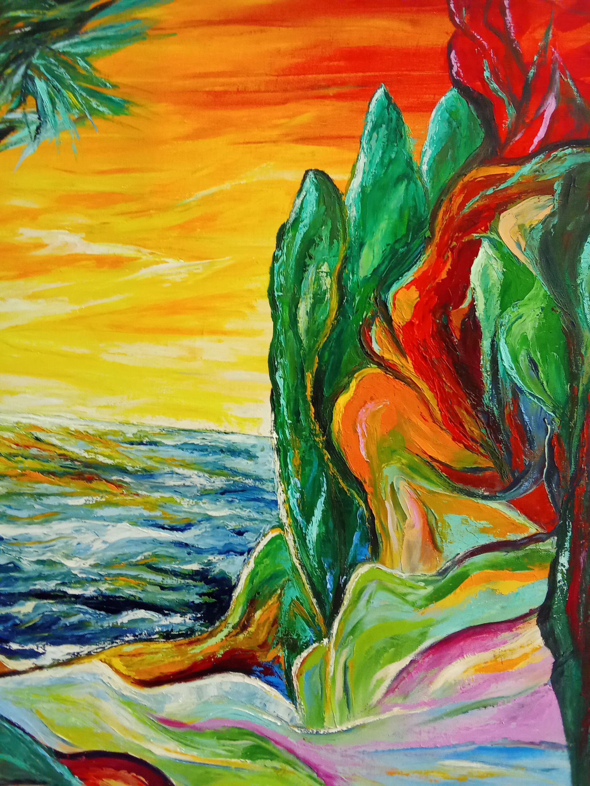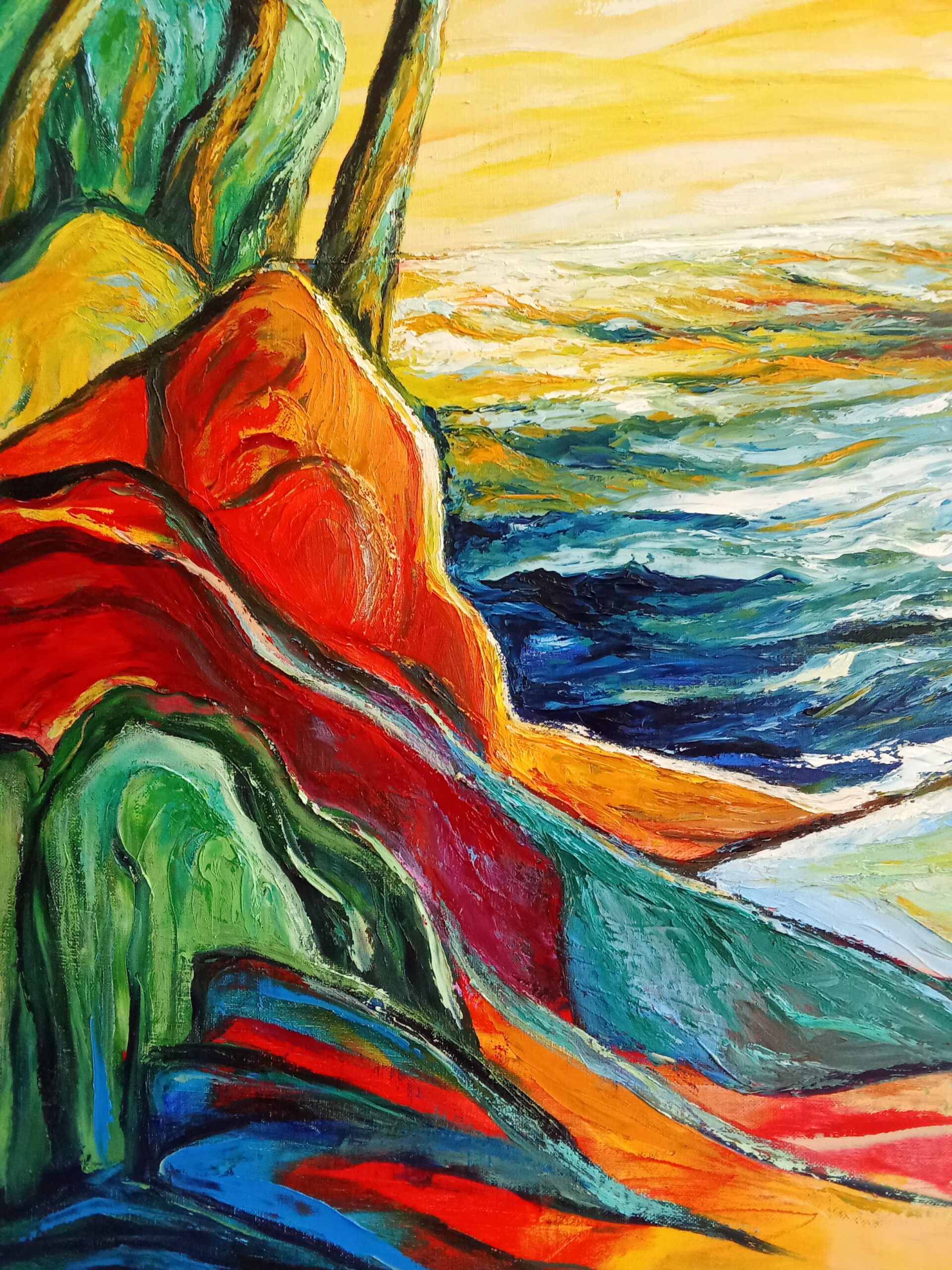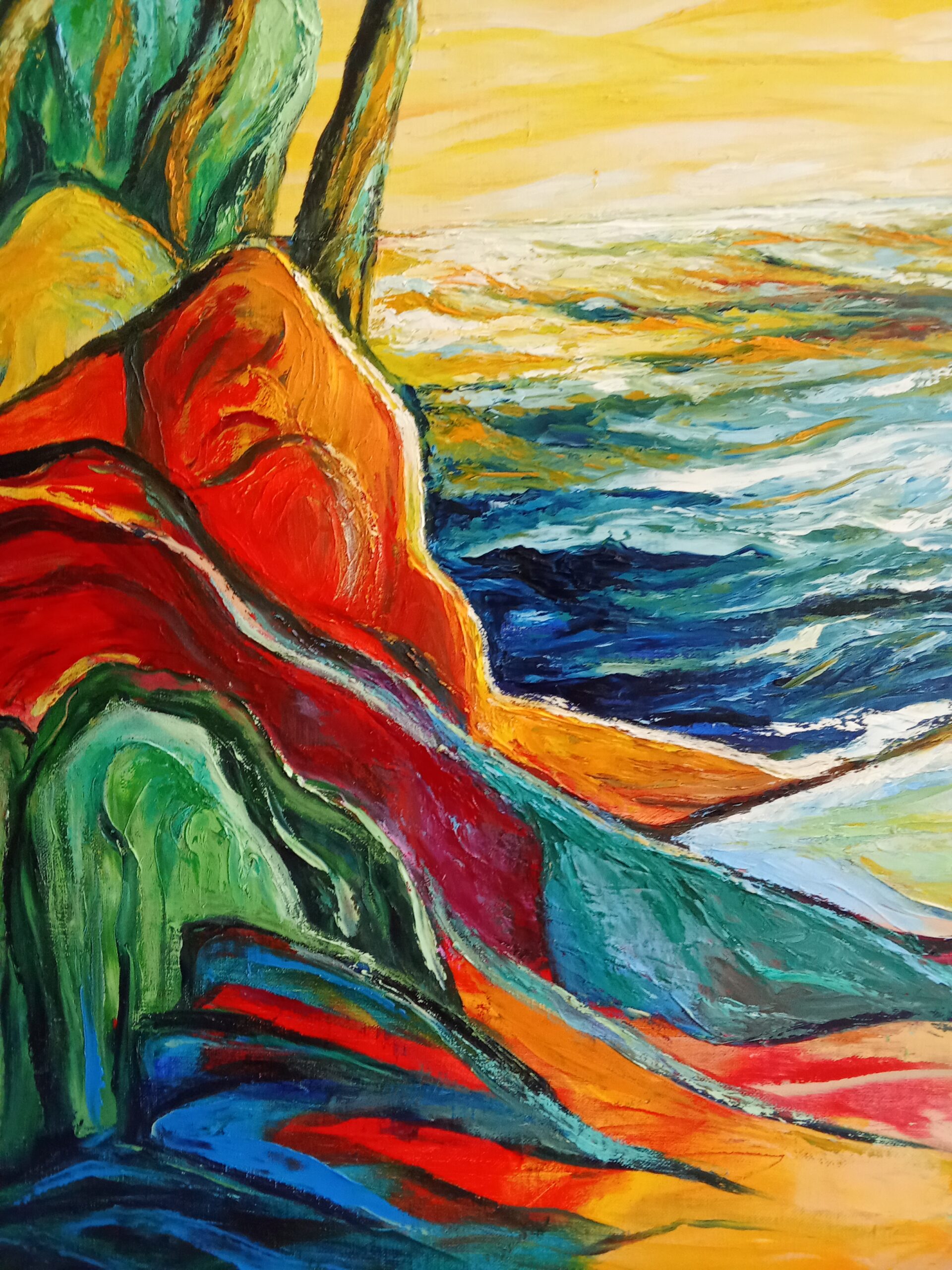 Dans cette œuvre j'ai cherché à capturer la fureur et la beauté d'une mer agitée à travers des couleurs vives et des formes expressionnistes. Les rouges ardents et les jaunes lumineux contrastent avec le bleu profond de l'océan, évoquant une danse de passion et de mouvement. Cette peinture n'est pas seulement un paysage, c'est une explosion d'émotions, un cri visuel qui résonne avec la force de la nature.