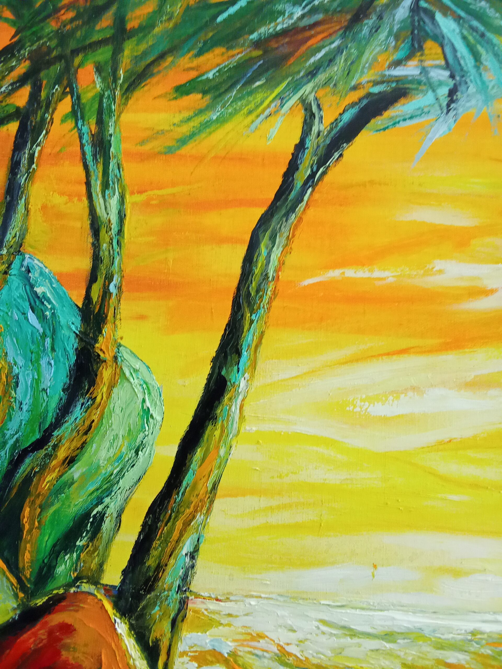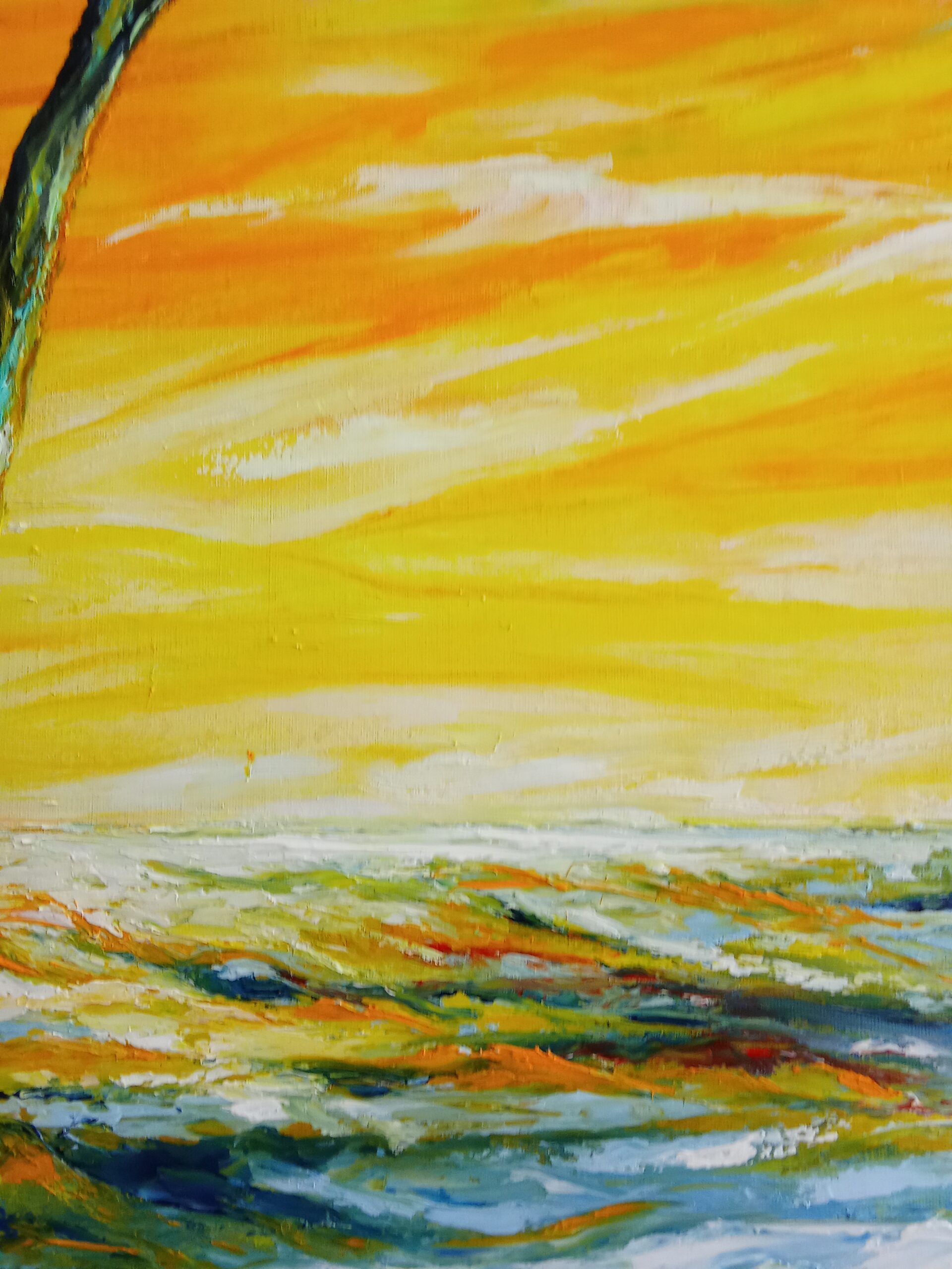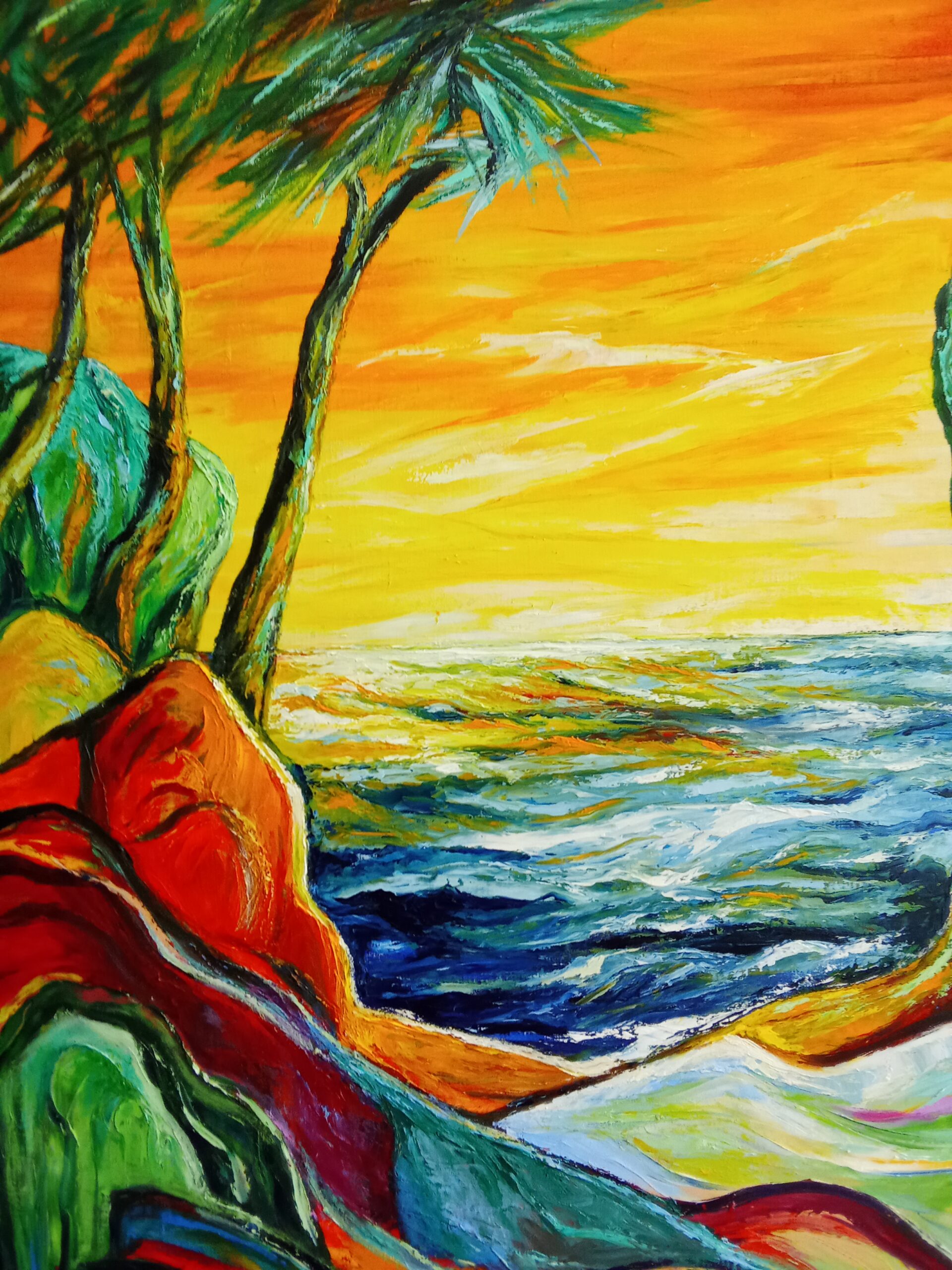 Dans cette œuvre j'ai cherché à capturer la fureur et la beauté d'une mer agitée à travers des couleurs vives et des formes expressionnistes. Les rouges ardents et les jaunes lumineux contrastent avec le bleu profond de l'océan, évoquant une danse de passion et de mouvement. Cette peinture n'est pas seulement un paysage, c'est une explosion d'émotions, un cri visuel qui résonne avec la force de la nature.