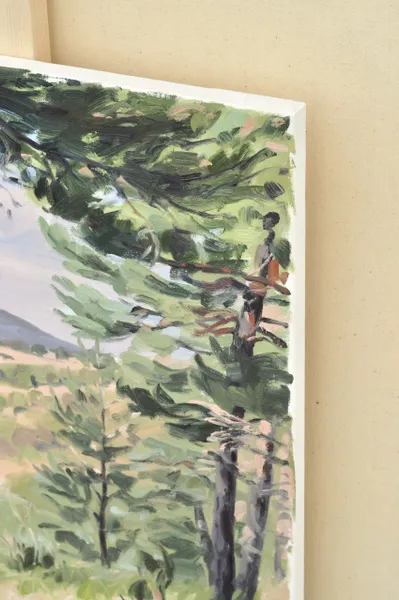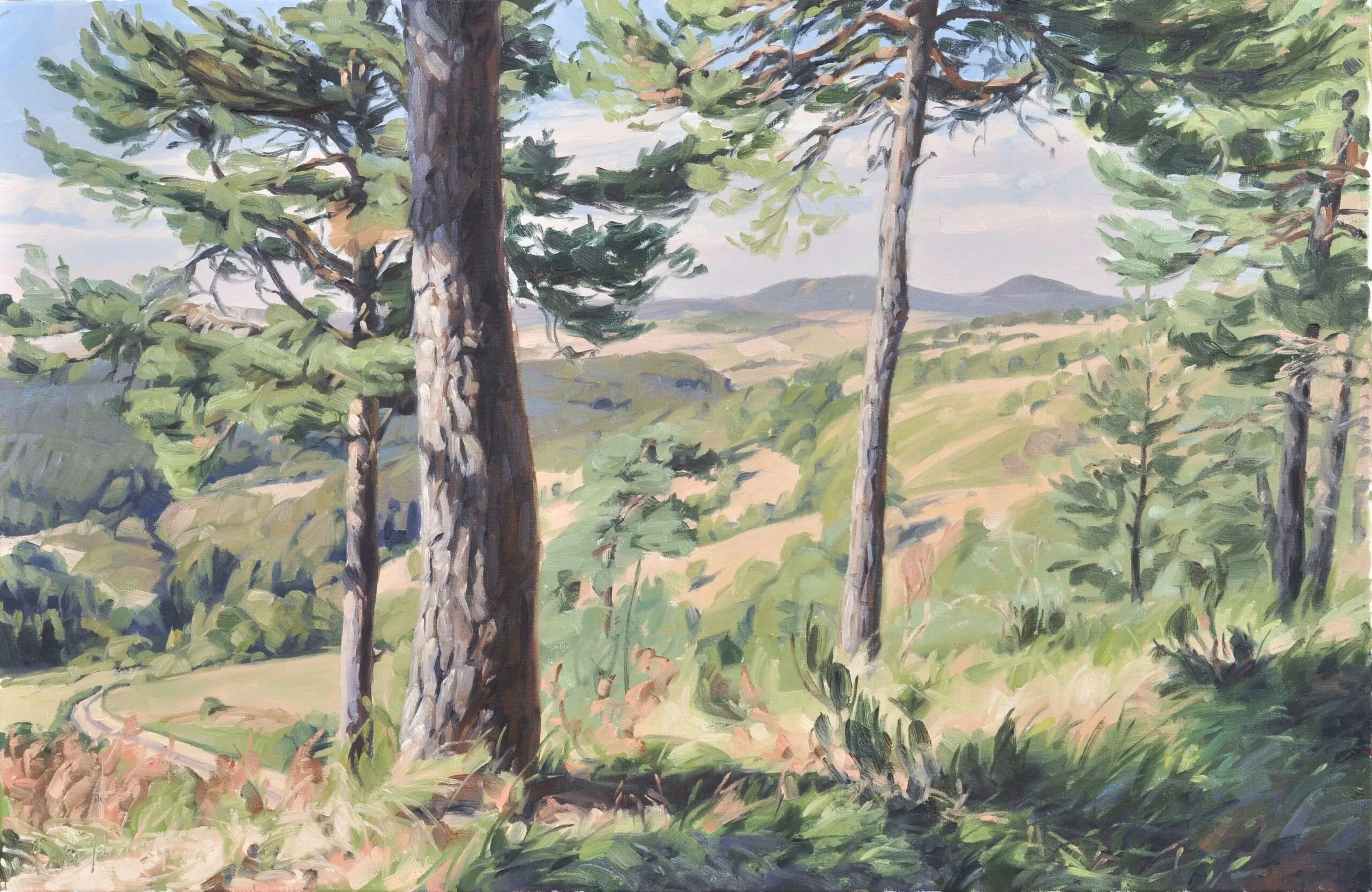 Between their trunks, the view opens up to the valley below: vast meadows, russet from the long summer. This is a landscape that evokes a slower time, the rhythm of the seasons, and tranquility.