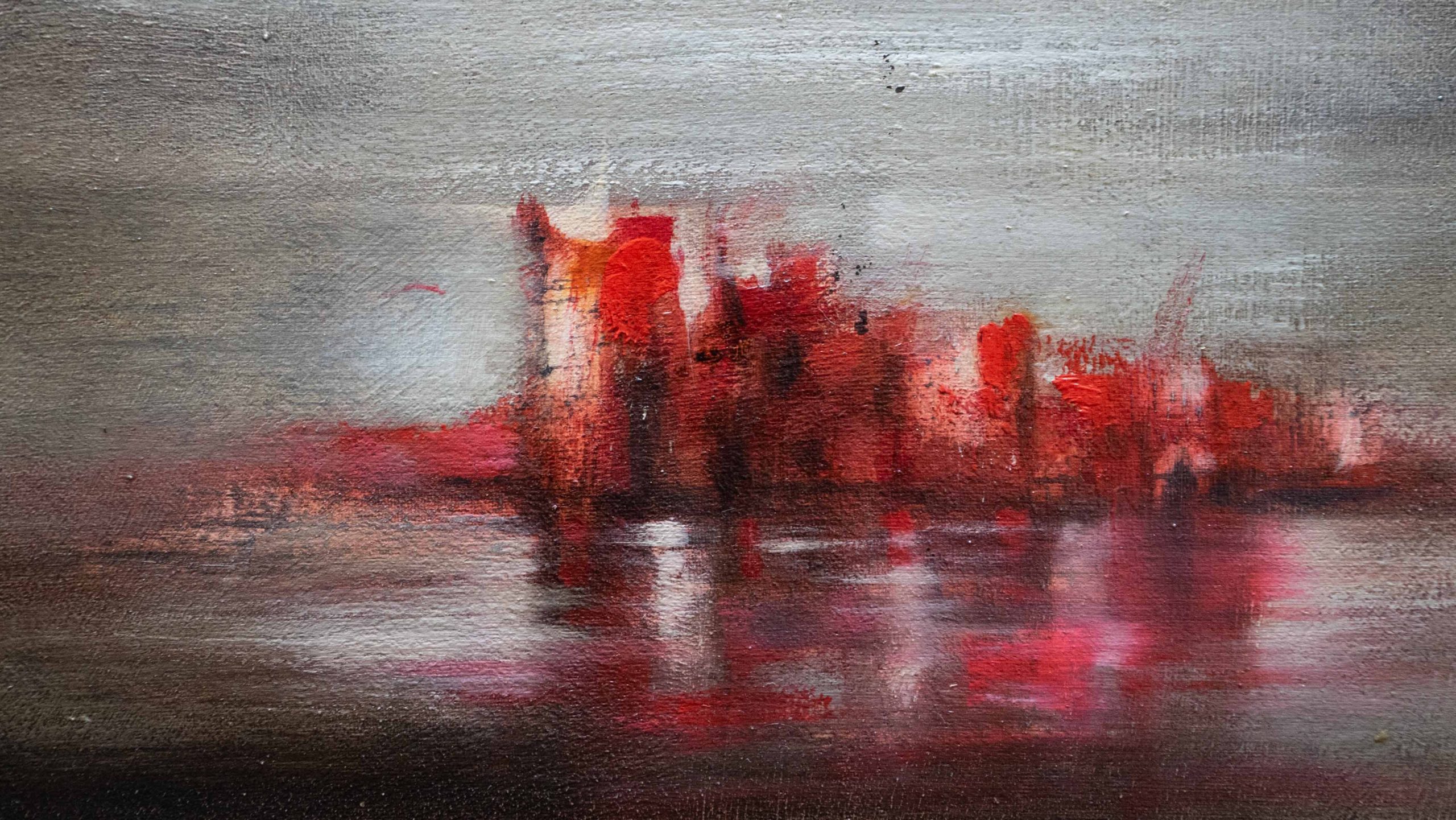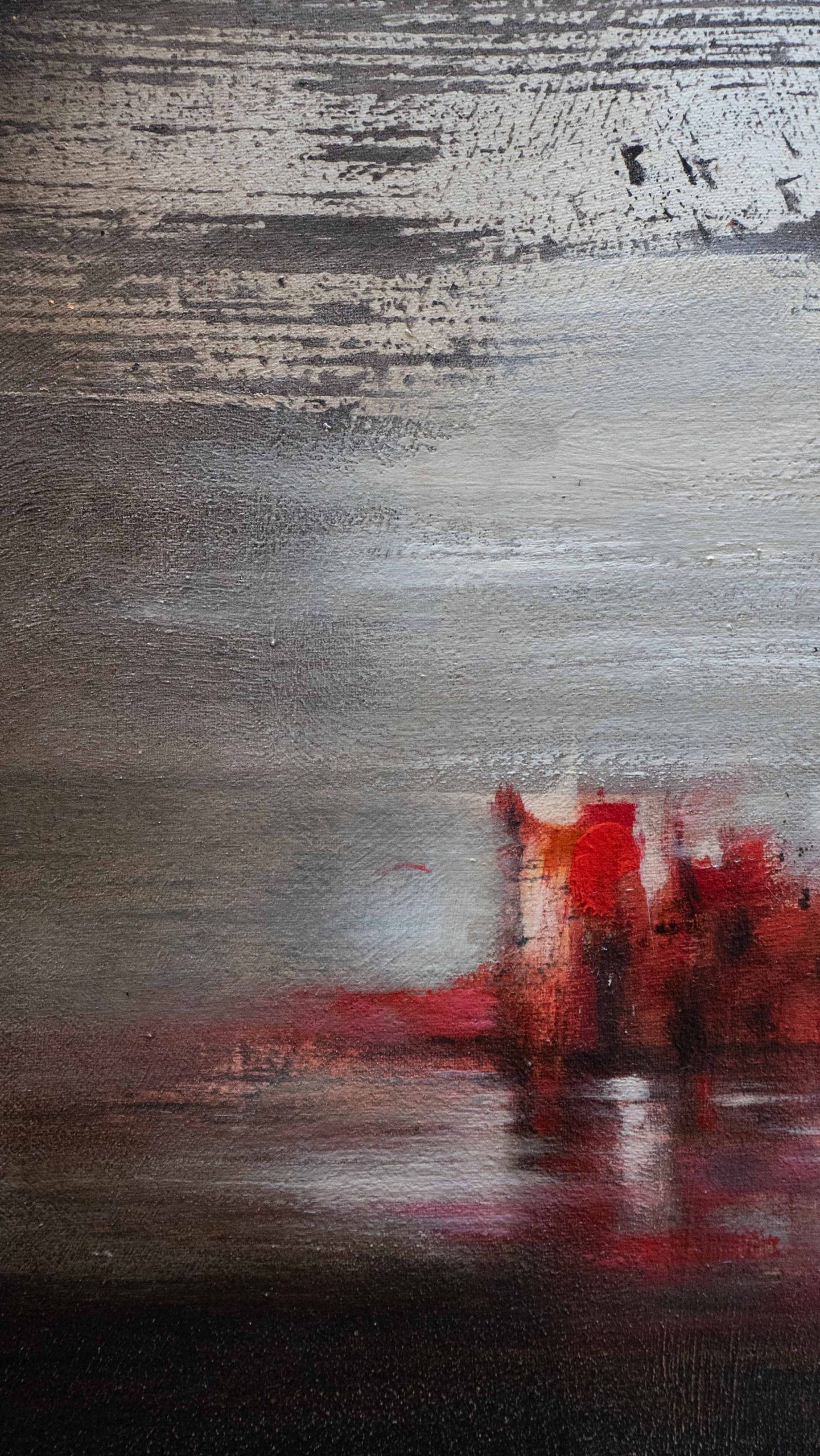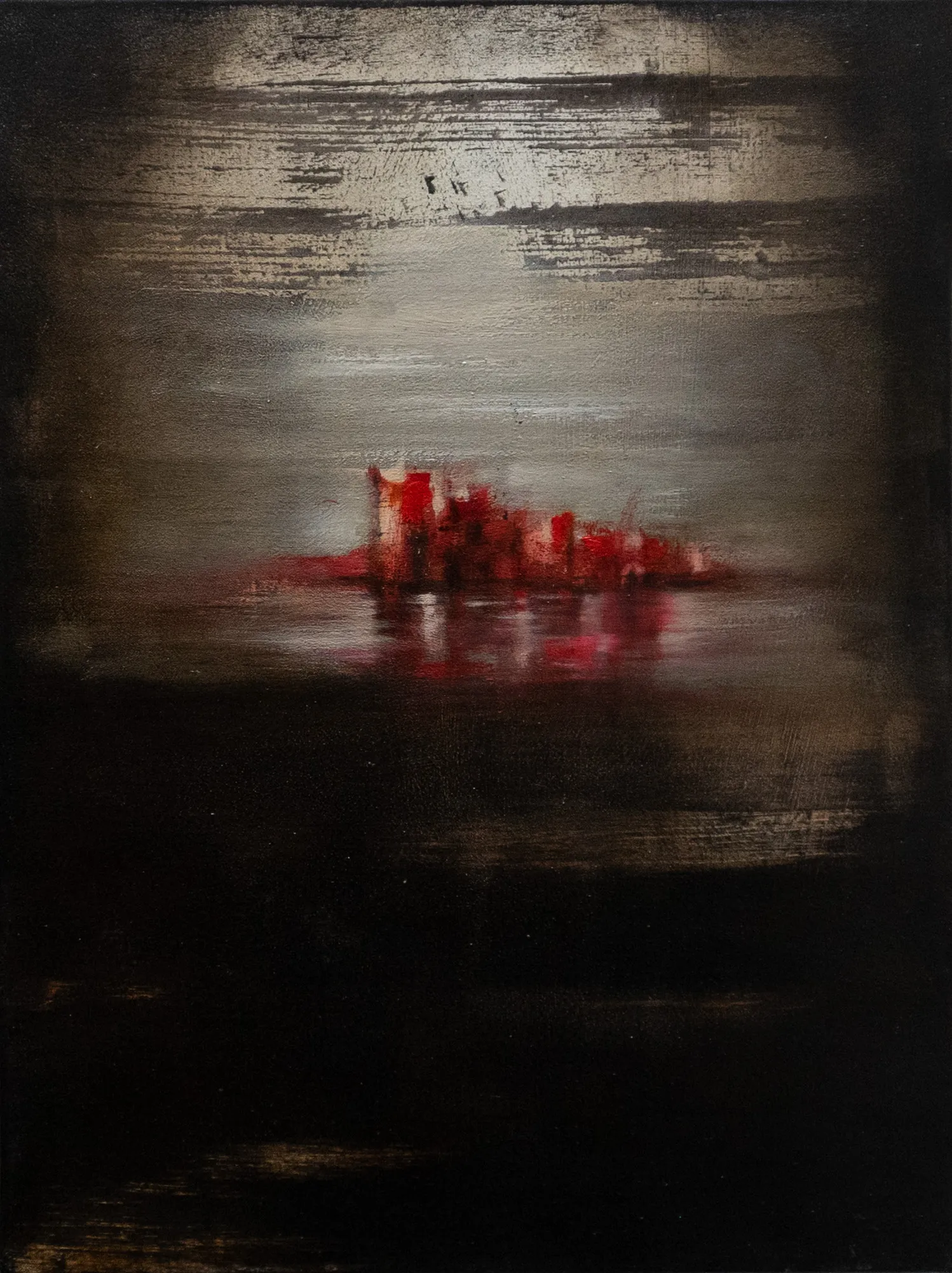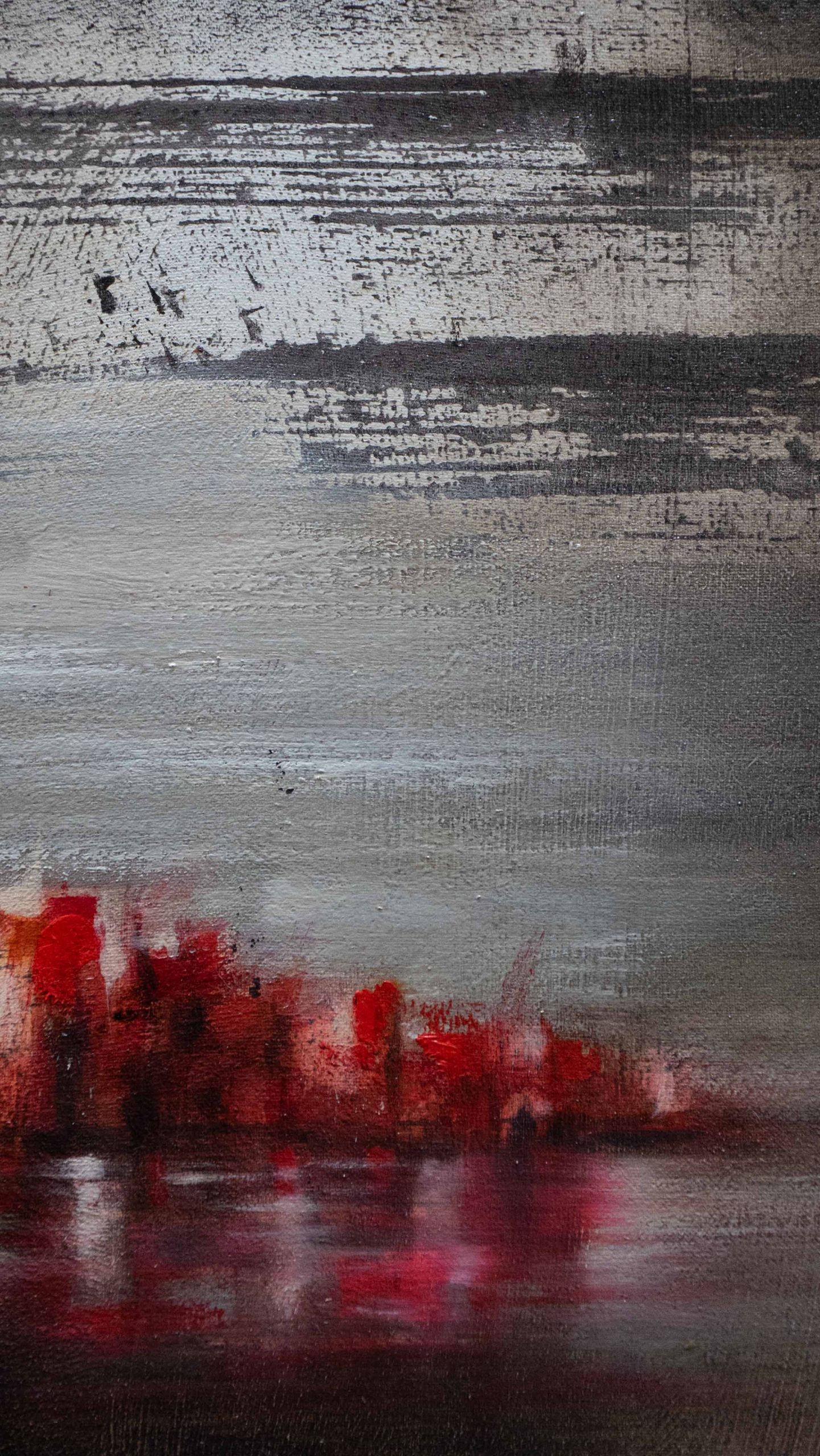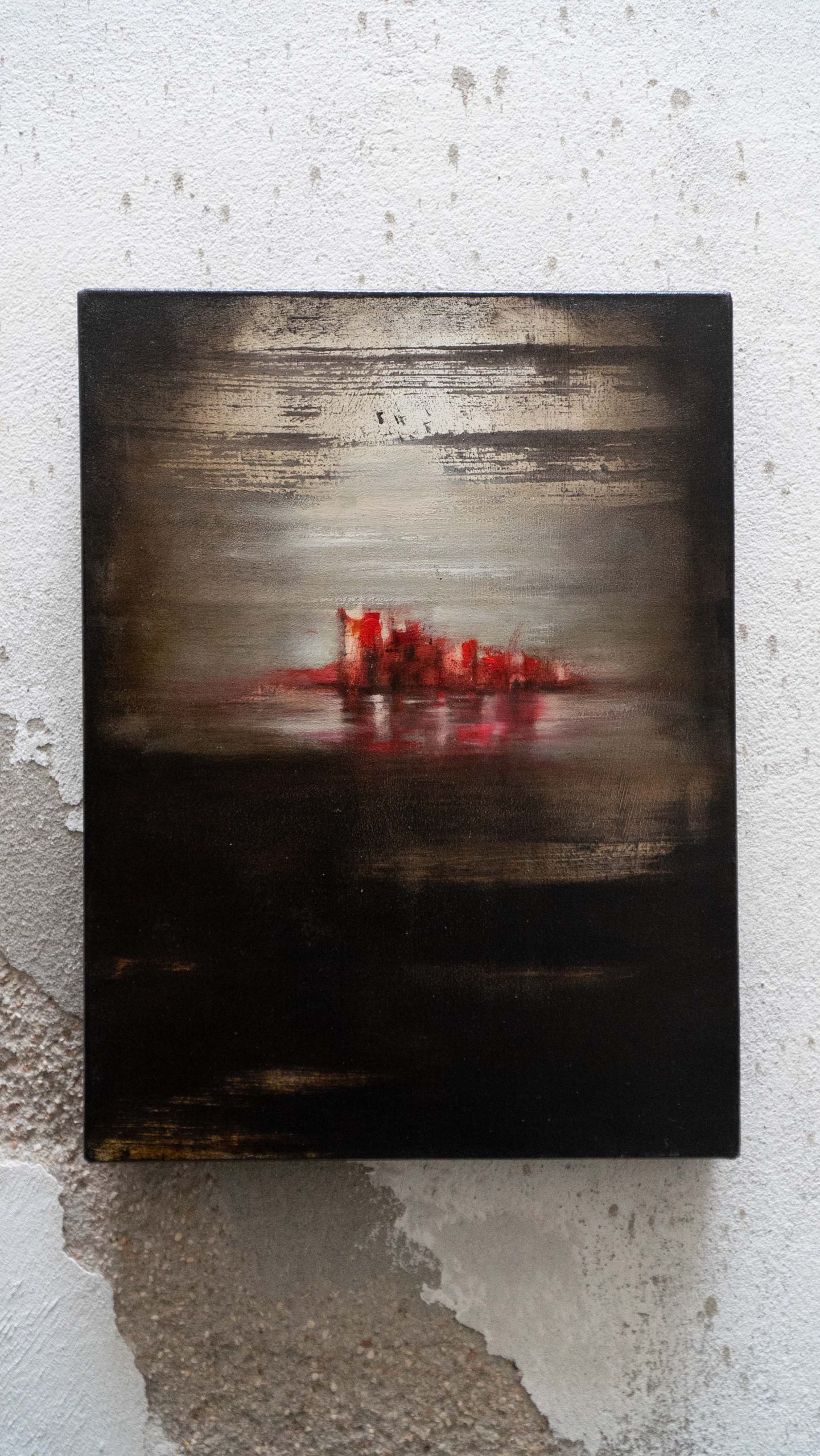 Un miraggio si materializza lungo la linea di orizzonte, un paesaggio fluttuante tra acqua e cielo. La tela è in puro cotone, con imprimitura realizzata a mano.