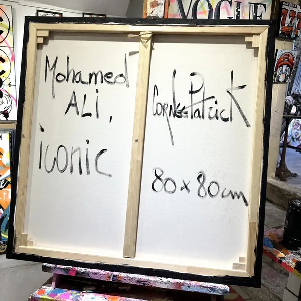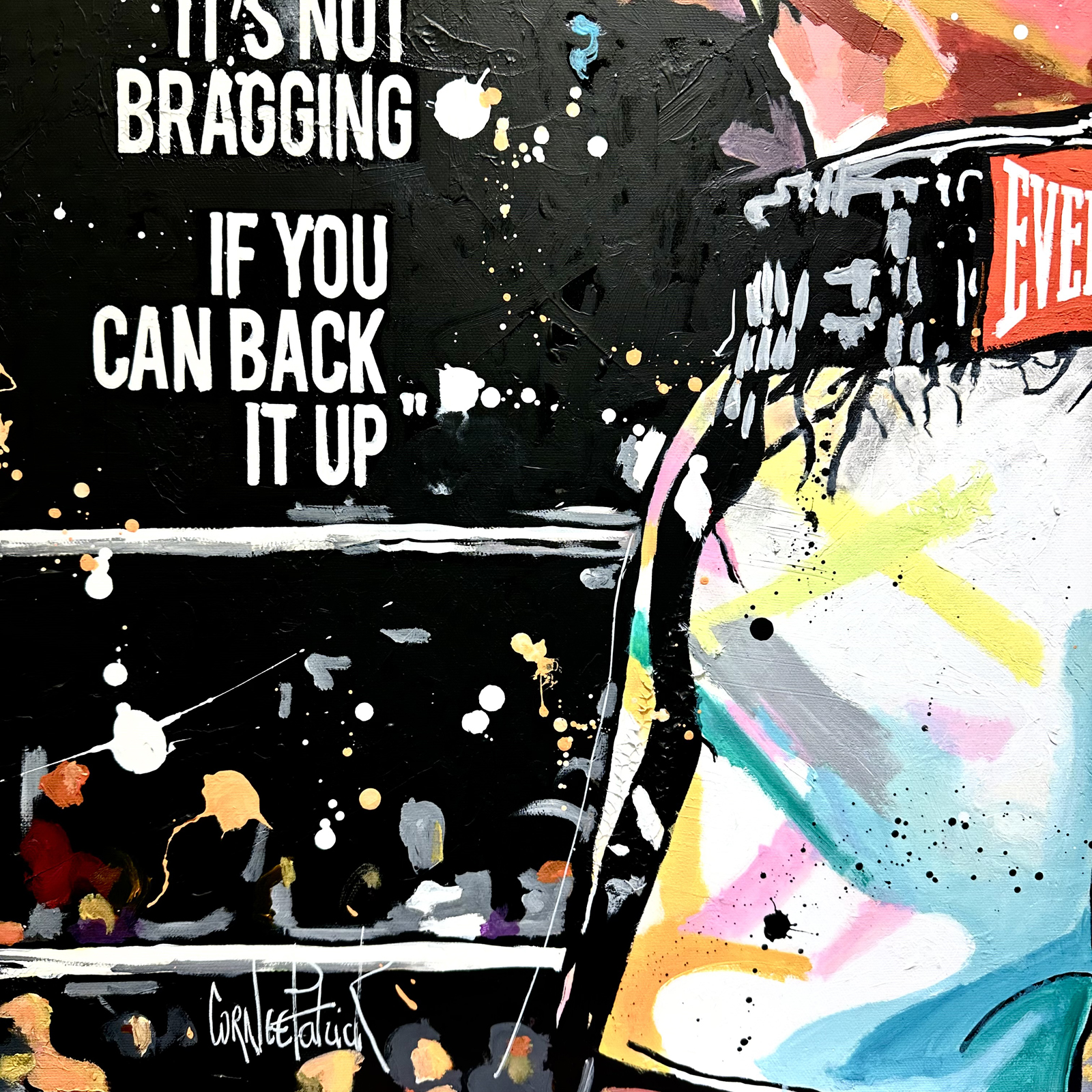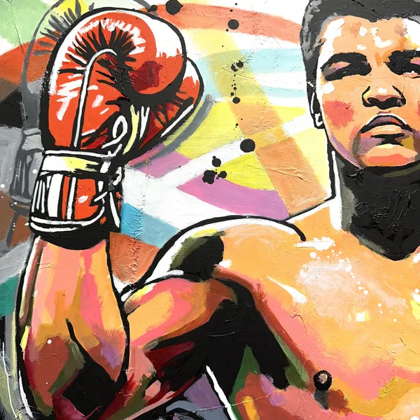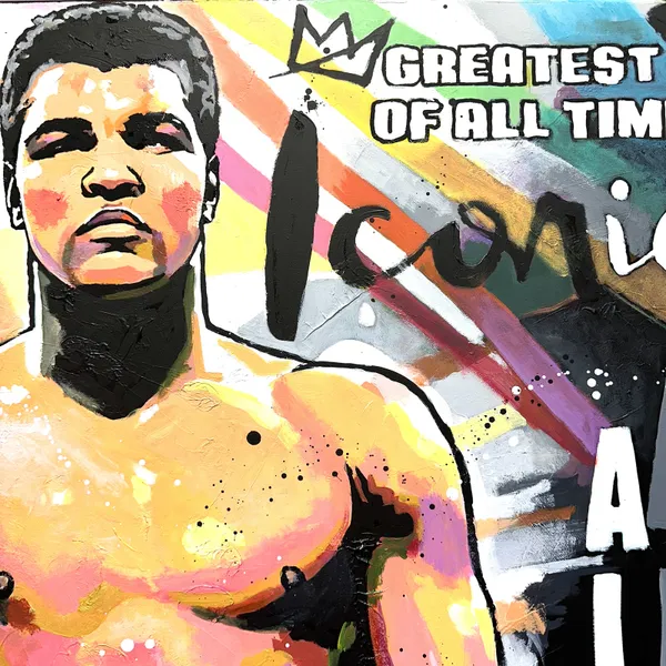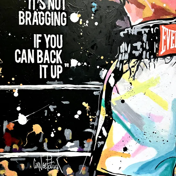 This vibrant and energetic painting pays tribute to a boxing legend. Boxer Muhammad Ali, gloves raised, expresses power and determination. The splashes of bright colour evoke the dynamism and intensity of the ring. The text 'Greatest of All Time' and 'It's not bragging if you can back it up' emphasises the confidence and fame of the central figure. The typographic elements and graphic patterns add depth and texture, creating a striking contrast with the main subject.
