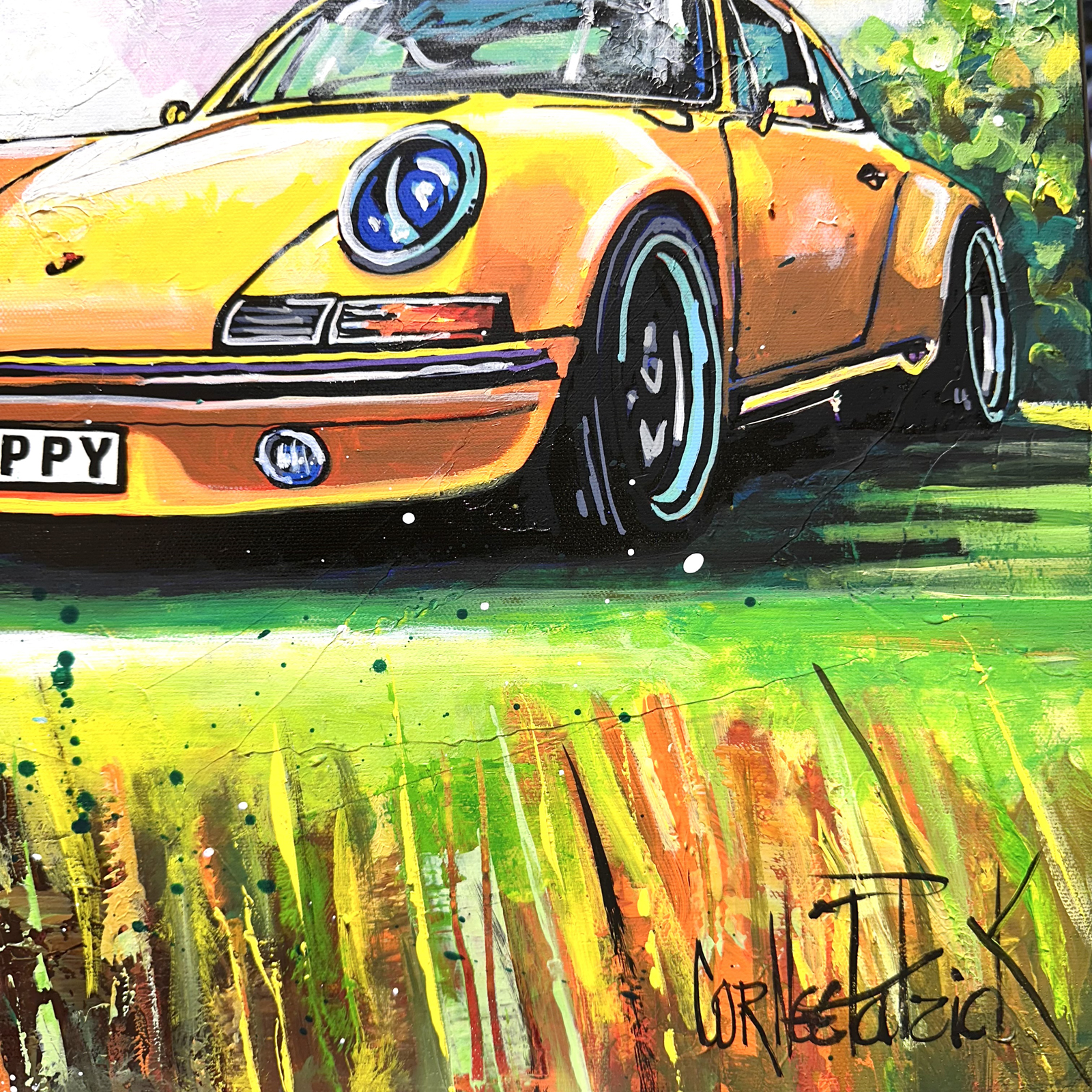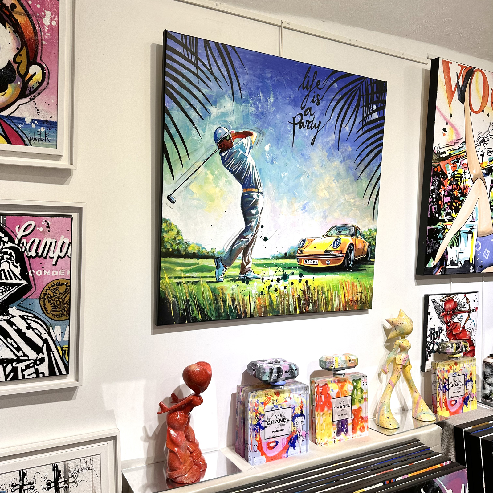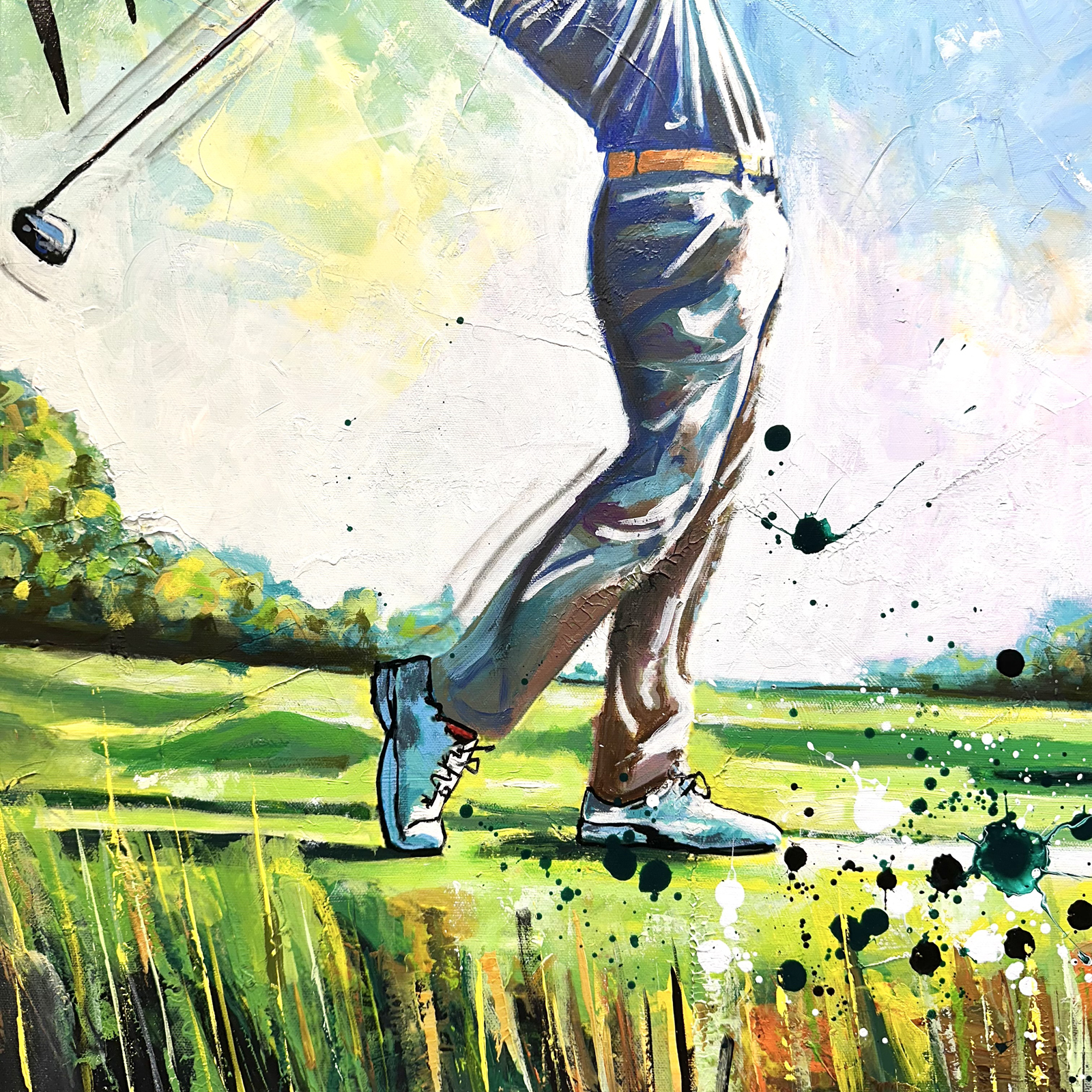 This captivating work depicts a golfer in full swing, immortalised in a moment of concentration and grace. The sky, vibrant with shades of blue and yellow, enhances the intensity of the scene. The lush green ground contrasts beautifully with the slender shadows of the palm trees, creating a paradisiacal setting. On the right, a retro sports car in bright orange tones adds a touch of glamour and nostalgia.