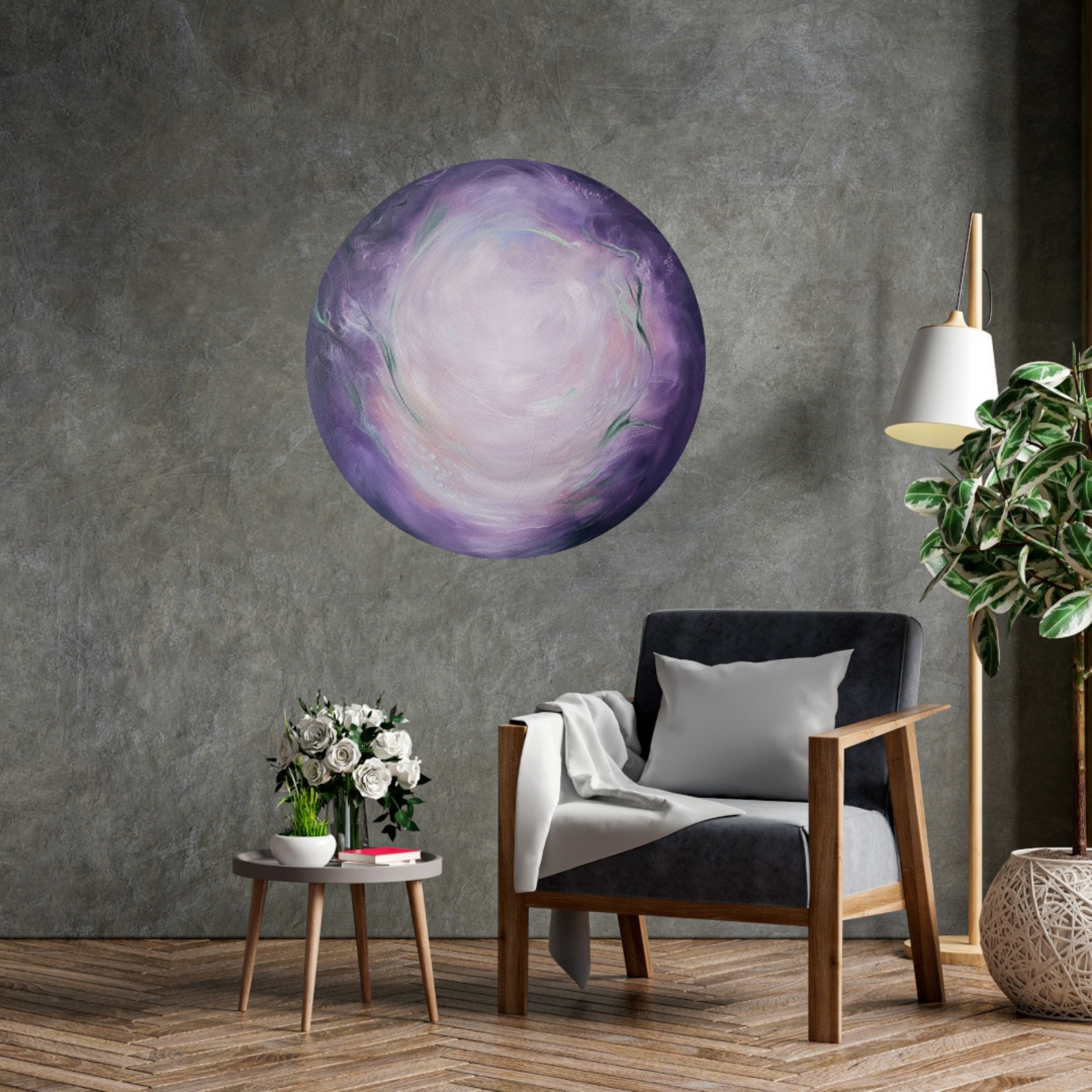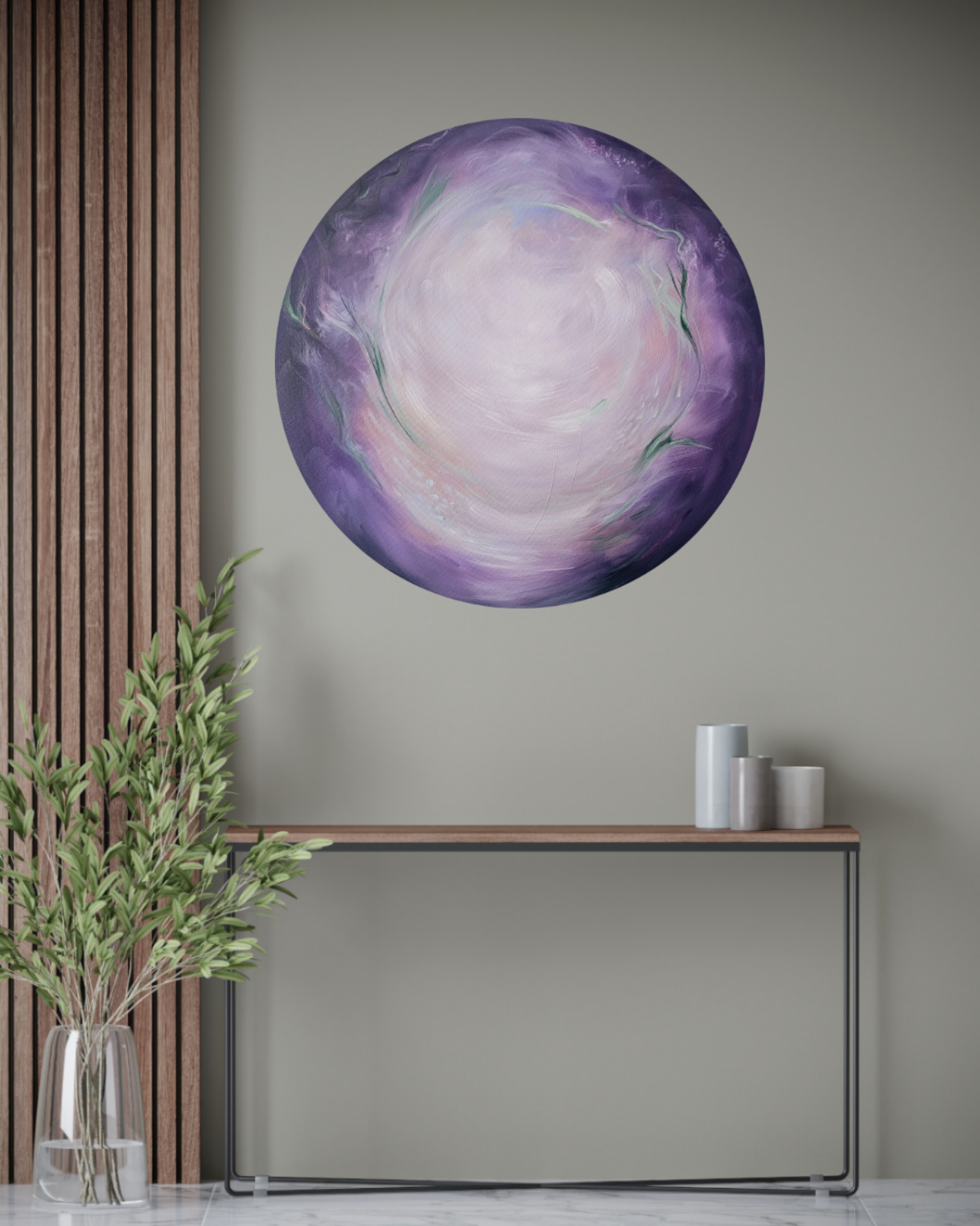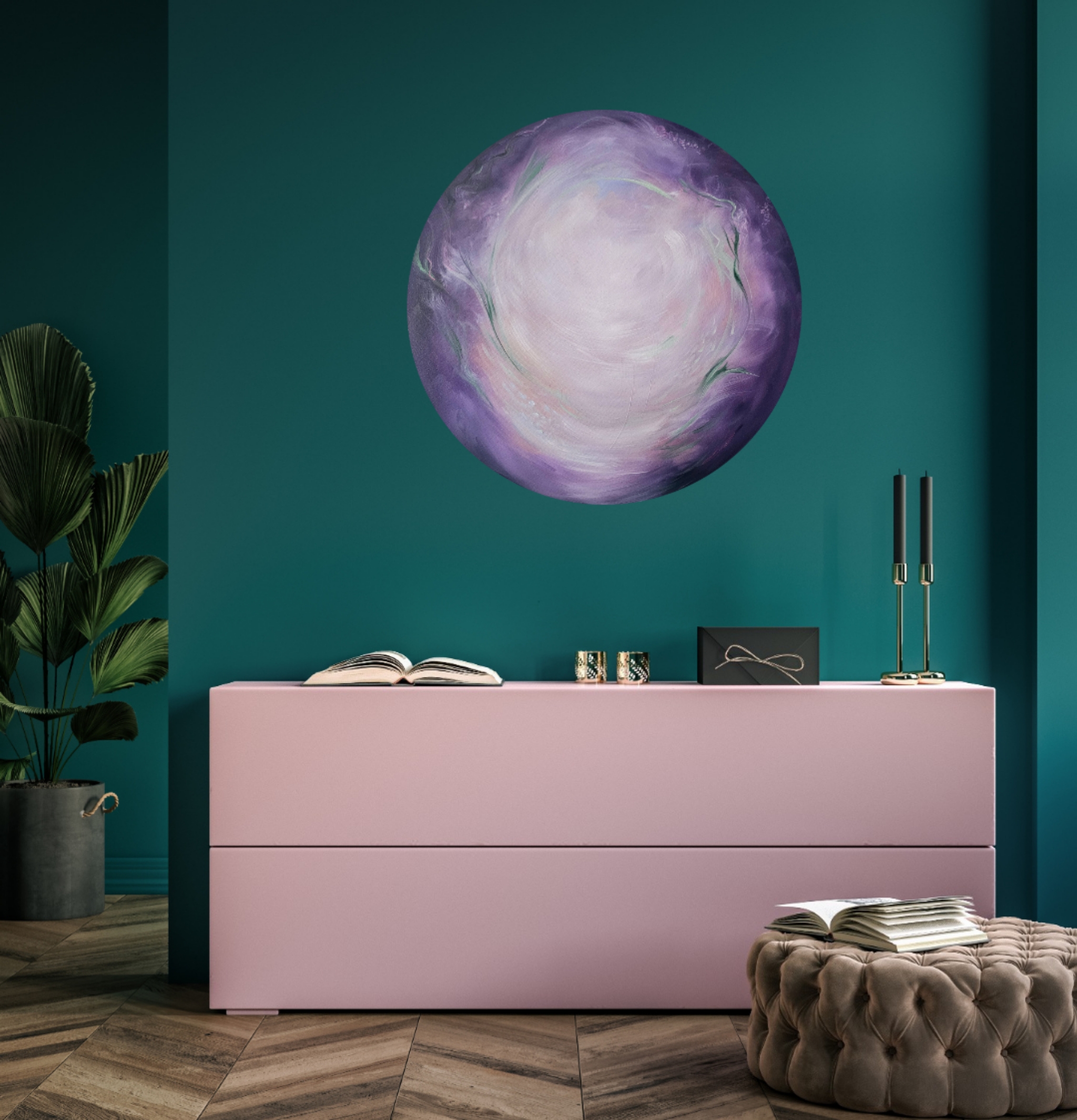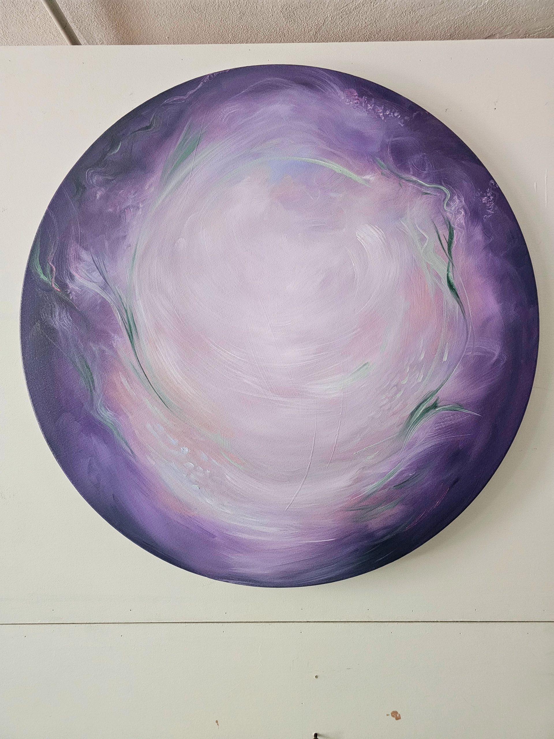 A perfectly round jewel of a painting, inspired by the violet ring around the moon in the summer. A vision I see when I gaze with my eyes softly focused at the night sky.