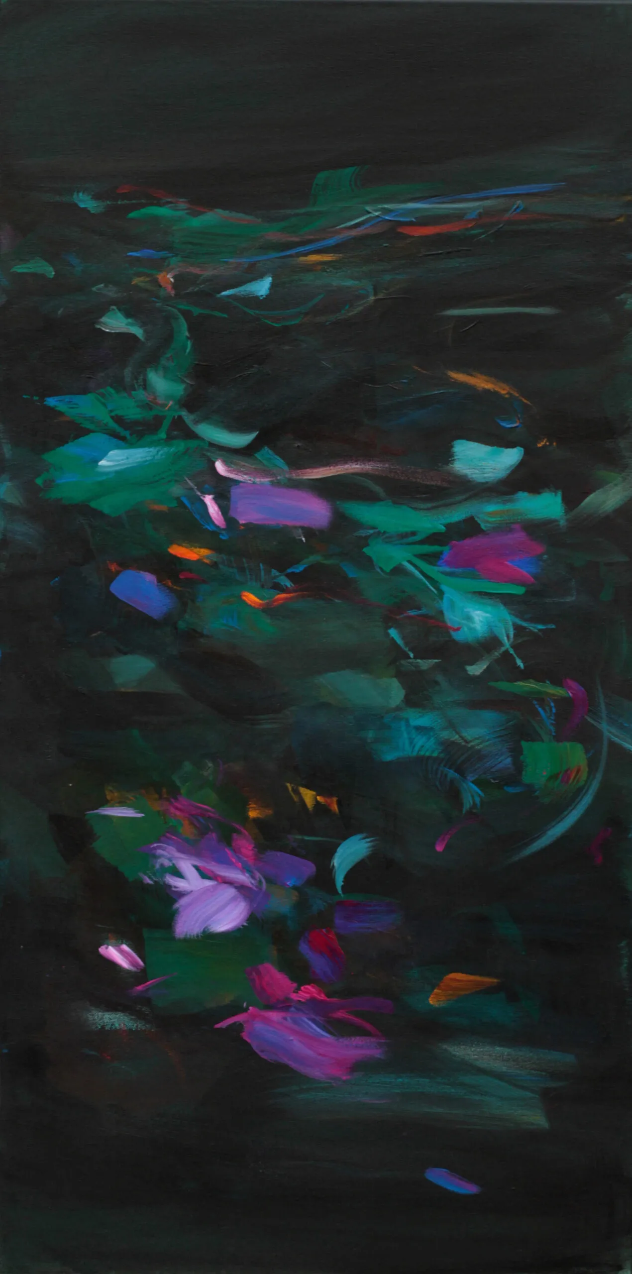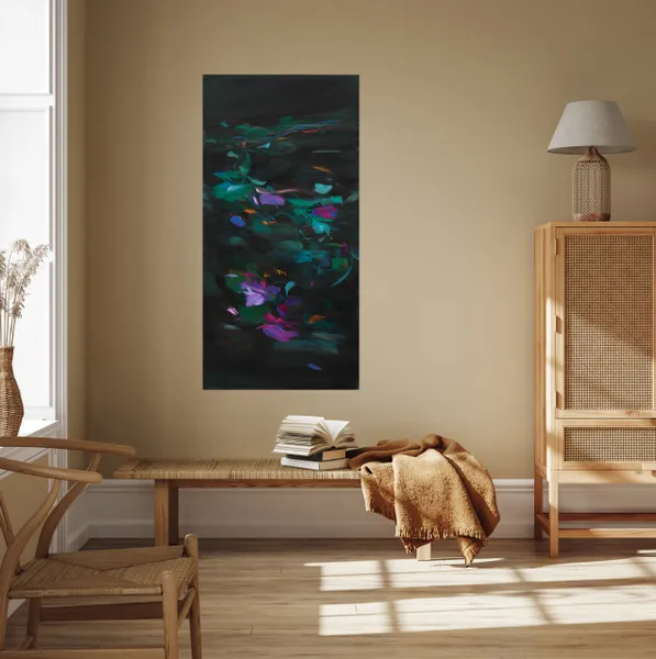As the year closes, light fades into the background, and frost blankets the leaves, powerful colors emerge from the shadows. "Moonlight Serenade IV" is an original, large abstract painting that captures this transition with dynamic energy. Crafted with highly pigmented acrylics on canvas, this piece comes ready to hang.The sides are painted black. A matte varnish, complete with UV protection, ensures the longevity. The artwork will be shipped in a crate, ensuring its safe arrival.