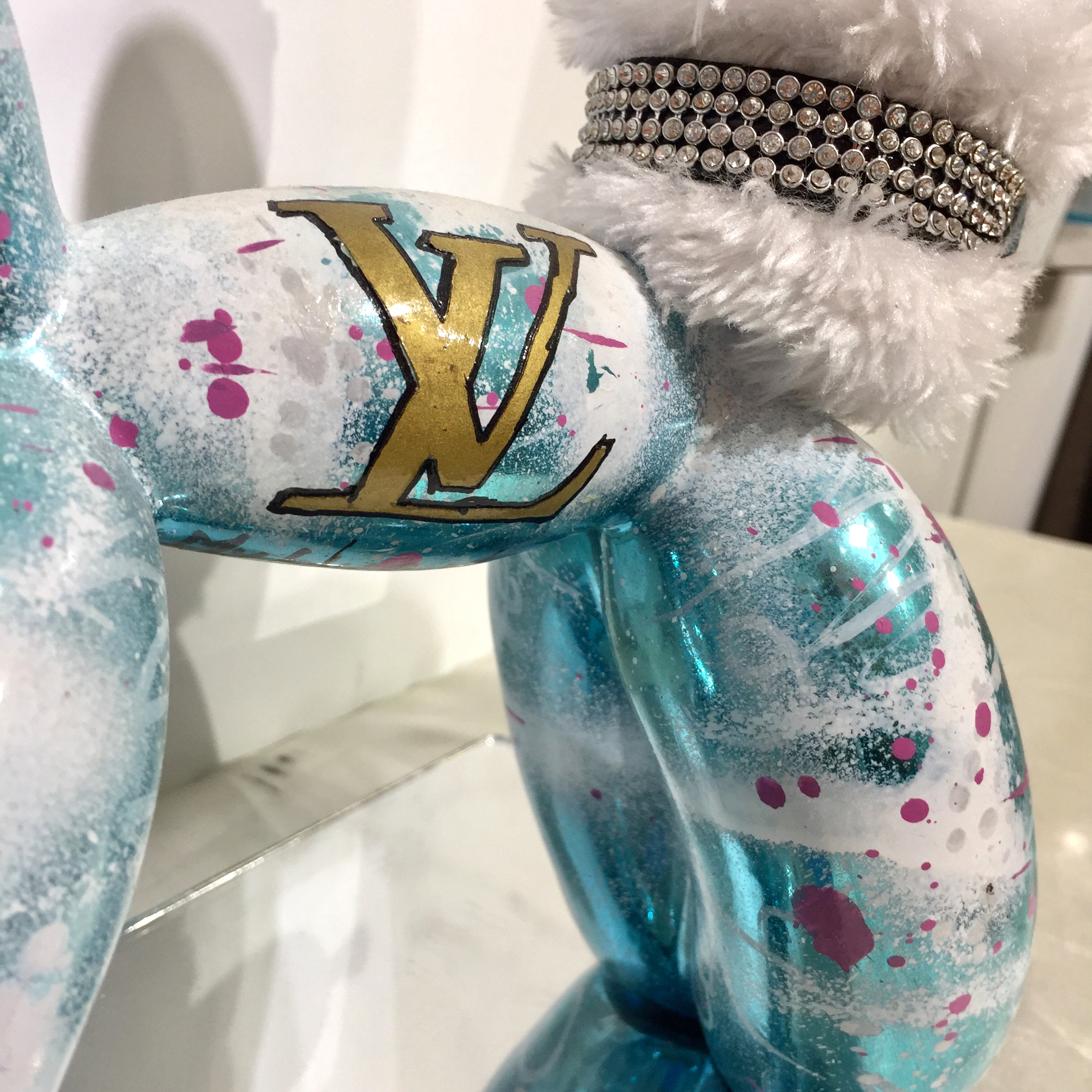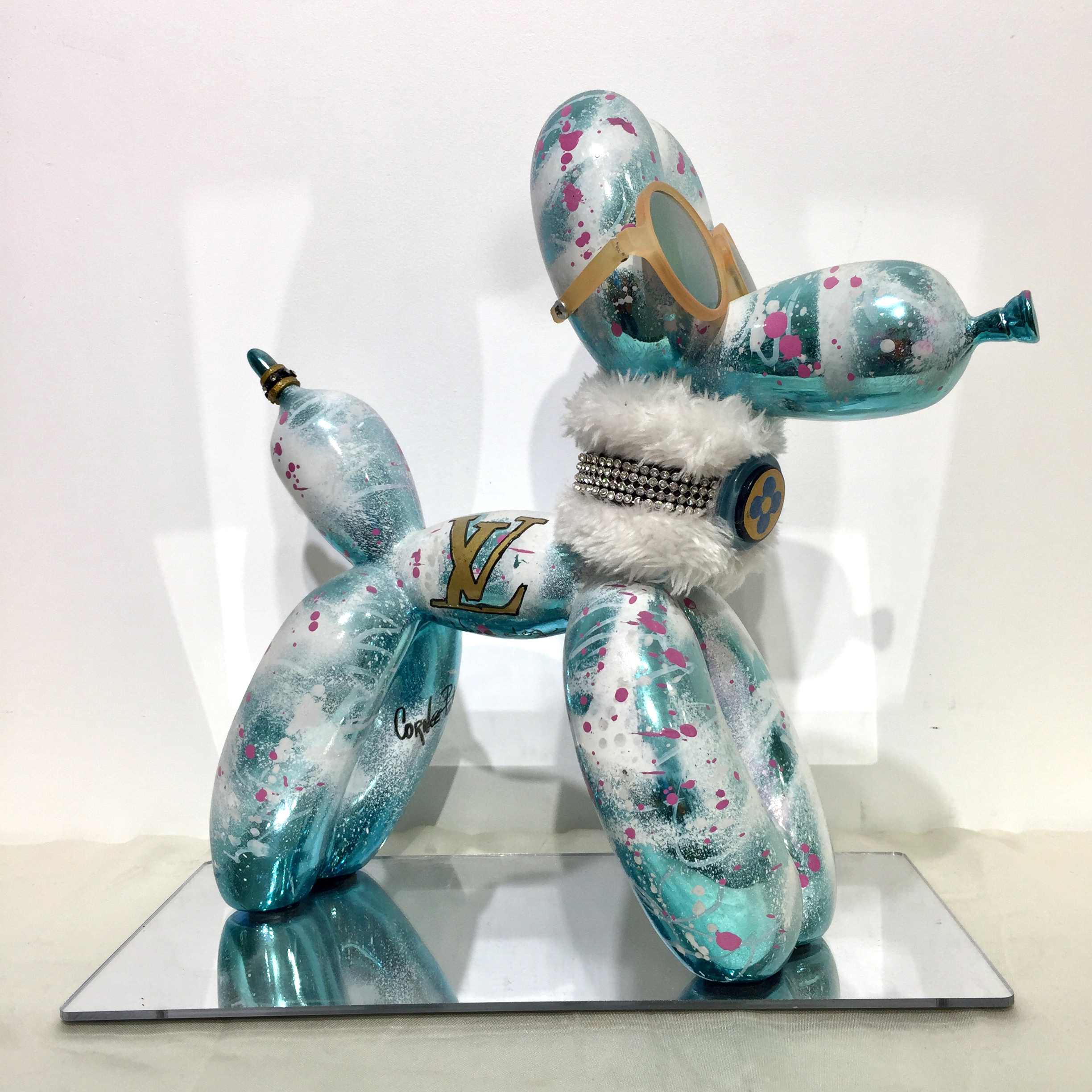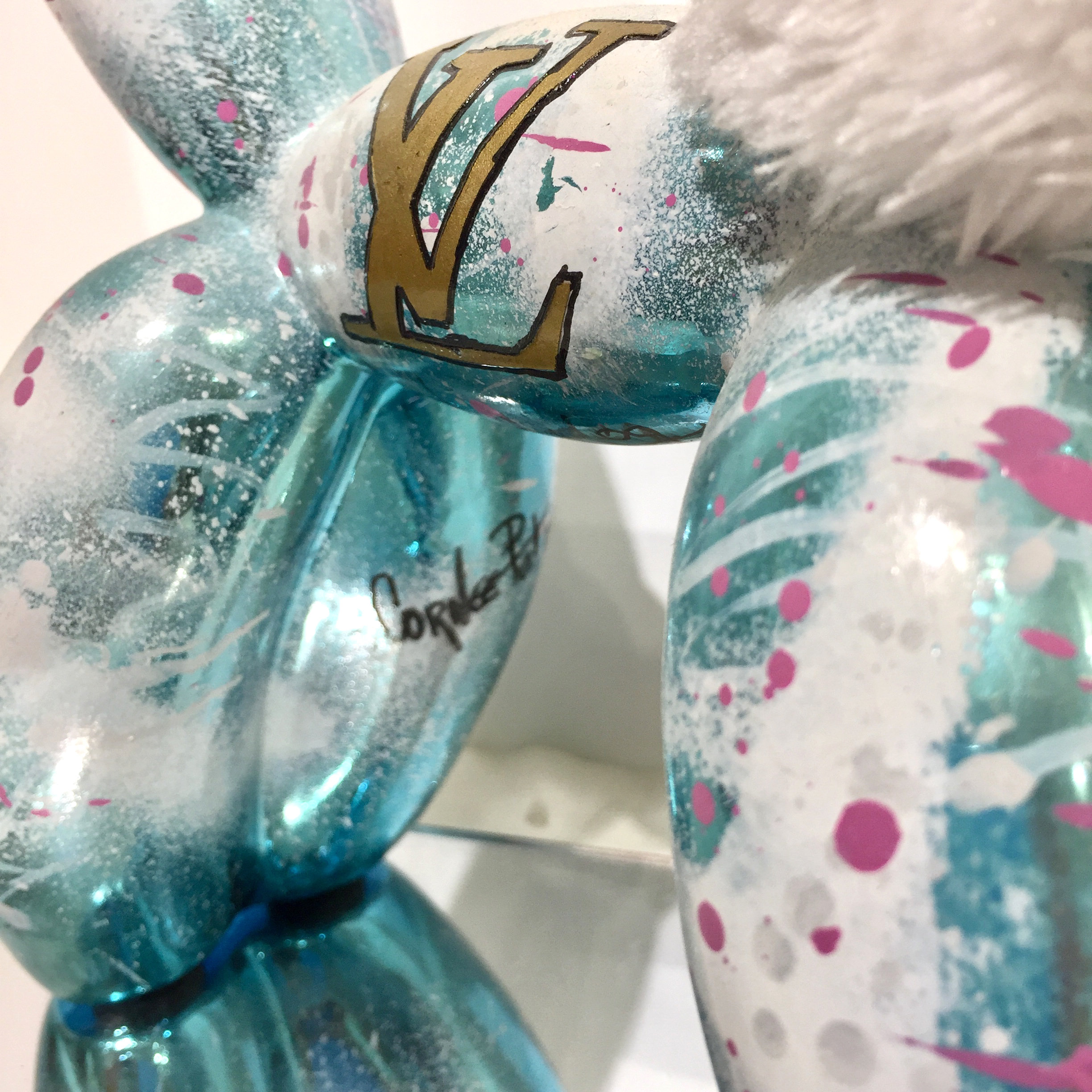 Chien ballon en résine graffiti, tagué Louis Vuitton, bleu et blanc, lunette de soleil, sur socle en plexiglass, style Jeff Koons Œuvre unique et originale signée par l’artiste peintre Patrick Cornée, livrée avec facture et certificat d’authenticité. La sculpture est vernie pour une meilleur protection de l'œuvre.