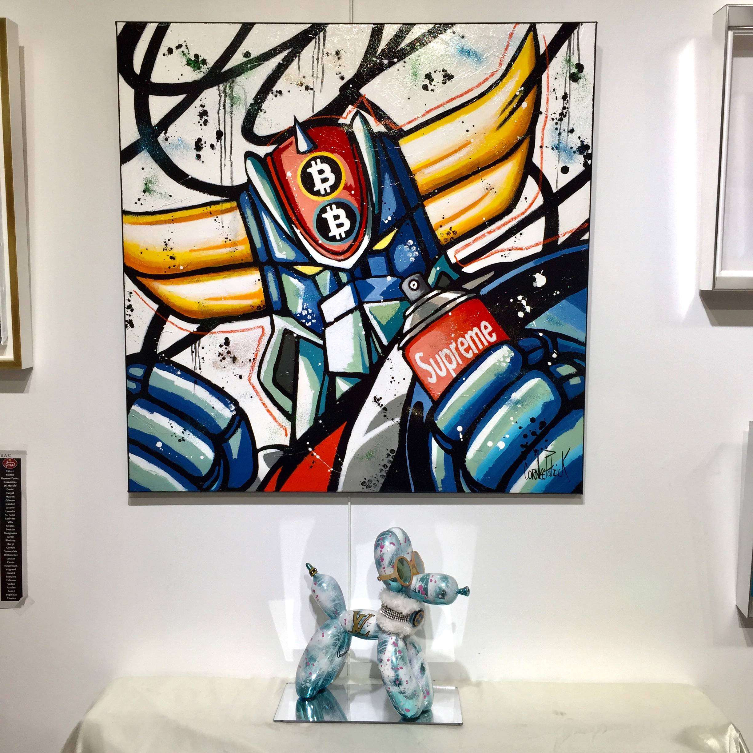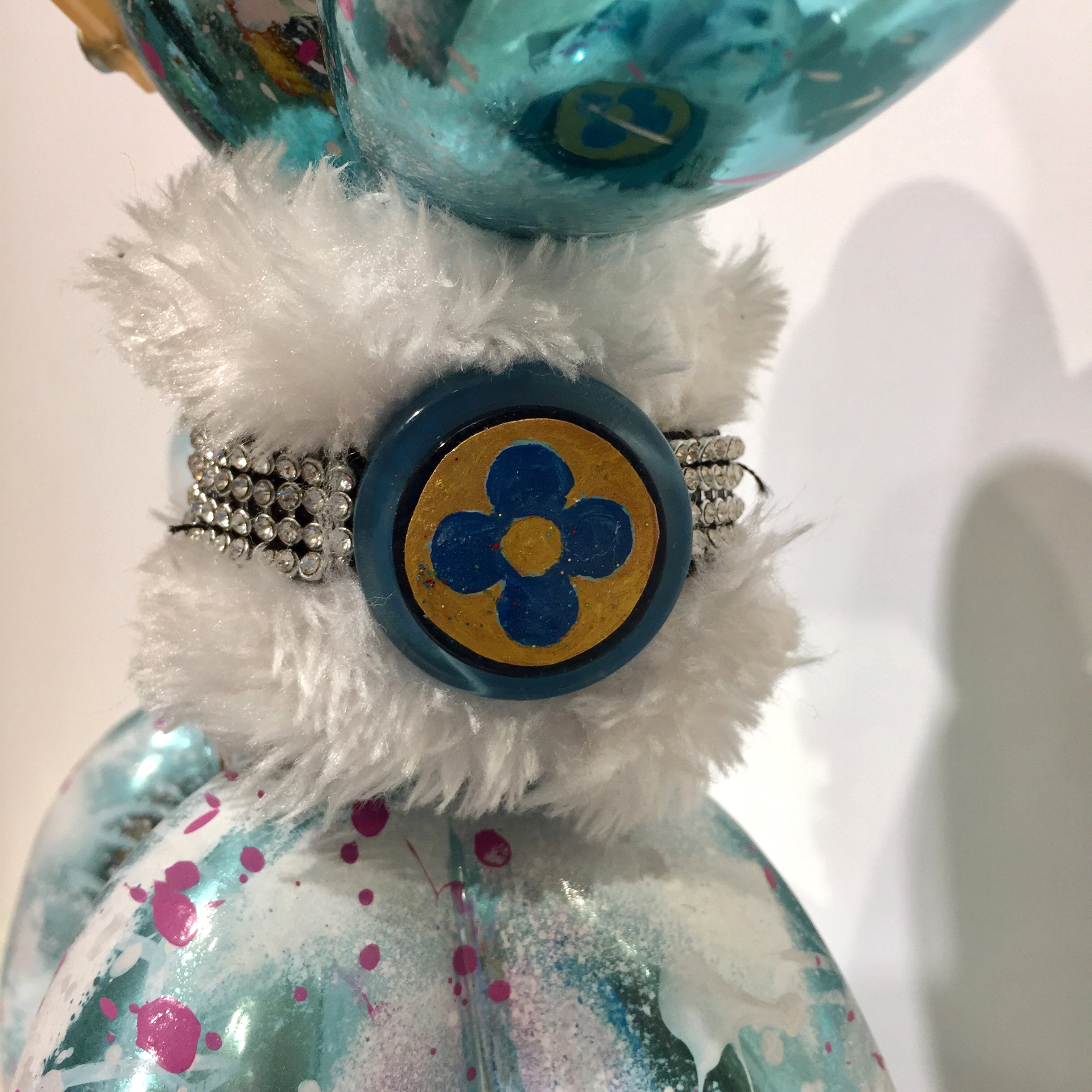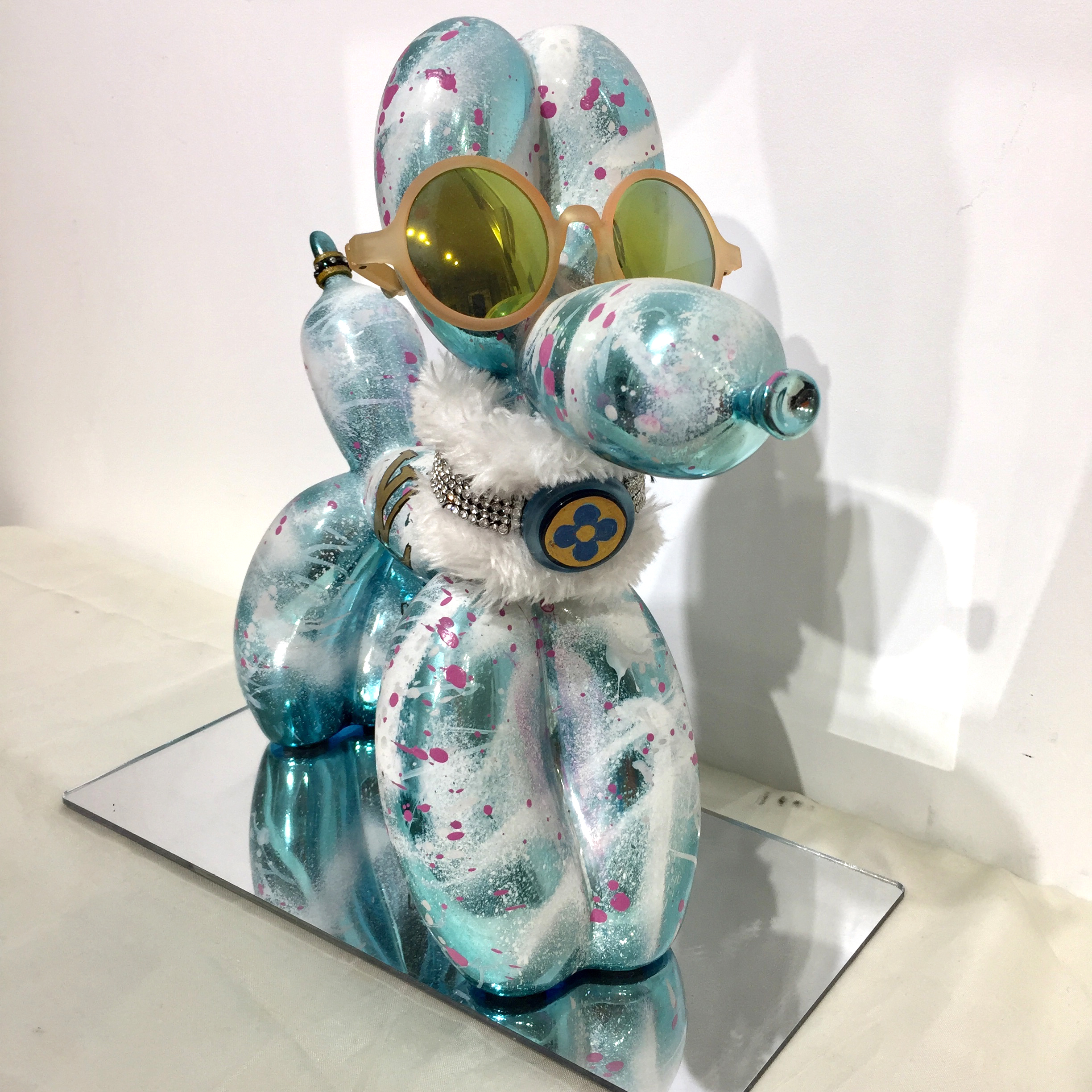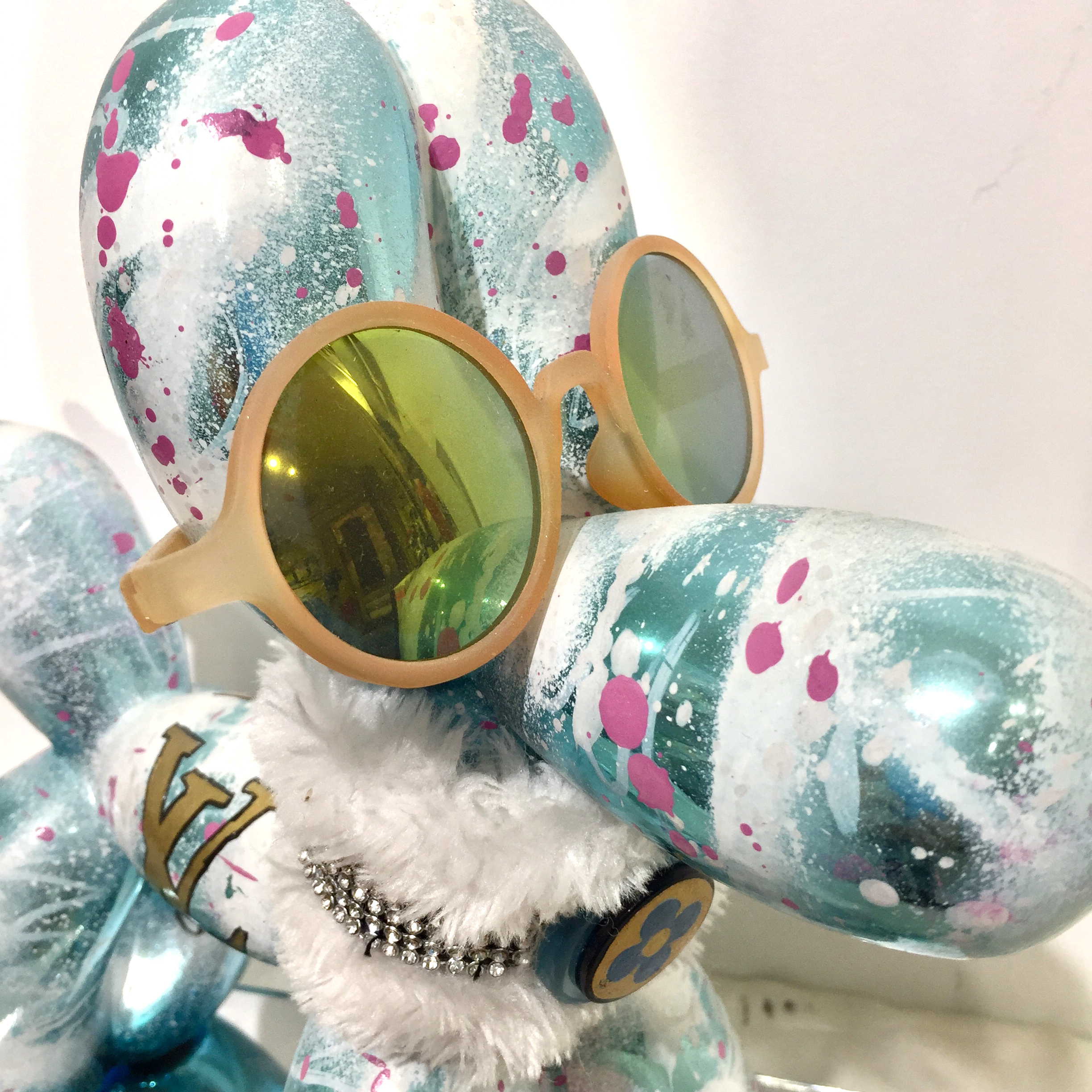 Chien ballon en résine graffiti, tagué Louis Vuitton, bleu et blanc, lunette de soleil, sur socle en plexiglass, style Jeff Koons Œuvre unique et originale signée par l’artiste peintre Patrick Cornée, livrée avec facture et certificat d’authenticité. La sculpture est vernie pour une meilleur protection de l'œuvre.