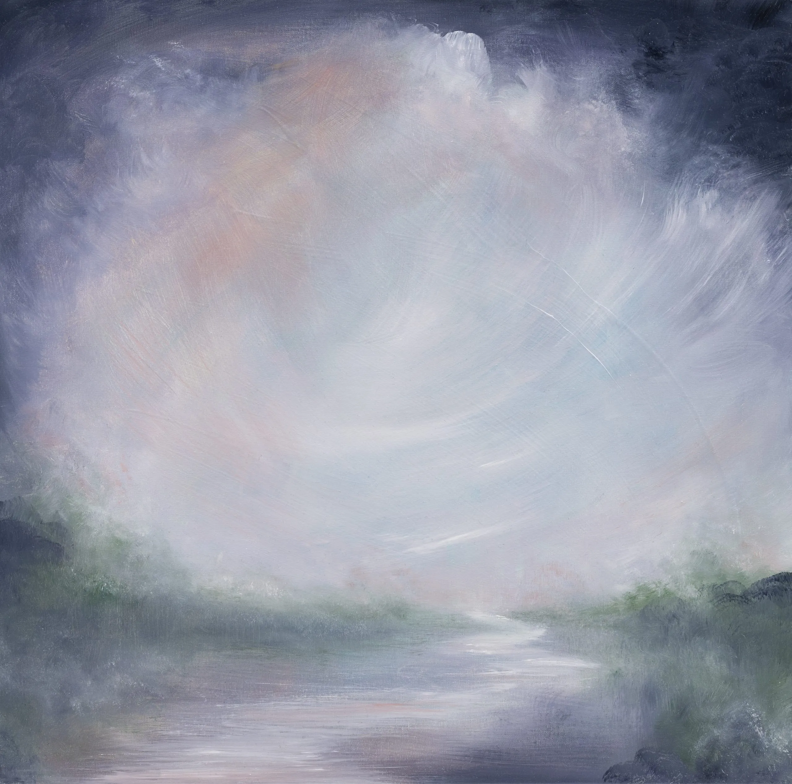 Nocturne is a soft abstract landscape painting dedicated to the coming of night, the turning of time, the river flowing. The river of time running through it. The light in this painting is ephemeral, and I feel a sense of the coming of day or the veil of night when I look upon it. A landscape that may appear dark and foreboding, and also a hopeful renaissance, a rebirth of the light. The idea of a landscape with the everlasting beauty and power of a river.