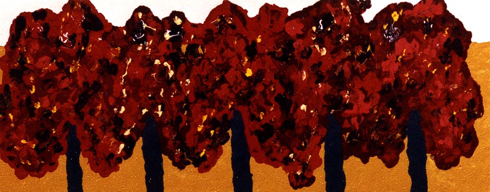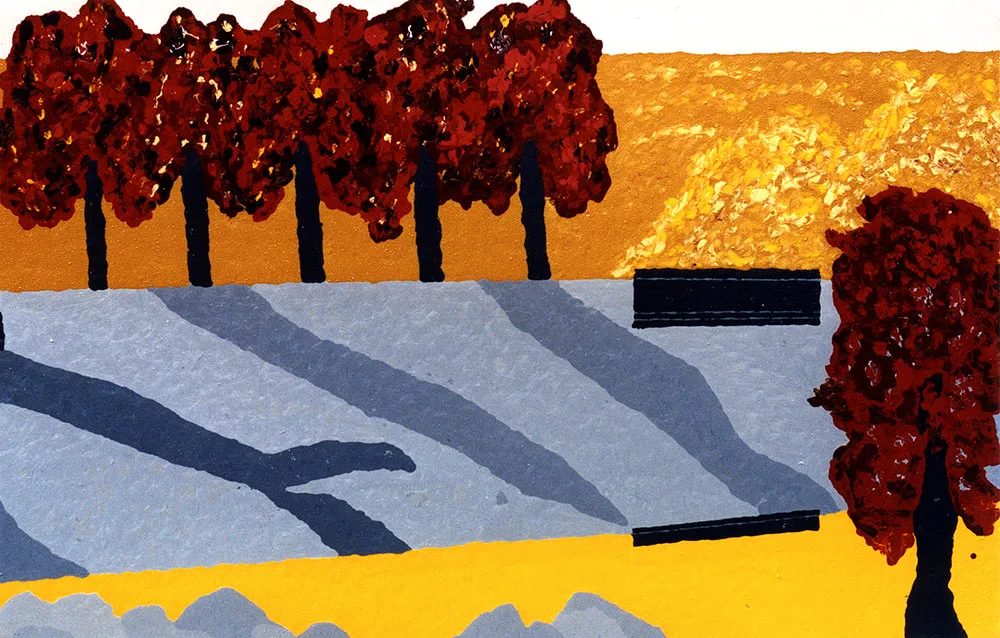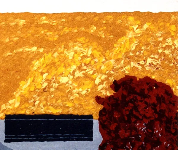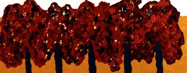 The composition is minimalist yet dynamic, capturing the serene and vibrant essence of autumn. The use of simplified shapes and colors displays an abstract interpretation of nature, inviting us to explore the balance between simplicity and complexity. This piece is a representation of seasonal transition, combining abstraction with a vivid and harmonious color palette.