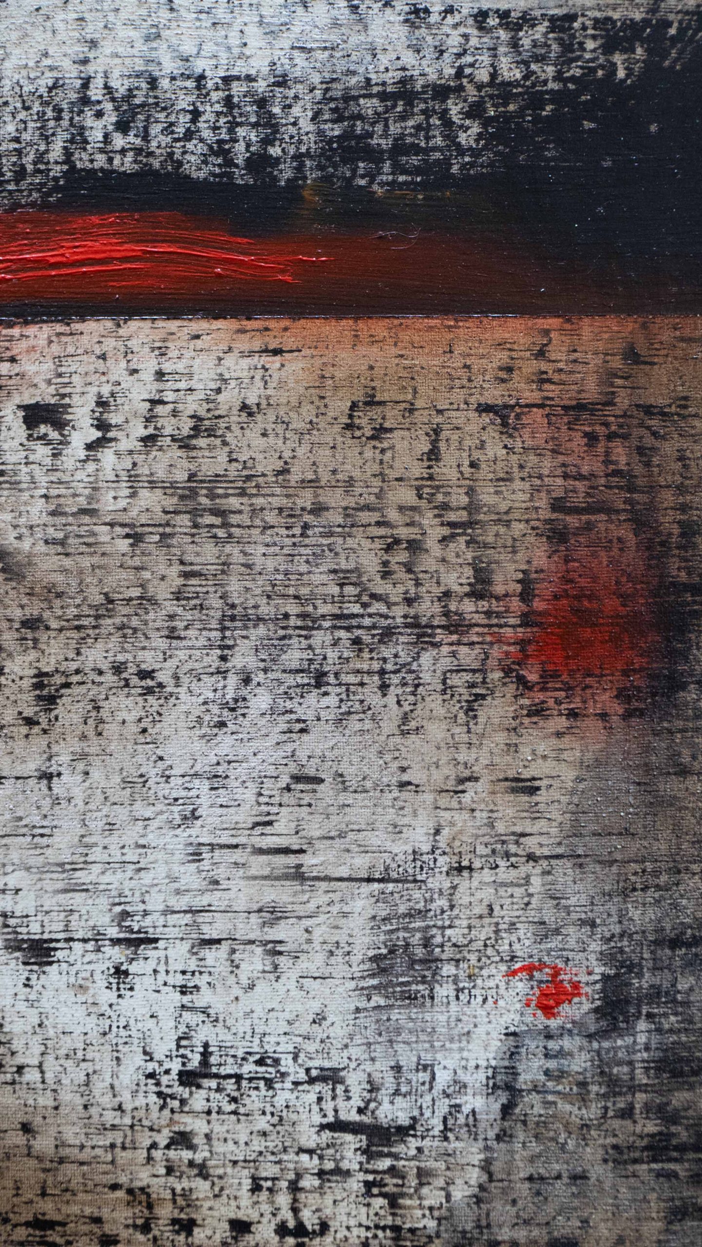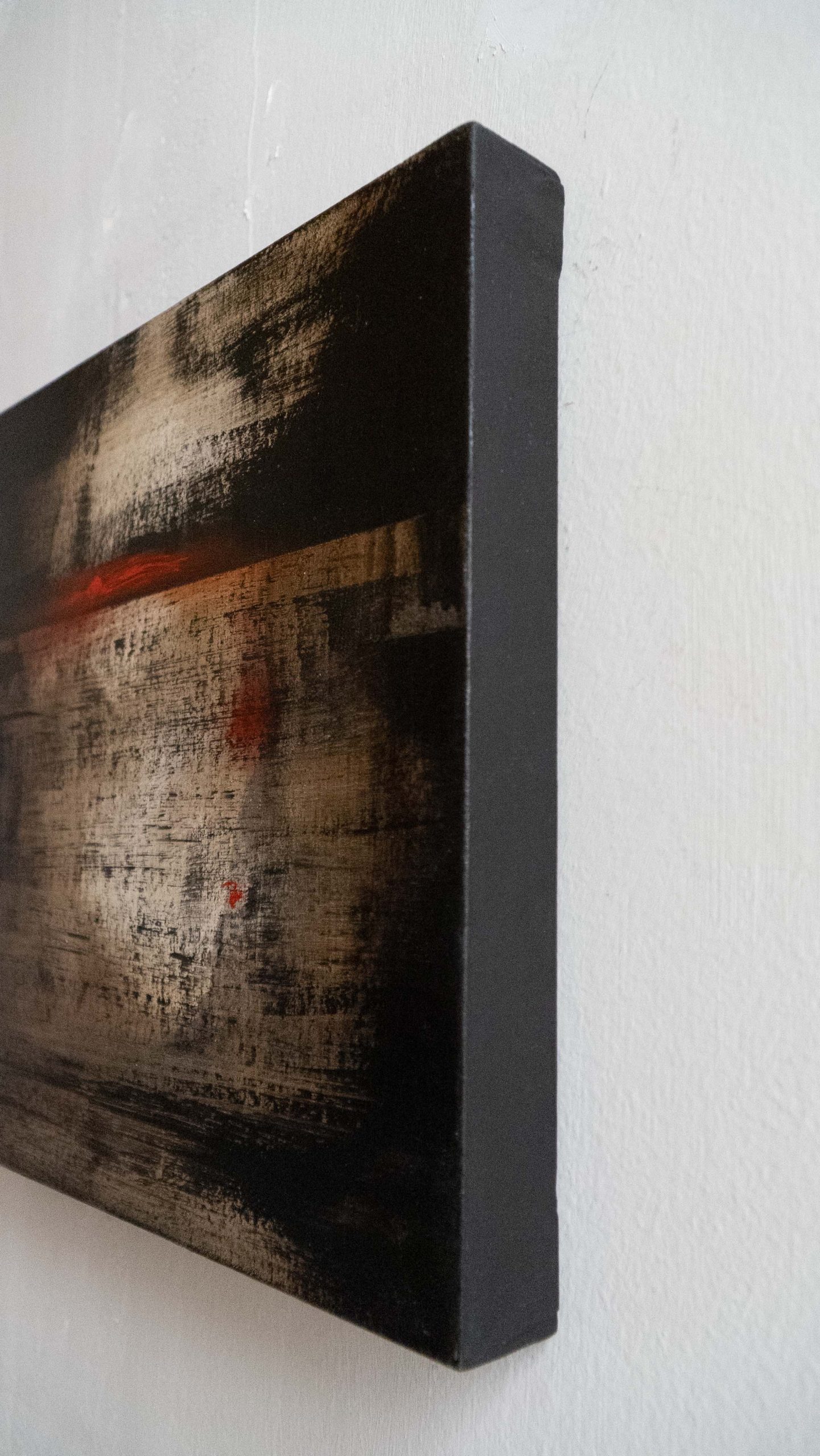 Questa serie di dipinti, simili per colori e tecnica, gioca sulla linea di orizzonte che divide cielo e terra. Sono tramonti immaginari, squarci di luce e ombre, visioni. In questa opera, lungo la linea di orizzonte, si materializza l'ombra della sera. La tela è in puro cotone, con imprimitura realizzata a mano.