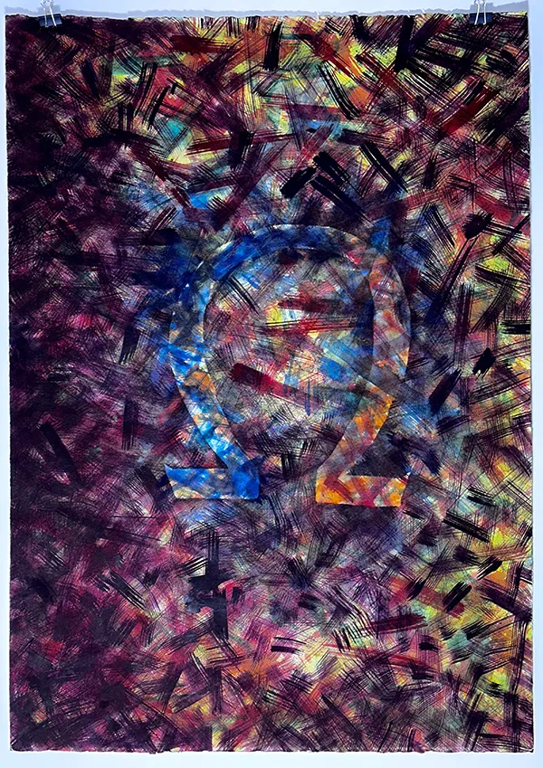 Omega est un des dessins de technique mixte, (aquarelle, encre, acrylique), des dix lettres en capitales de l'alphabet grec qui se différencient par leur architecture de l'alphabet romain. Ce travail est autant une réminiscence de ma culture classique de la typographie au plomb et du dessin de la lettre, que le témoignage de mon attachement à Symi une petite île grecque du Dodécanèse. Dessin sur papier d'Arches grain torchon 100% coton 600g/m2 sans acide et sans chlore.