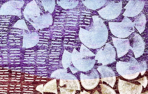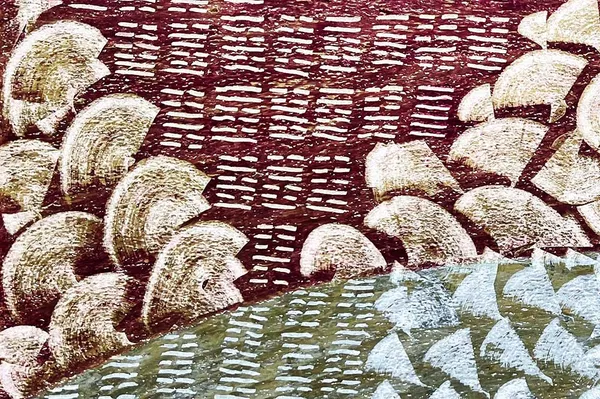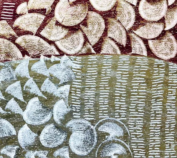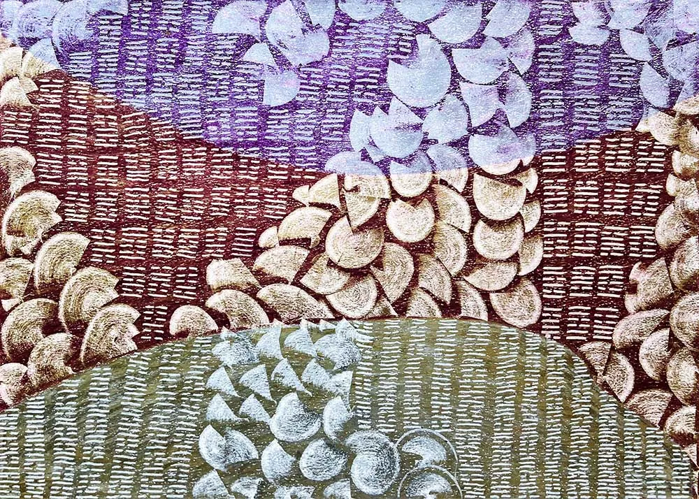 The piece is a symphony of tones, meticulously layered with nuances of silver, gold, and red, evoking a serene and dynamic atmosphere. The crescents overlap, forming clusters that evoke natural formations. Each cluster is set against a background of lines forming various hexagrams, adding depth and a grid-like structure that counteracts the organic curves. The play of light and shadow between the crescents provides a three-dimensional quality that invites close observation.
