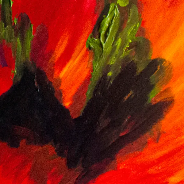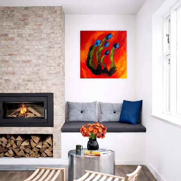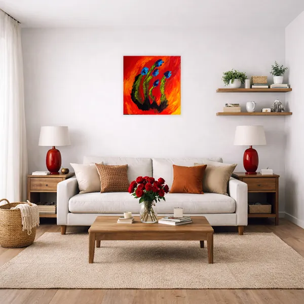 This painting is created through direct, expressive brushwork, allowing color and gesture to emerge instinctively. Vibrant reds and oranges form a radiant field from which green, plant-like forms rise and lean, punctuated by blue accents. Influenced by nature, growth, and inner vitality, the composition evokes organic movement and resilience, favoring emotional rhythm and spontaneity over representation.