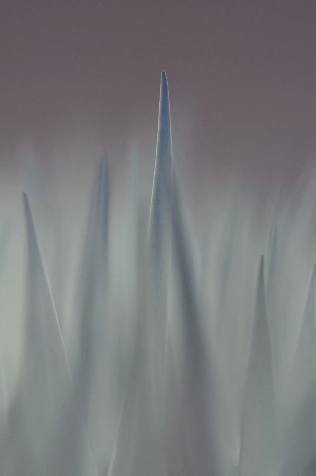 Out Of Focus - II est issue d'une série de macrophotographies réalisées à partir d'une micro forêt d'épines d'acacia laquées blanc, avec des reflets de couleurs sourdes. Ces images à la poésie plastique étrange est le témoignage de la mélancolie qui infuse lors de la perte du travail entraînant l'effondrement du statut social, et pour un homme la chute de sa virilité.