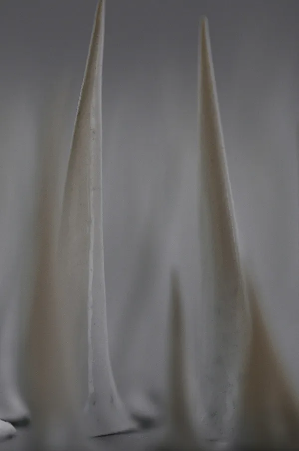 Out Of Focus - IX est issue d'une série de macrophotographies réalisées à partir d'une micro forêt d'épines d'acacia laquées blanc, avec des reflets de couleurs sourdes. Ces images à la poésie plastique étrange est le témoignage de la mélancolie qui infuse lors de la perte du travail entraînant l'effondrement du statut social, et pour un homme la chute de sa virilité.