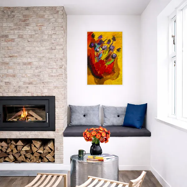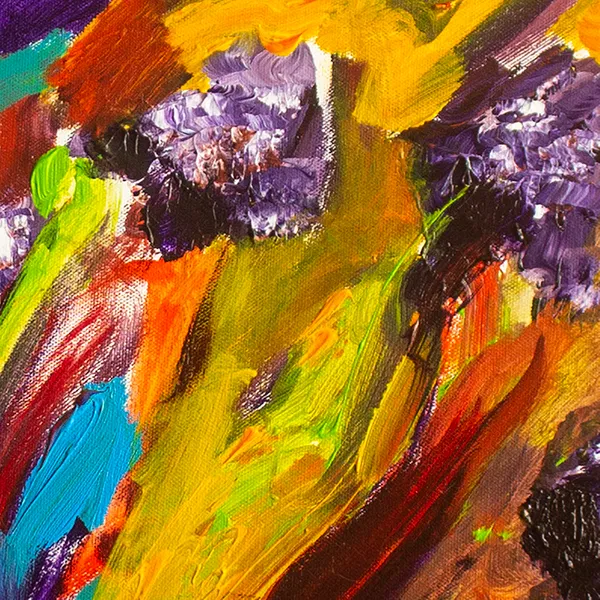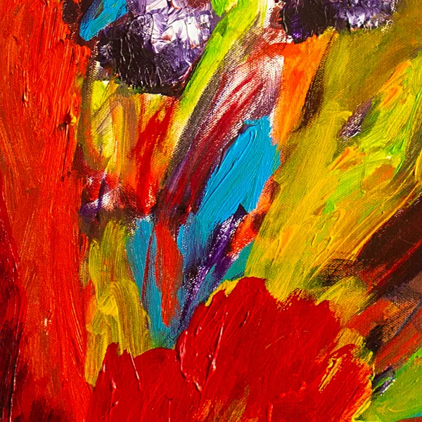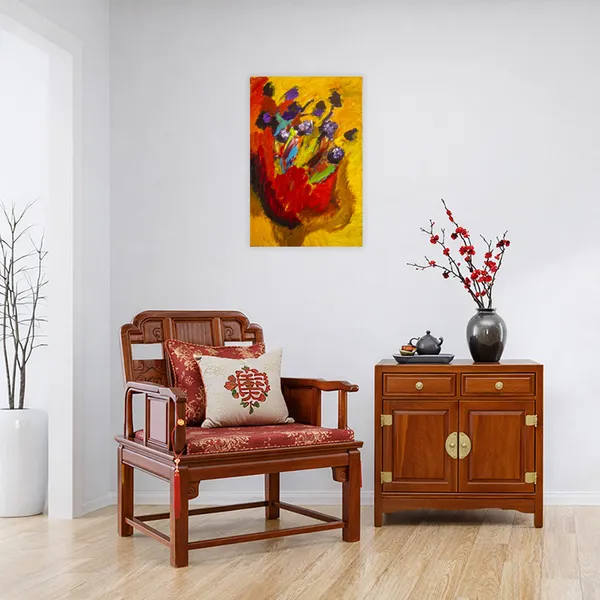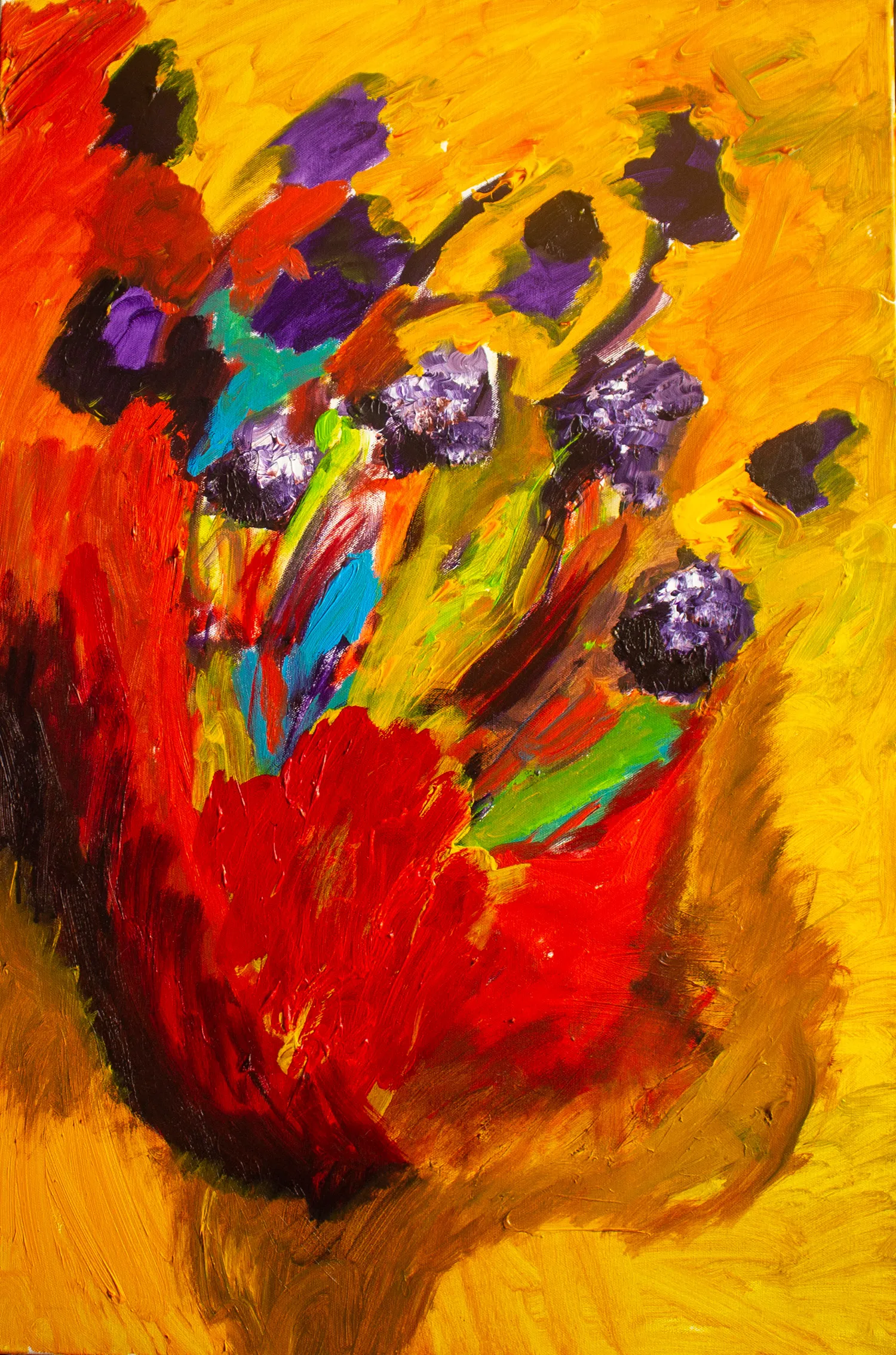 his painting is created through expressive, layered brushstrokes that allow color to bloom and collide organically. Warm yellows and reds form a radiant ground from which floral-like forms emerge in purples, blues, and greens. Influenced by nature and emotional sensation rather than direct observation, the composition captures a fleeting moment of vitality, where movement, color intensity, and gesture convey growth, fragility, and inner resonance.