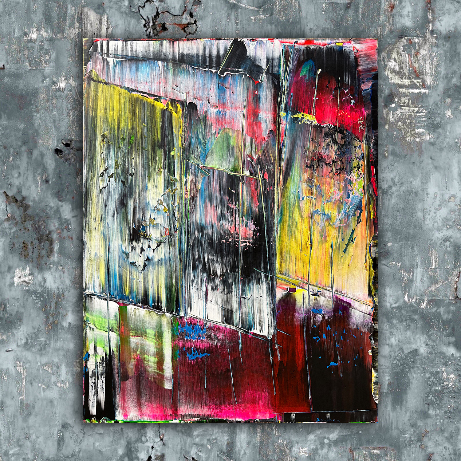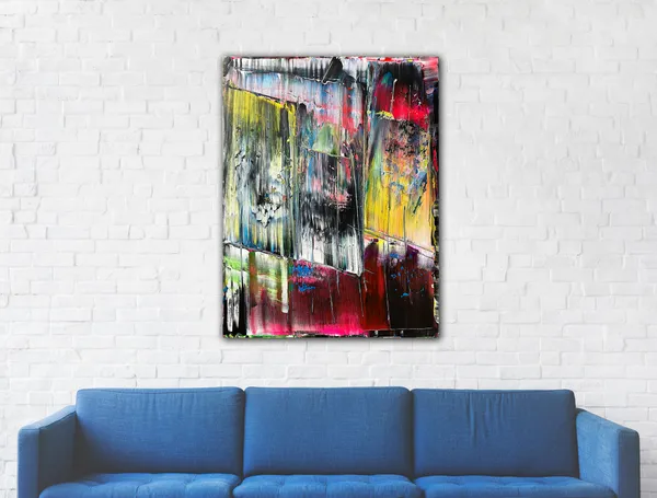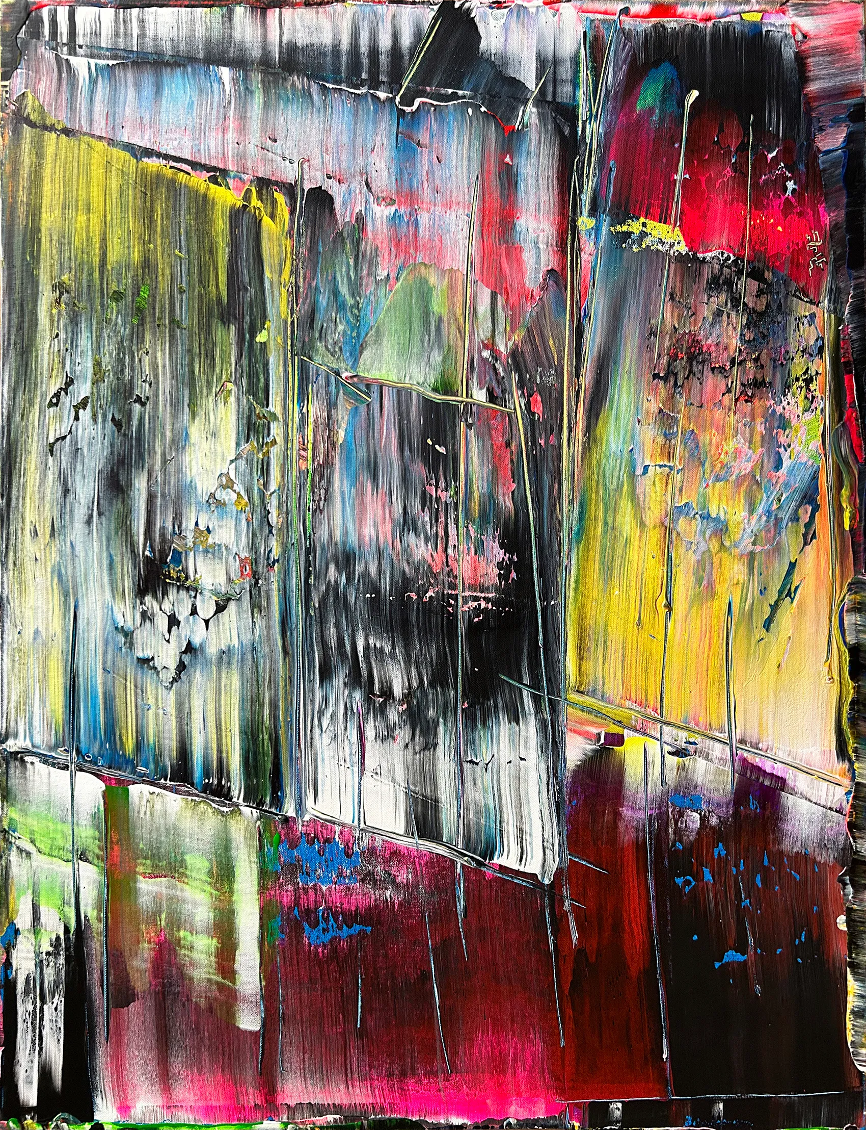 Original PMS Large Abstract Acrylic Painting On Canvas - 30" x 40" This is a unique large modern PMS abstract acrylic painting that will make a statement in your home or office. This painting is mature, bold, deep and emotional. The colors streak and overlap, while also being contrasted by bold, vibrant color shifts. The painting highlights fluorescent yellow, blue, pink, green, red, white and black in a balance of streaking colors and slices of bold and subtle texture.