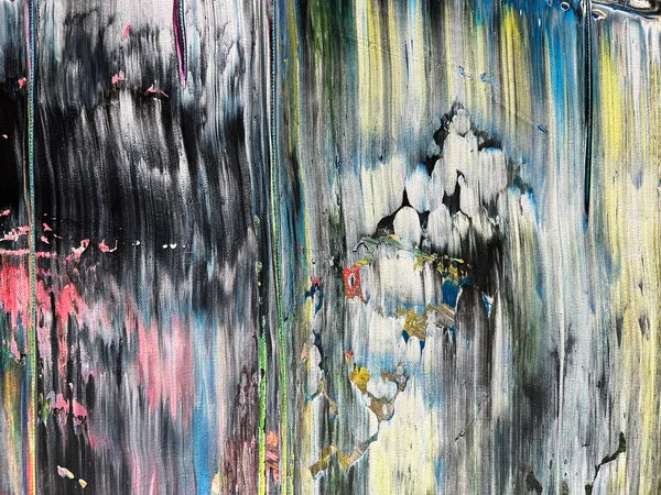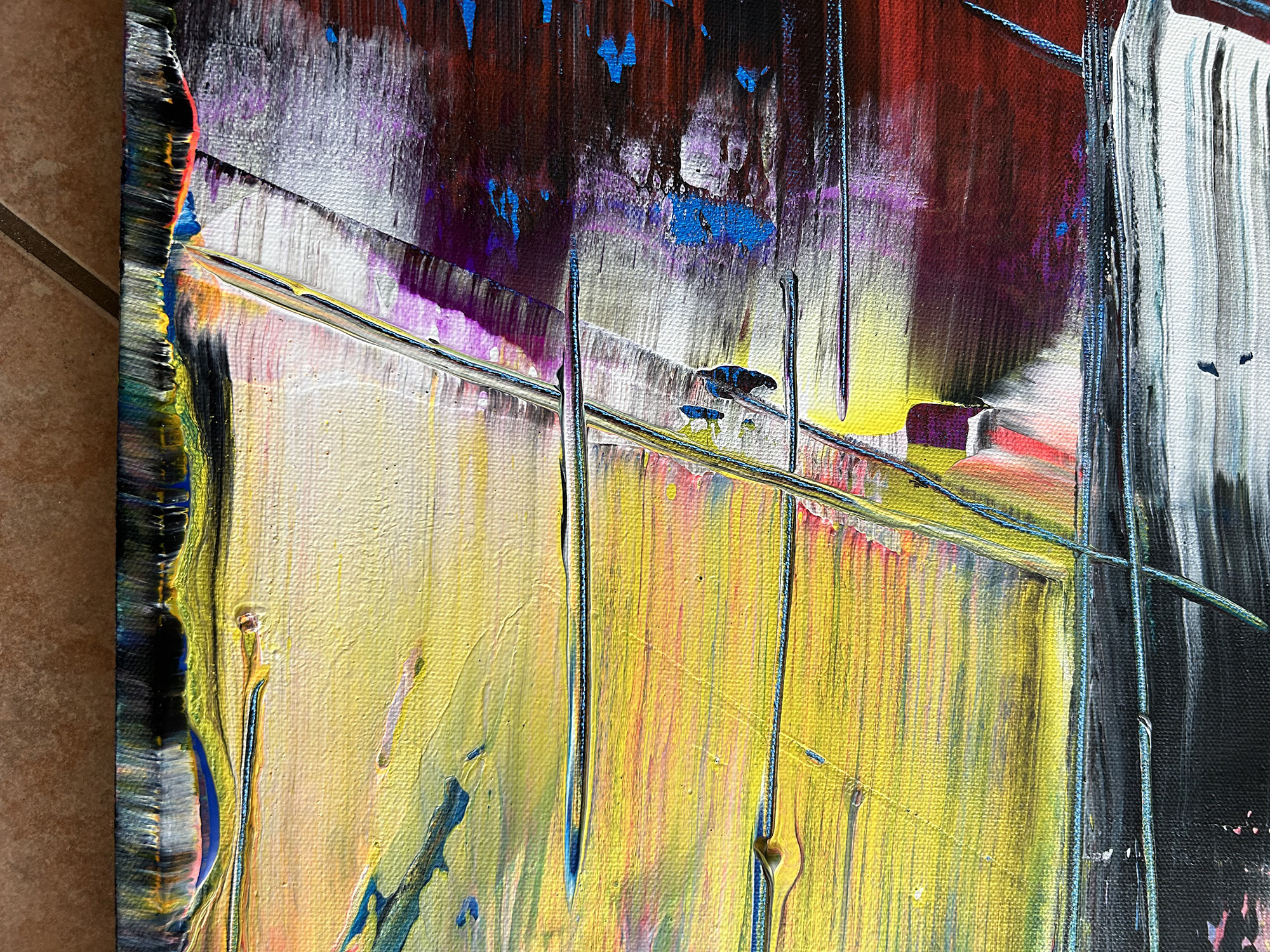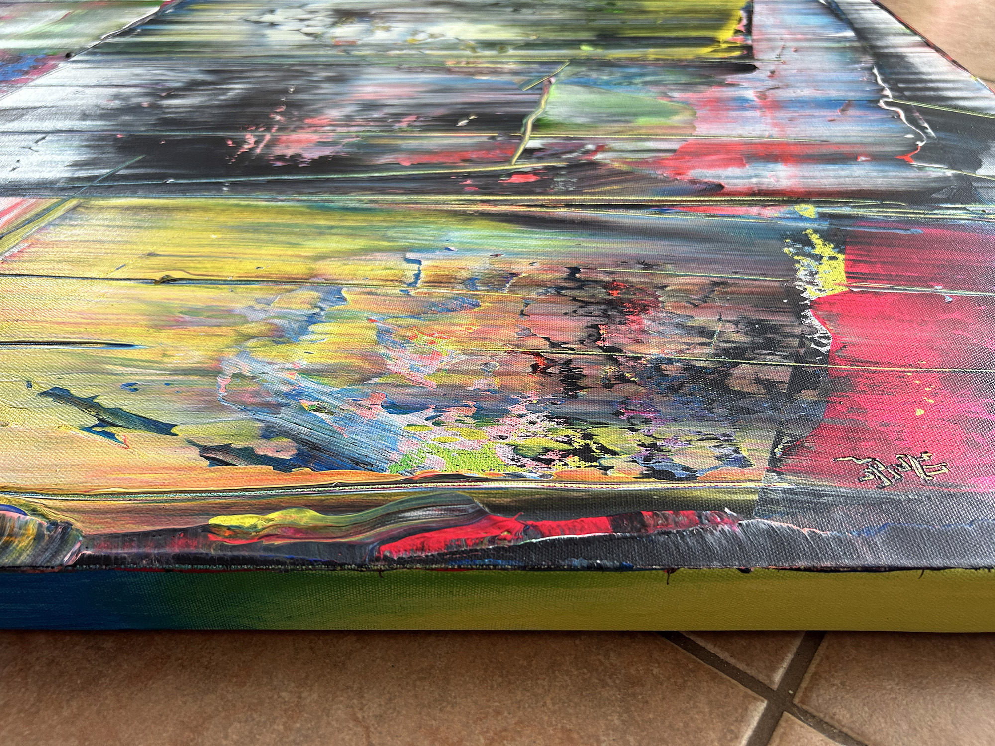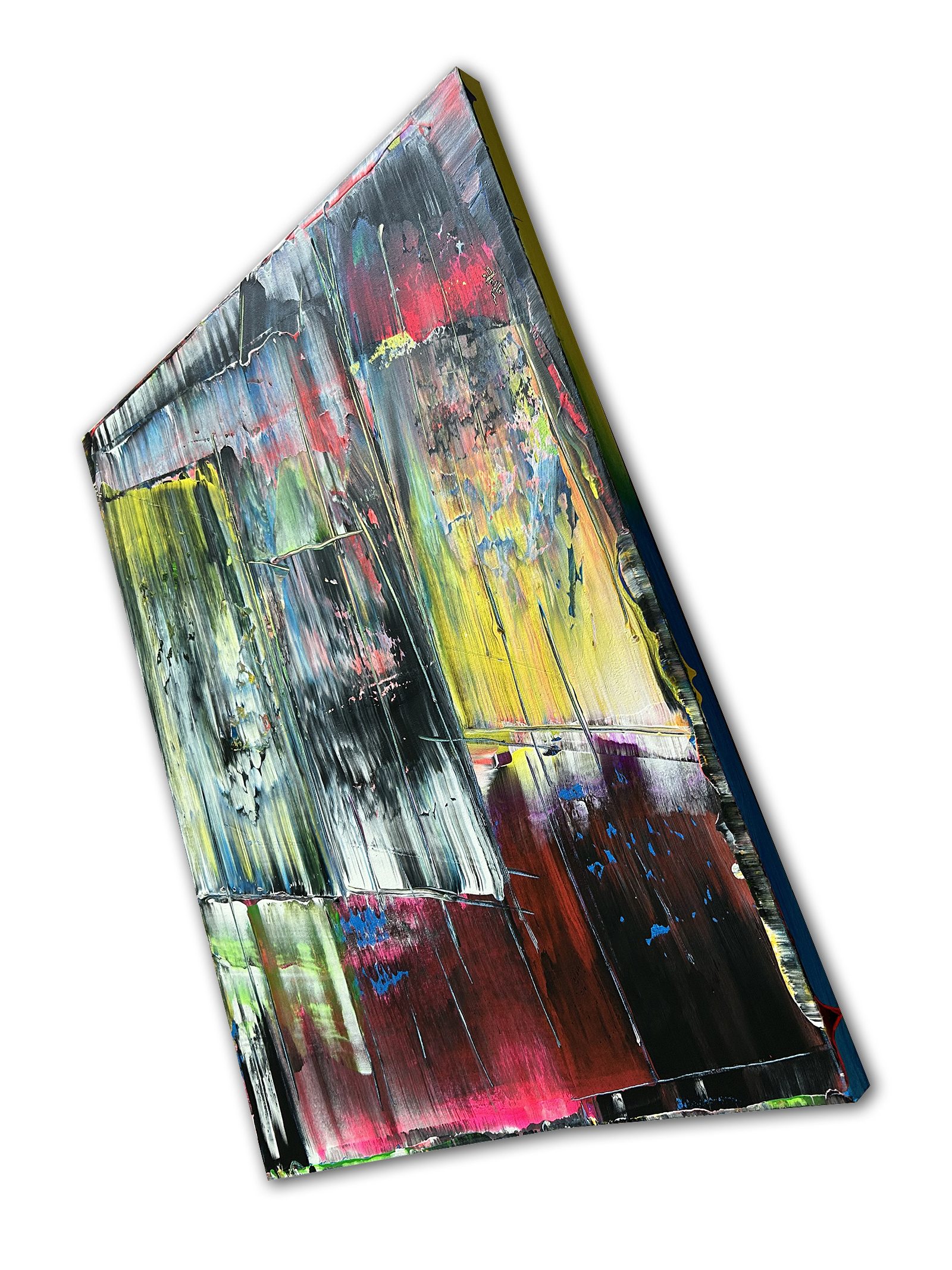 Original PMS Large Abstract Acrylic Painting On Canvas - 30" x 40" This is a unique large modern PMS abstract acrylic painting that will make a statement in your home or office. This painting is mature, bold, deep and emotional. The colors streak and overlap, while also being contrasted by bold, vibrant color shifts. The painting highlights fluorescent yellow, blue, pink, green, red, white and black in a balance of streaking colors and slices of bold and subtle texture.