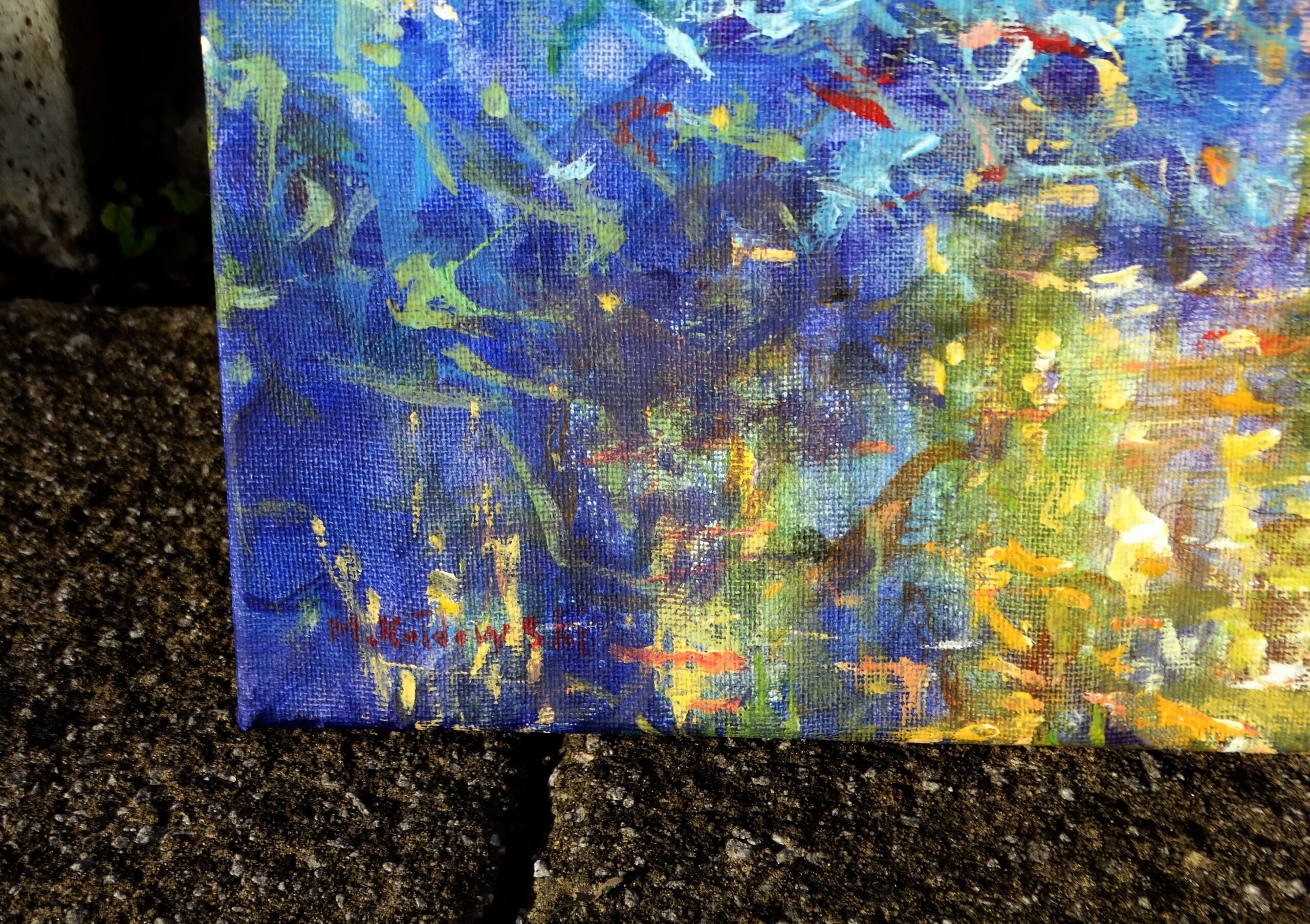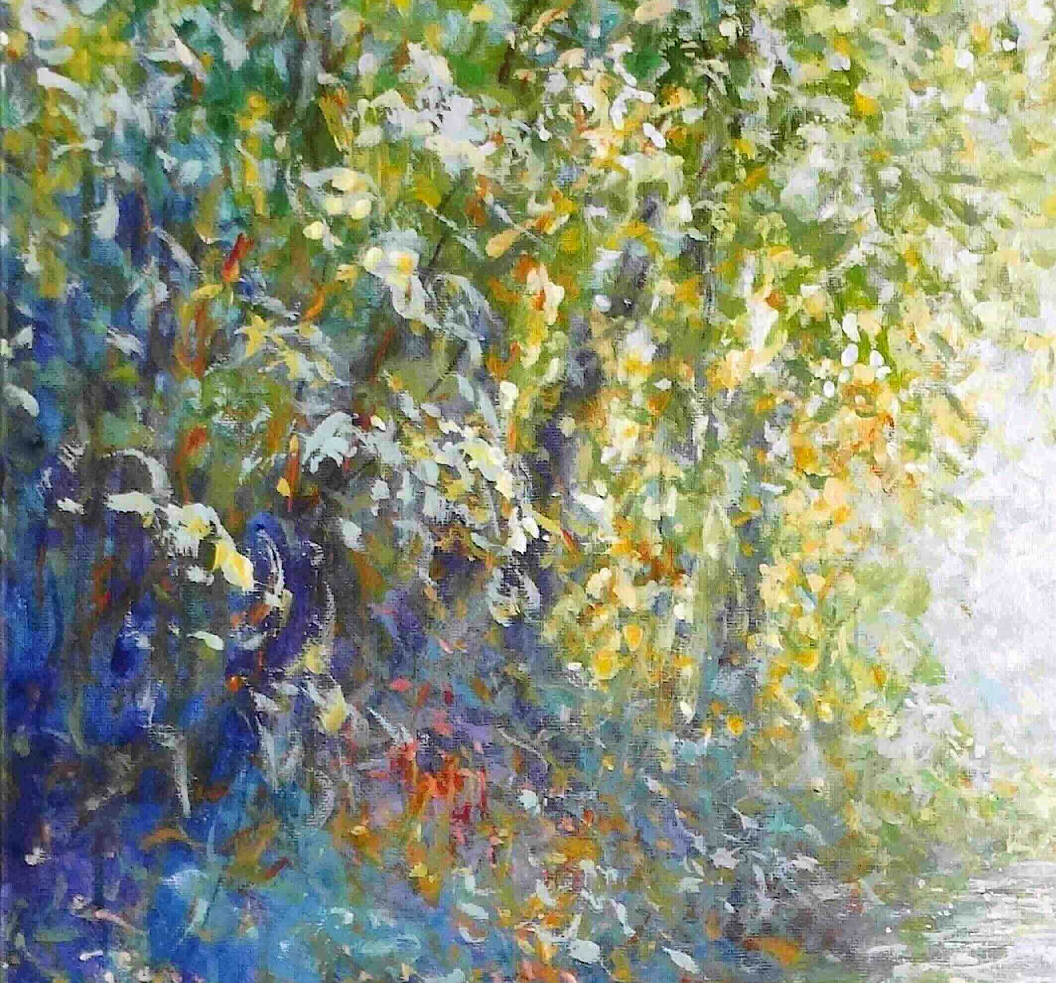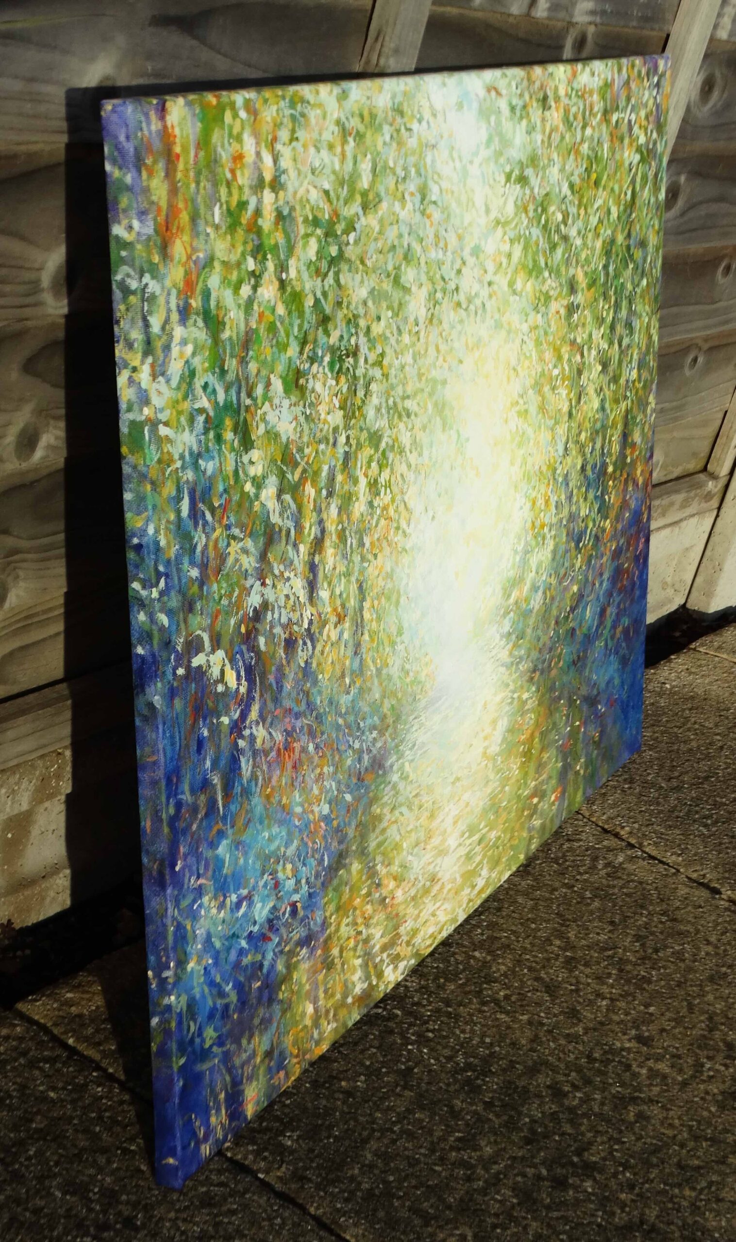 Working in acrylics, I built the foliage with loose, layered strokes—greens, yellows and touches of blue—so the edges stay lively and full of movement. Painting continues round the sides, as shown.