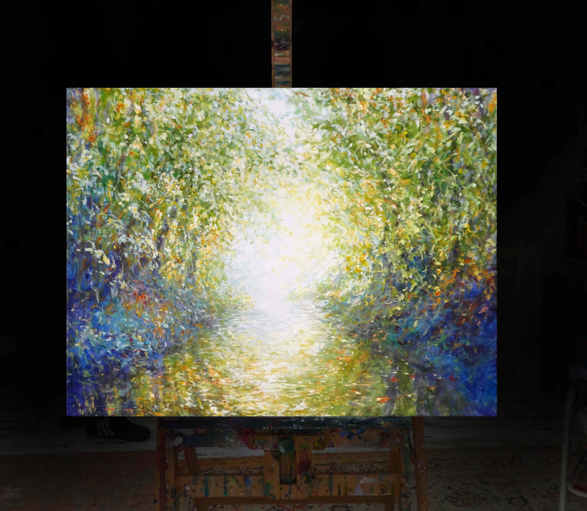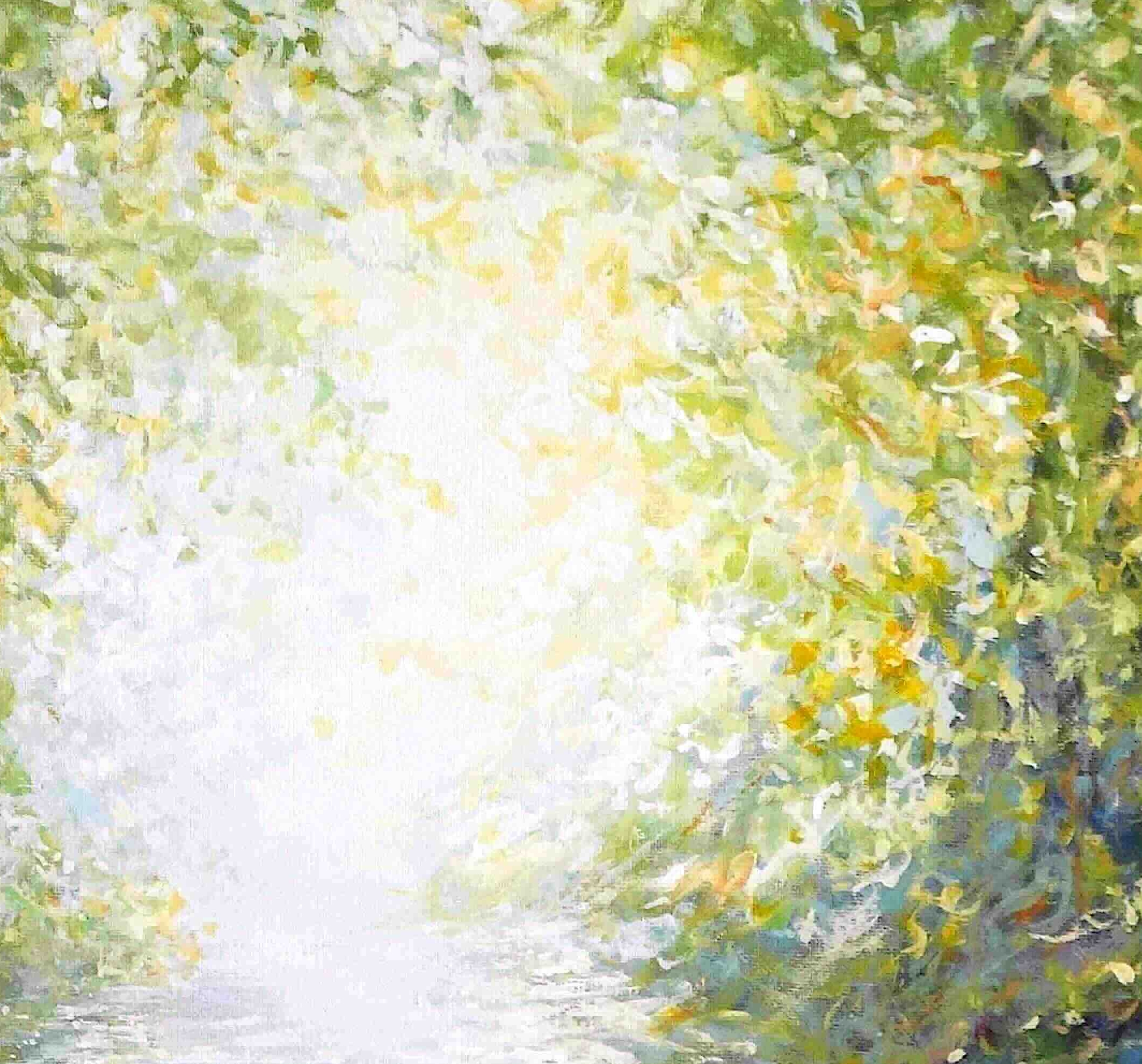 This painting began with the memory of kayaking through a quiet, overgrown forest river where the trees leaned in and created a natural tunnel of light. I wanted to capture that moment when everything narrows into a soft glow ahead, and the world feels peaceful and held.