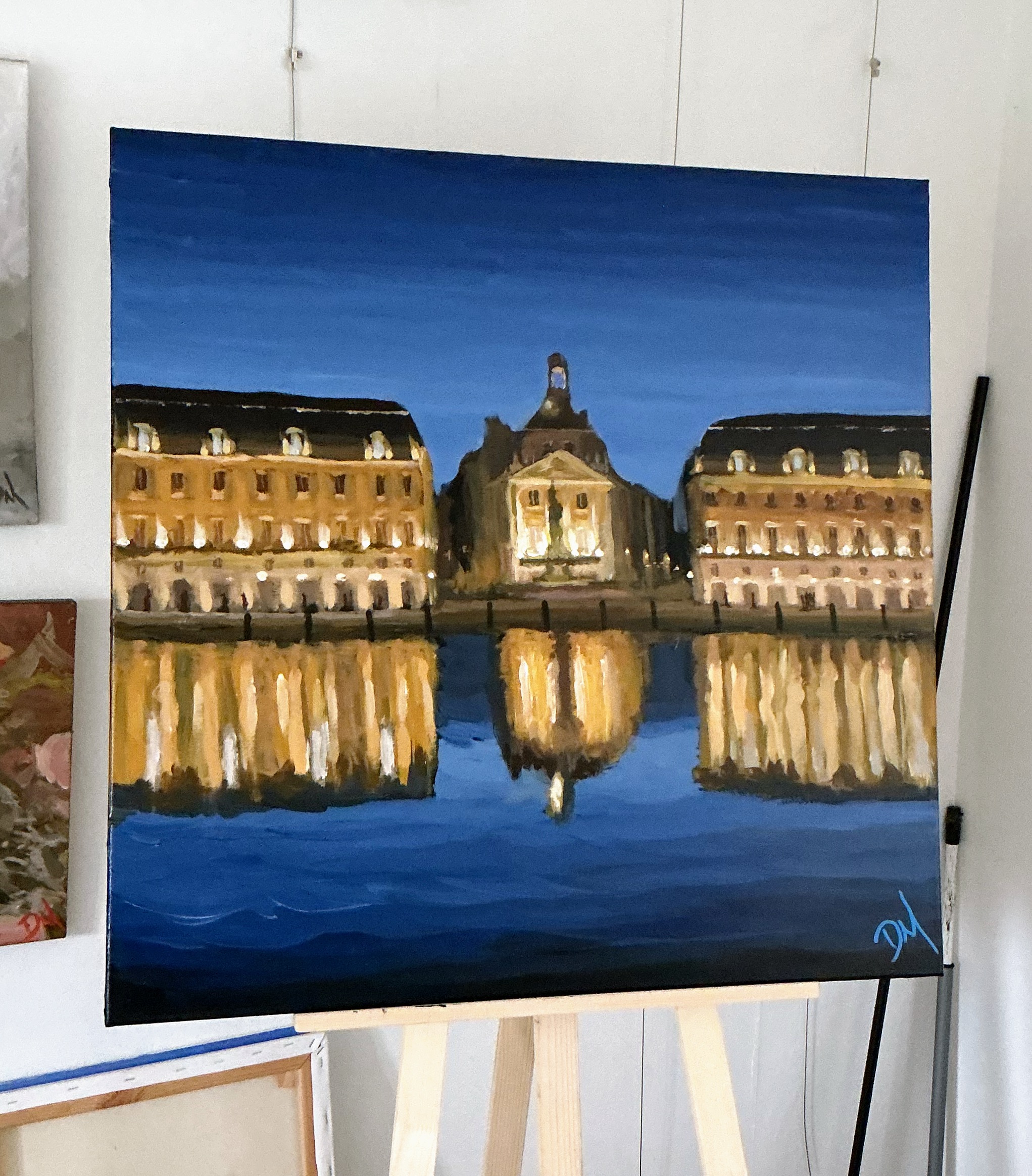 Place de la Bouse reflecting in the miroir d’eau, Bordeaux. Capturing the vibrant glow of city lights reflecting on calm waters, blending impressionism with realism and a hint of abstraction. This acrylic painting invites you to feel the serene yet dynamic energy of evening moments. It will bring warmth, elegance, and a sense of peaceful reflection to your space, turning any room into a gateway to timeless beauty and quiet wonder.