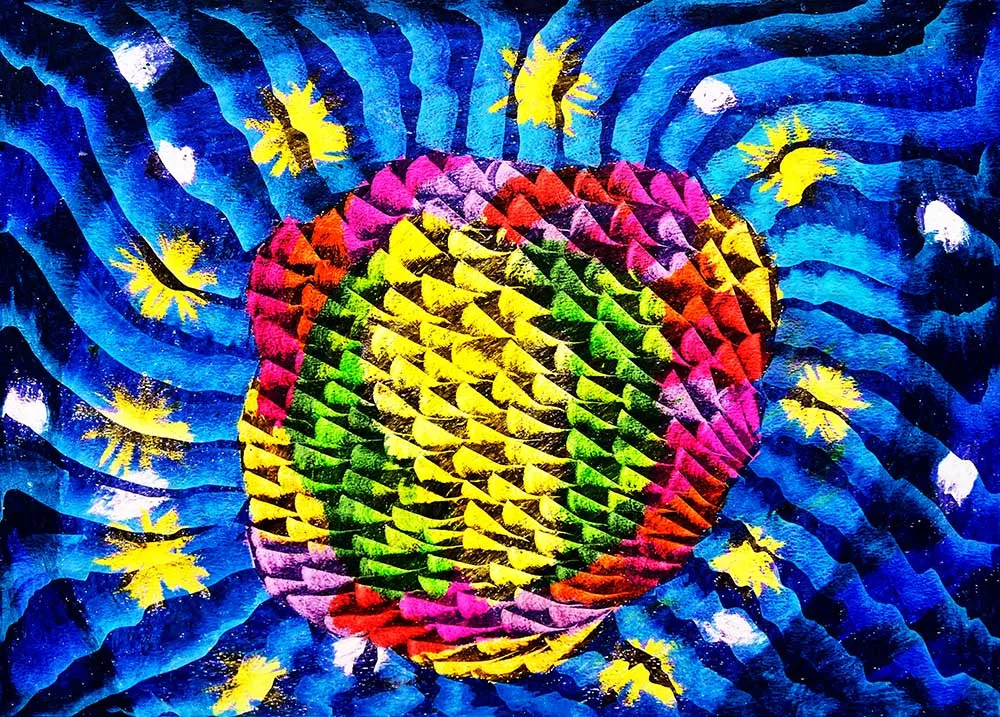 The harmonious complexity invites a sense of perpetual movement in a vivid abstraction.
