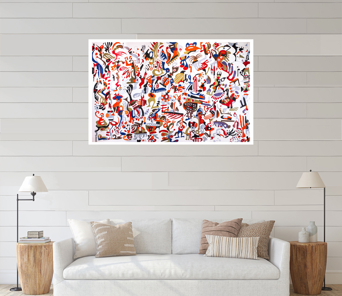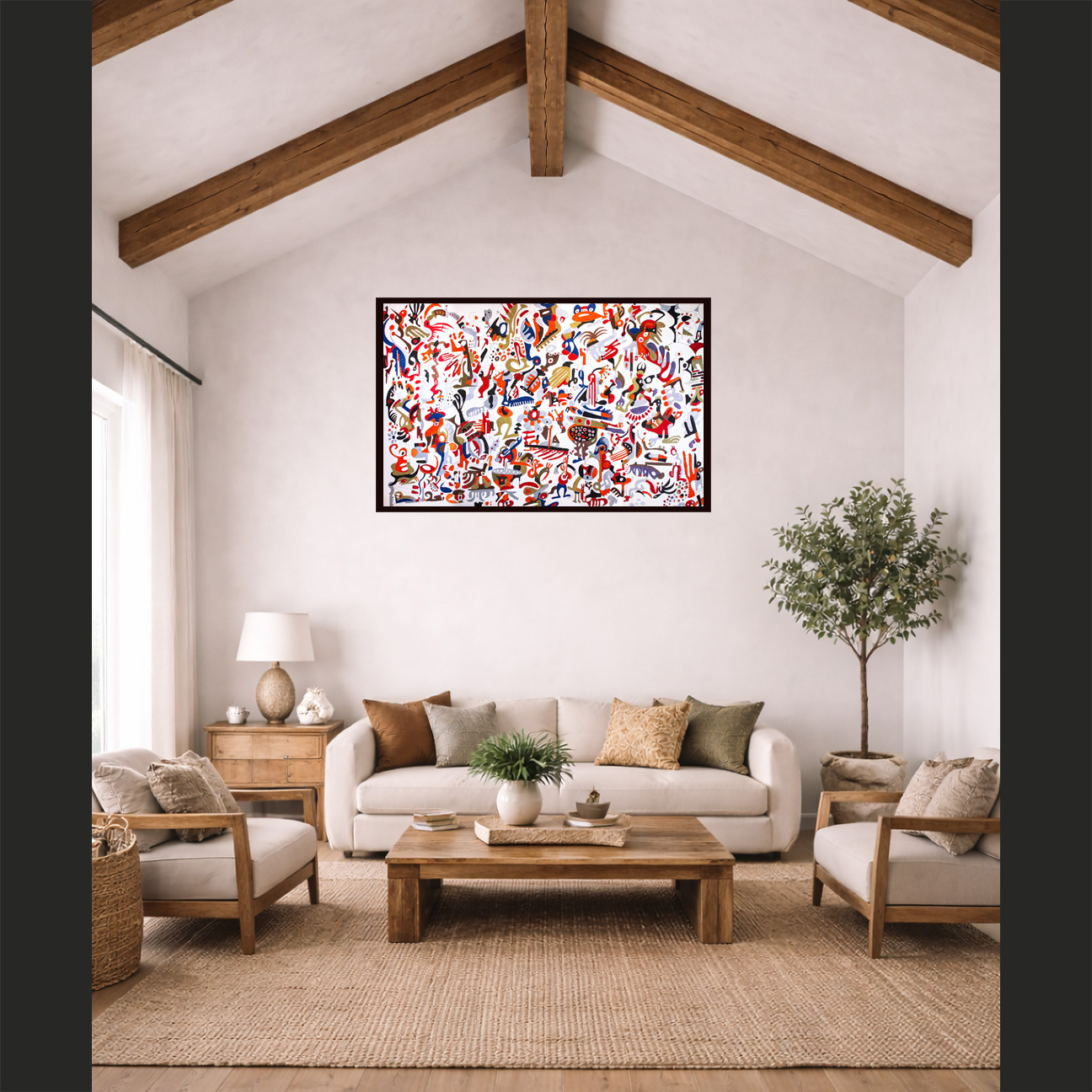 A visual symphony of chaos and myth, Princess with Horns explores feminine power through a maze of intertwined figures and cryptic creatures. Influenced by tribal masks and ancient symbolism, I used oil markers on canvas with bold, layered lines and a restricted palette to create rhythm and tension. The horns evoke strength, transformation, and animal instinct. This painting is framed but can be unstretched and sent in a tube. The shipping costs would be much cheaper.