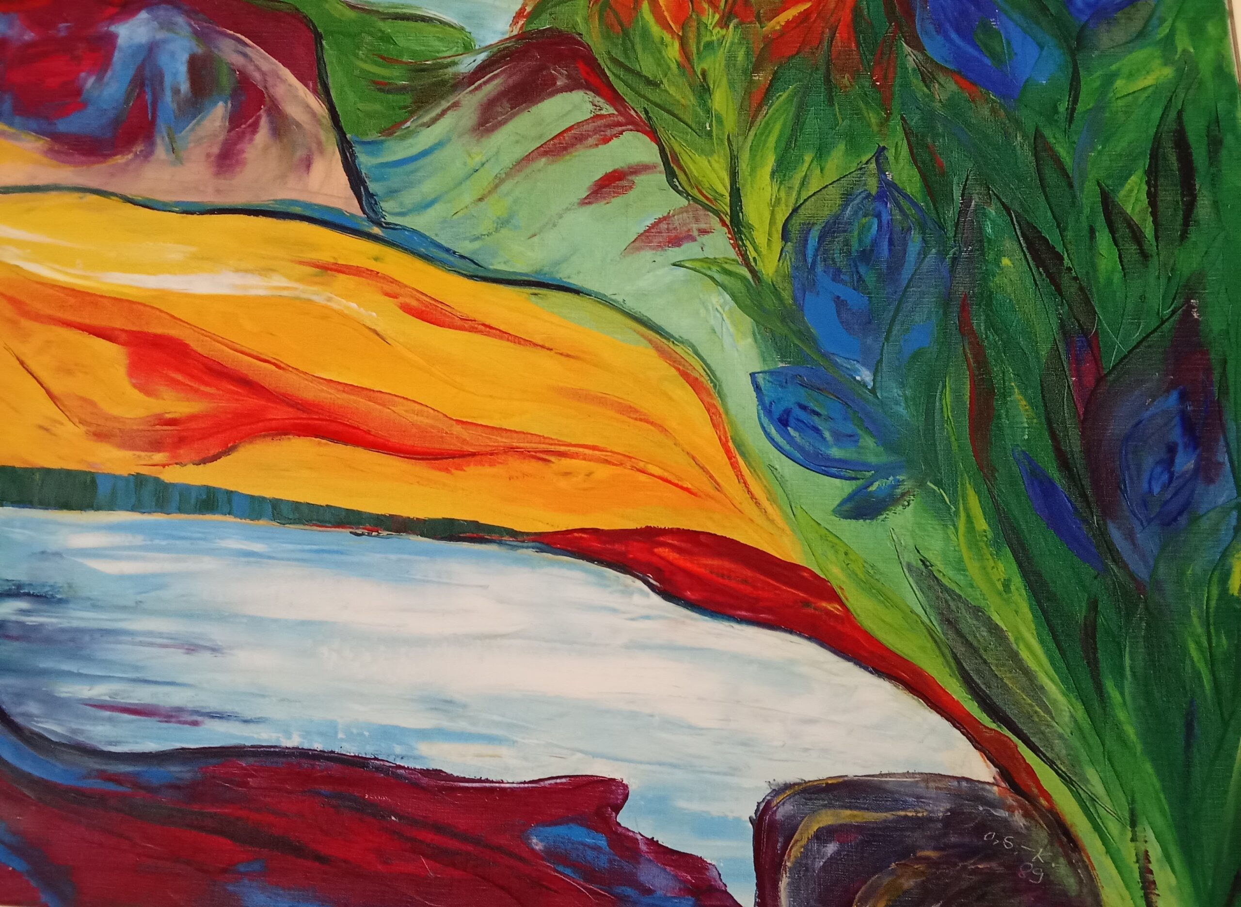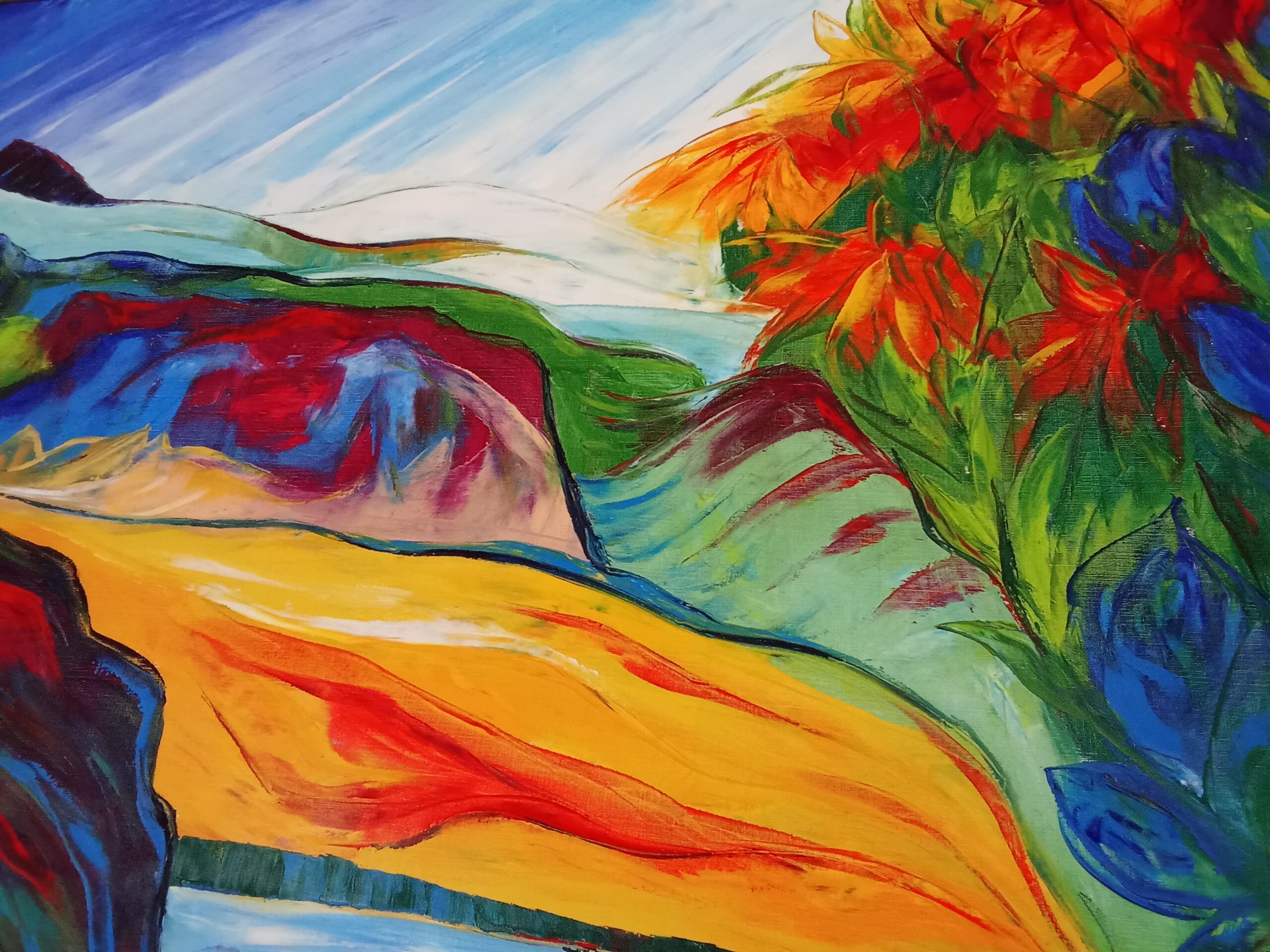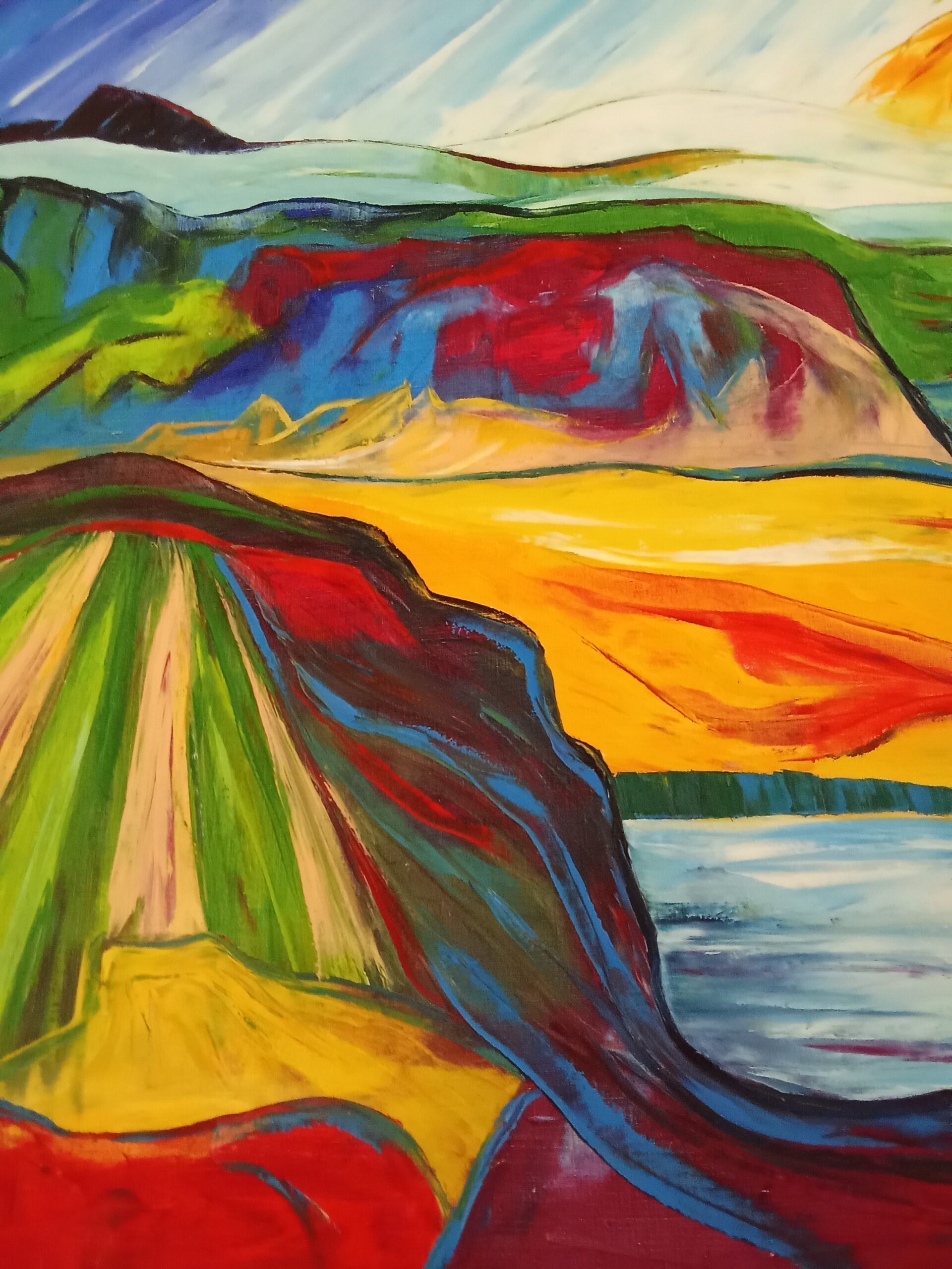 Dans cette œuvre j'ai cherché à capturer l'énergie vibrante et les couleurs éclatantes de la nature, en utilisant l'huile et une approche expressive semi-abstraite. Les vagues de couleurs audacieuses, les champs en floraison et le ciel dynamique s'entremêlent pour évoquer la beauté pure et la tranquilité rustique.