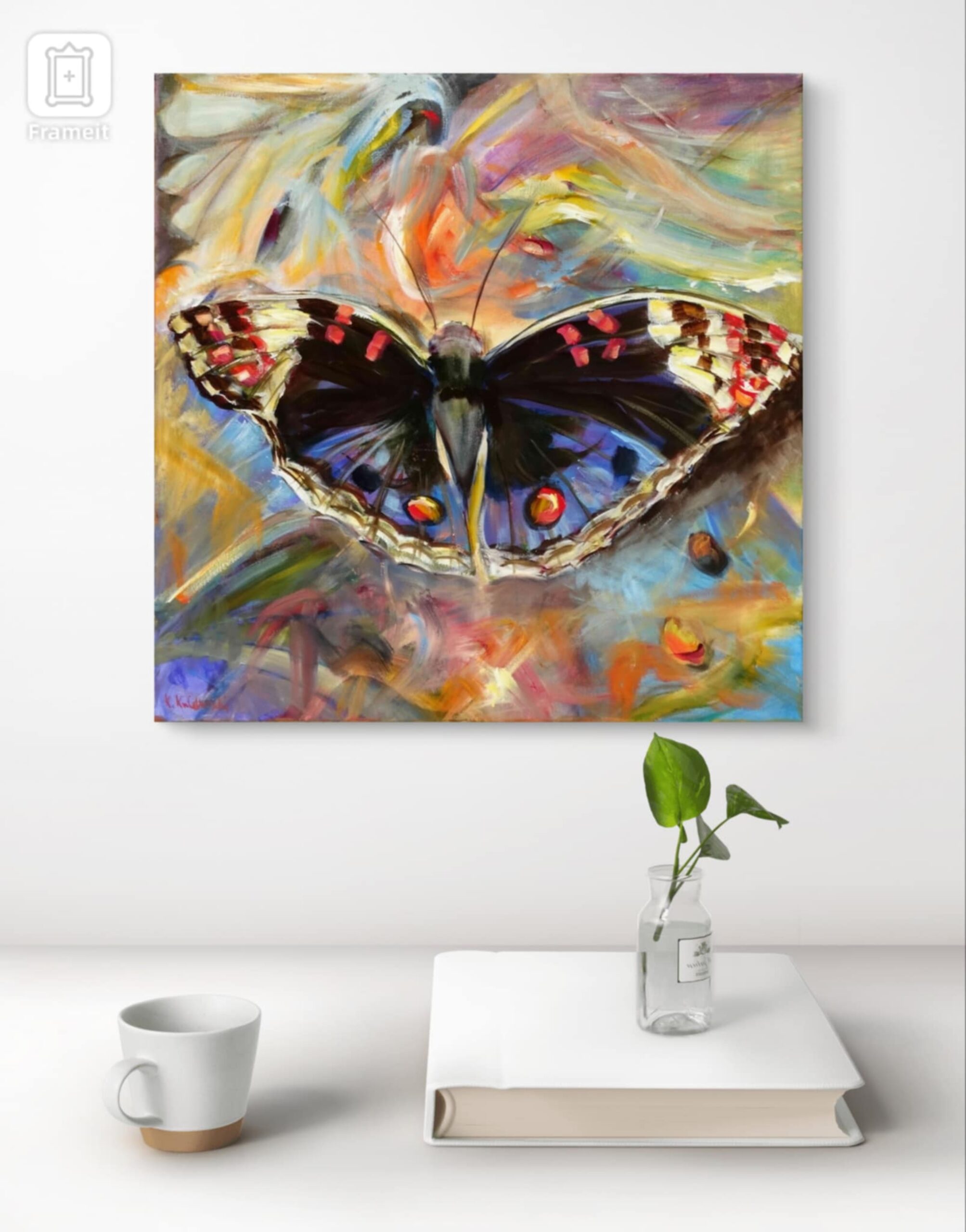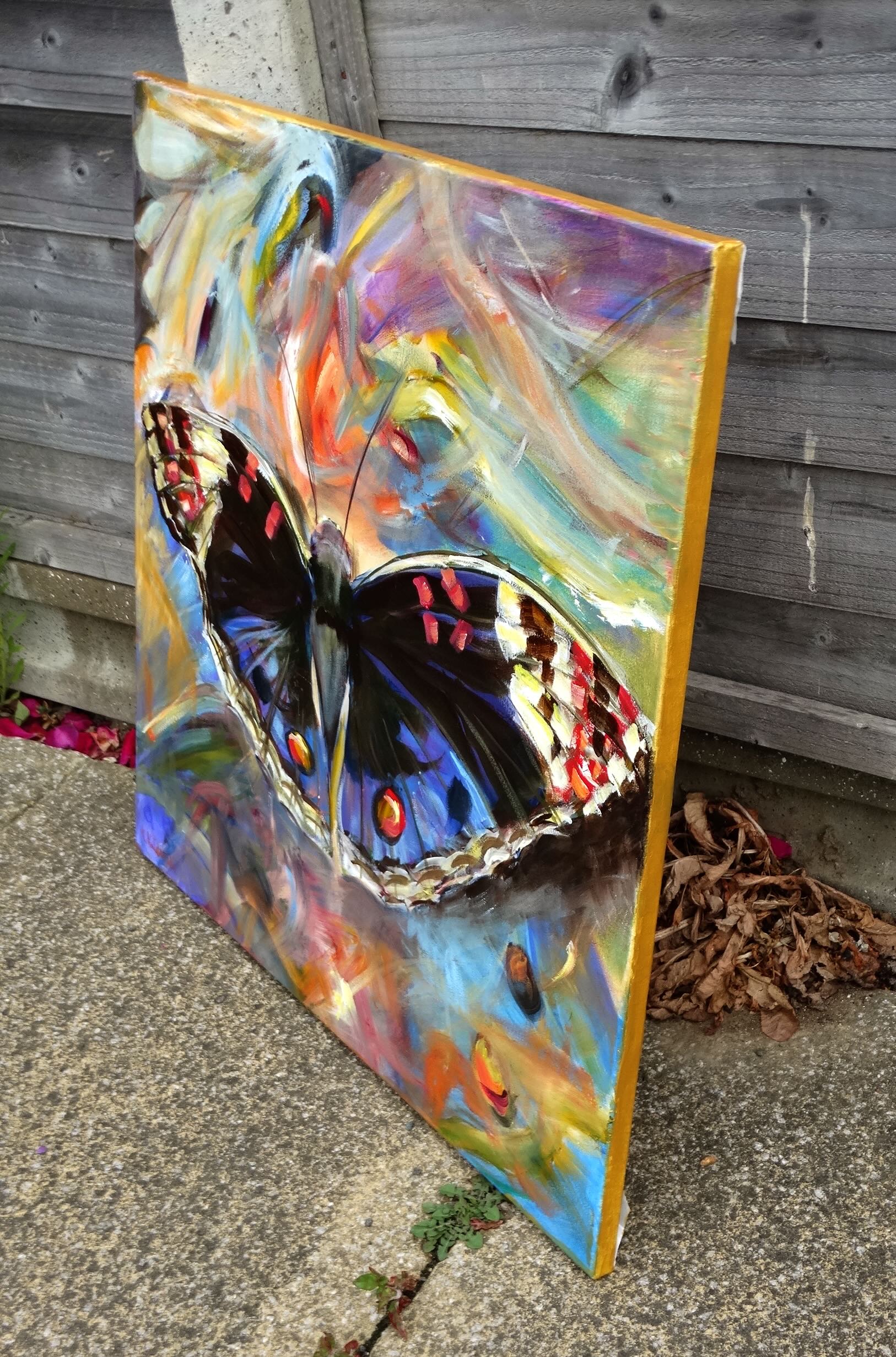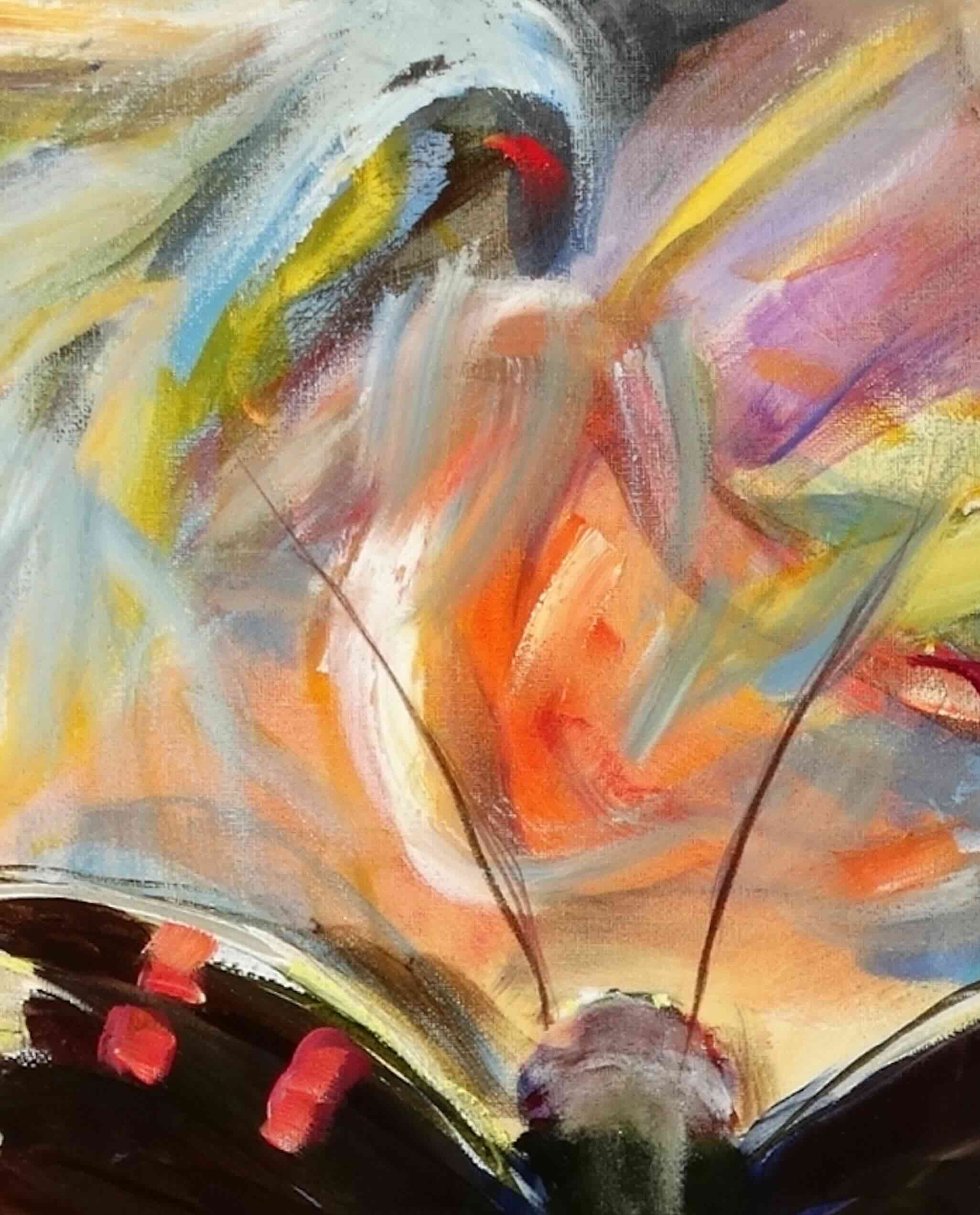 In this painting, I sought to capture the ephemeral beauty of a butterfly amidst a whirlwind of vibrant, chaotic colors. The expressionistic strokes and vivid palette evoke a sense of movement and transformation, symbolizing life's fleeting moments. It mirrors the dance of change and the beauty of resilience. This piece will infuse any space with a dynamic, uplifting spirit, encouraging viewers to embrace change with grace.