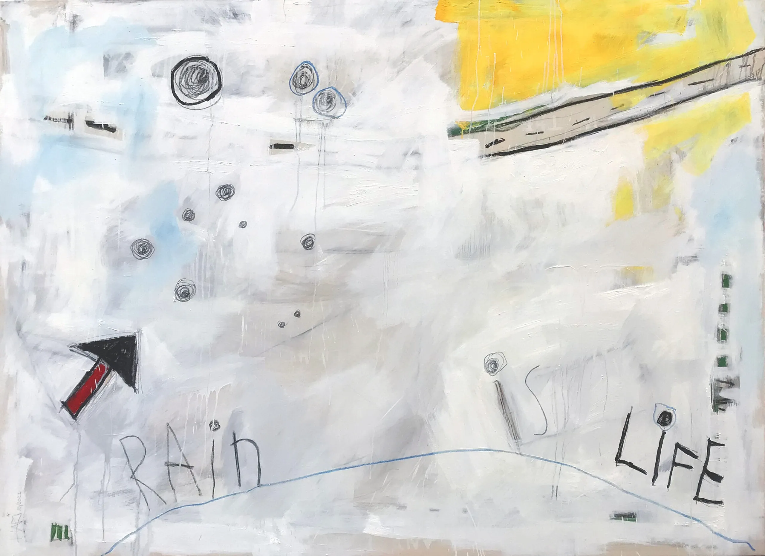 Regen ist Leben. Ohne Wasser, das unter anderem auch vom Himmel fällt, wird es kein und kann es kein Leben geben. Der Klimawandel zeigt uns mittlerweile auf dramatische Art und Weise wohin die Menschheit sich entwickelt hat. Wir sind auf dem besten Wege den Planeten Erde unbewohnbar zu machen. RAIN IS LIFE. Ein XXL-Format gemalt mit Ölfarben auf Leinwand und expressivem Pinselduktus