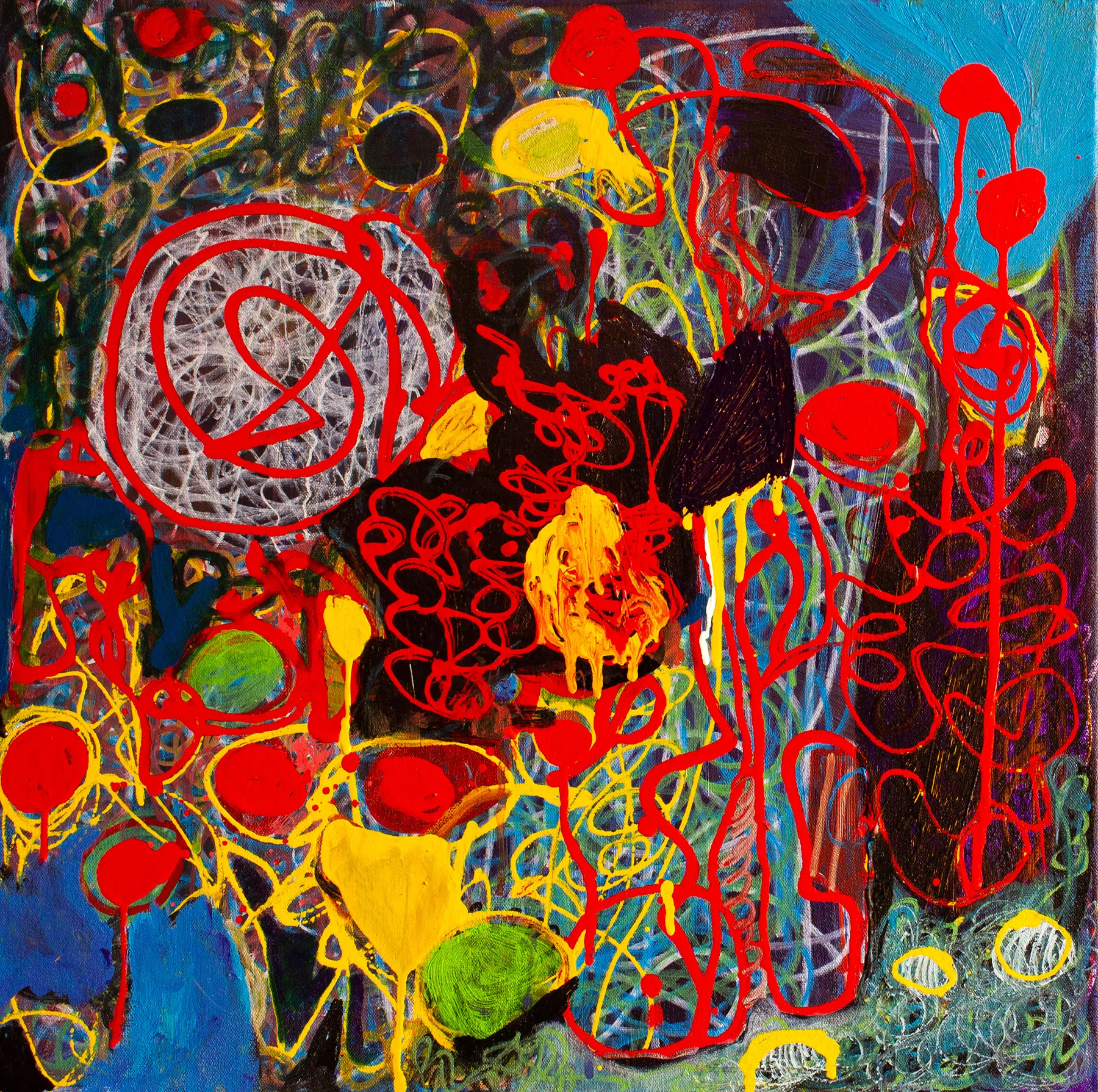 This painting is driven by raw, instinctive gesture, with aggressive red lines layered over dense fields of color and scribbled textures. Circular forms, drips, and marks collide, creating a charged surface that feels both chaotic and intentional. Influenced by emotional release, automatic drawing, and inner turbulence, the process embraces excess and repetition, allowing tension, urgency, and rhythm to surface through physical engagement with paint rather than controlled composition.